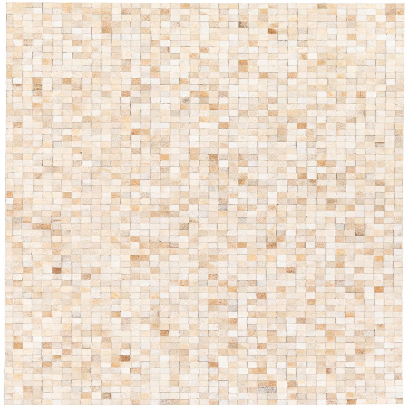 A 5x8 rectangular Cowhide Stocks rug in ivory and cream, featuring a modern patchwork of small, square cowhide pieces.