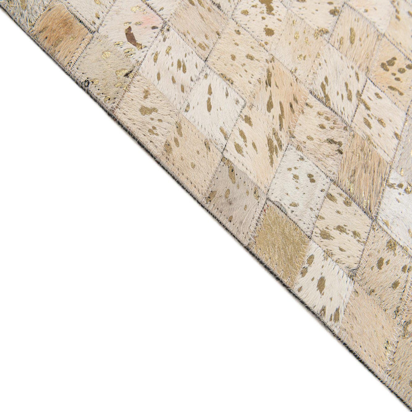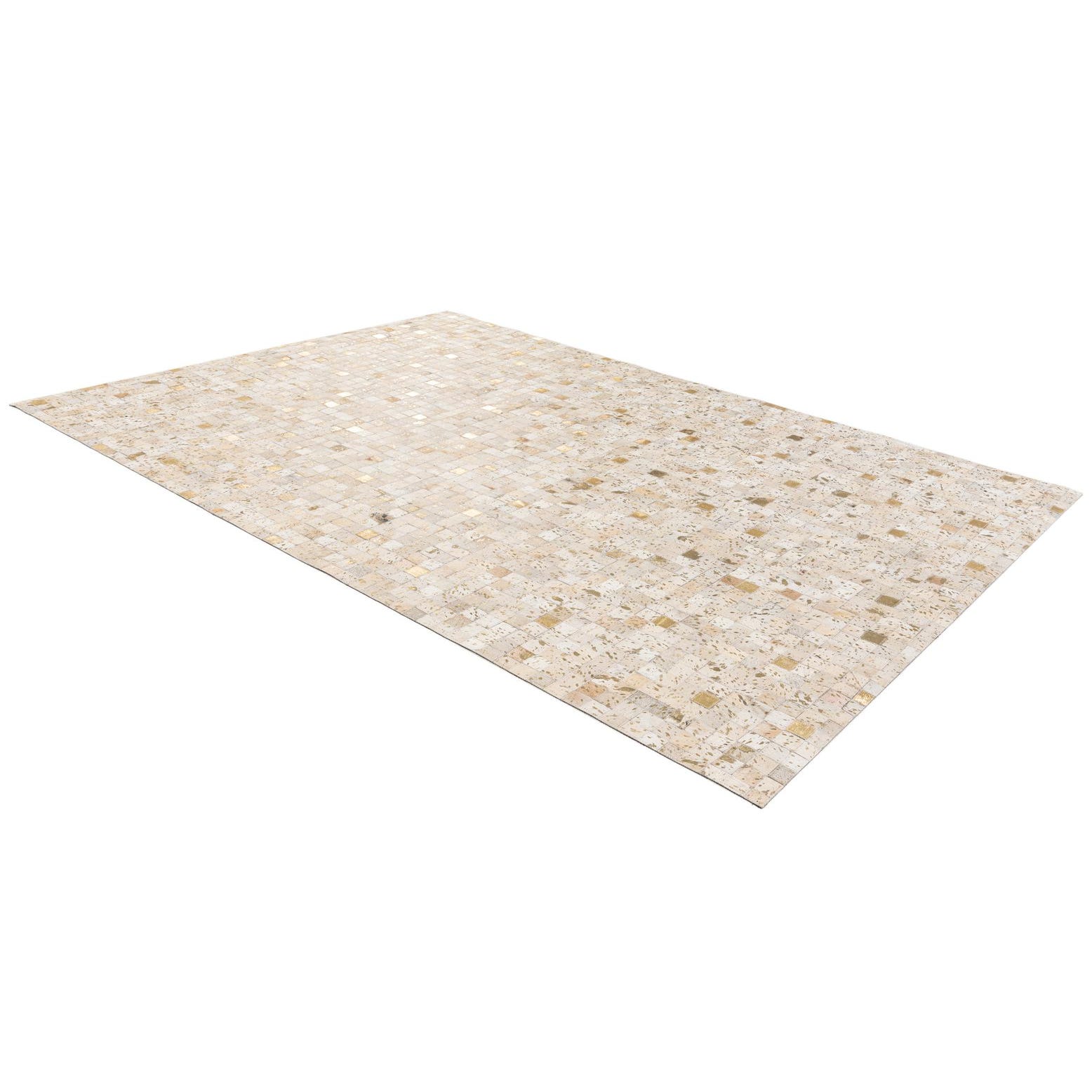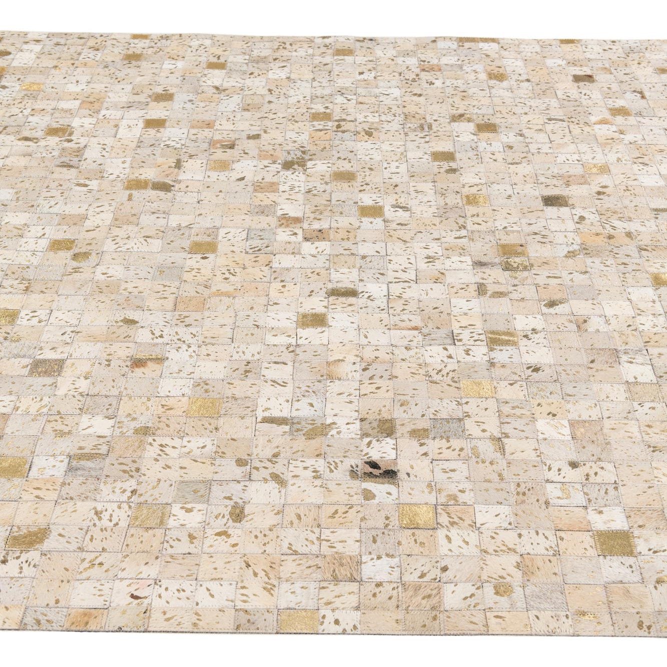 A 5x8 rectangular Cowhide Stocks rug in ivories and creams, featuring a modern patchwork design, ideal for a living room.