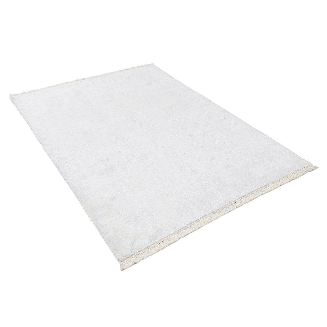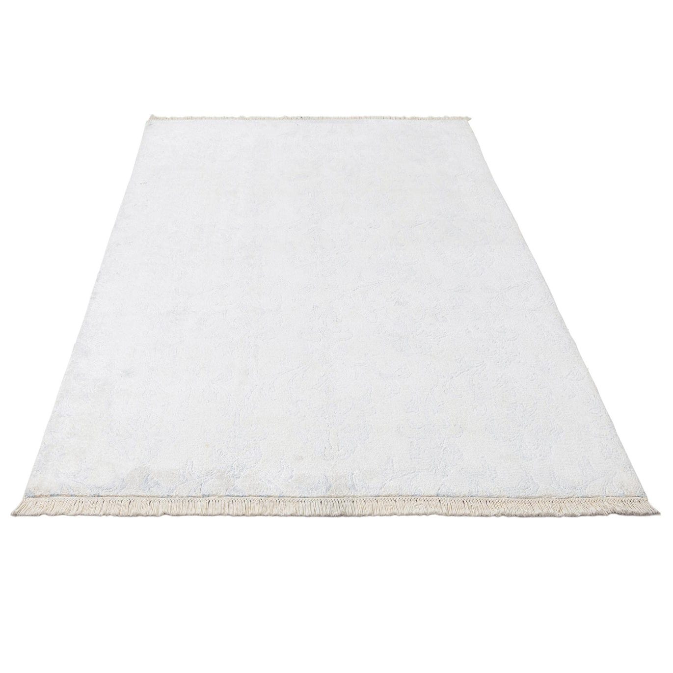 A 5x8 rectangular ivory area rug with a subtle light blue Persian-inspired pattern and fringed ends.