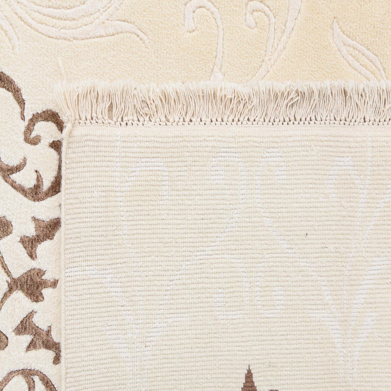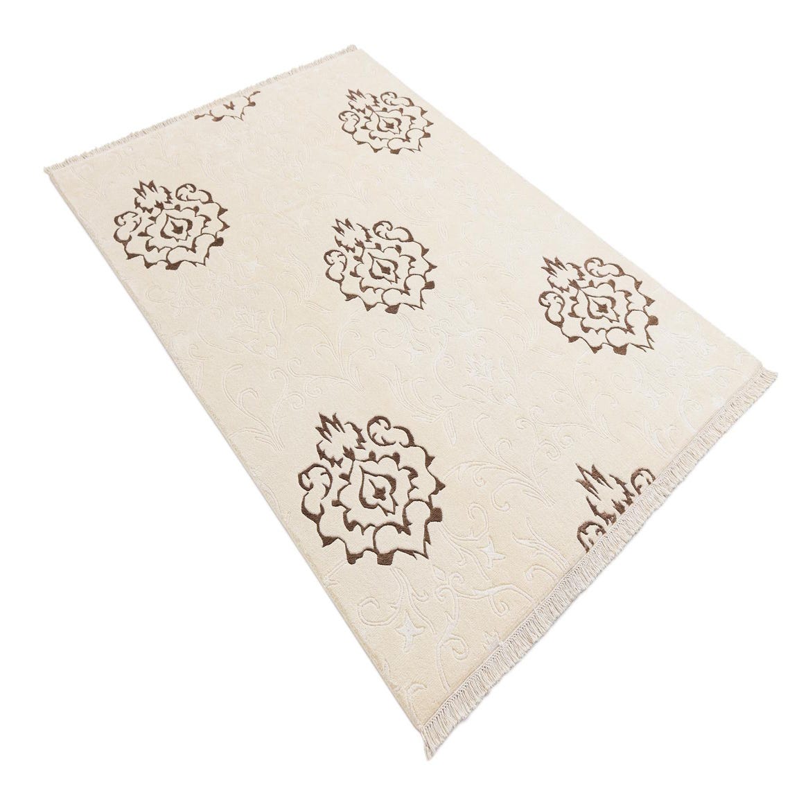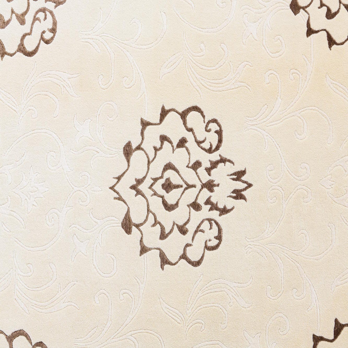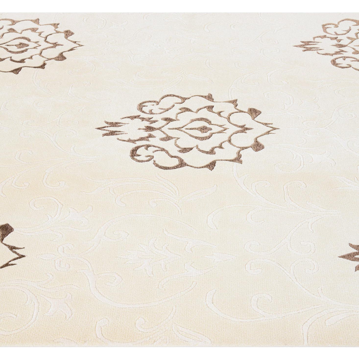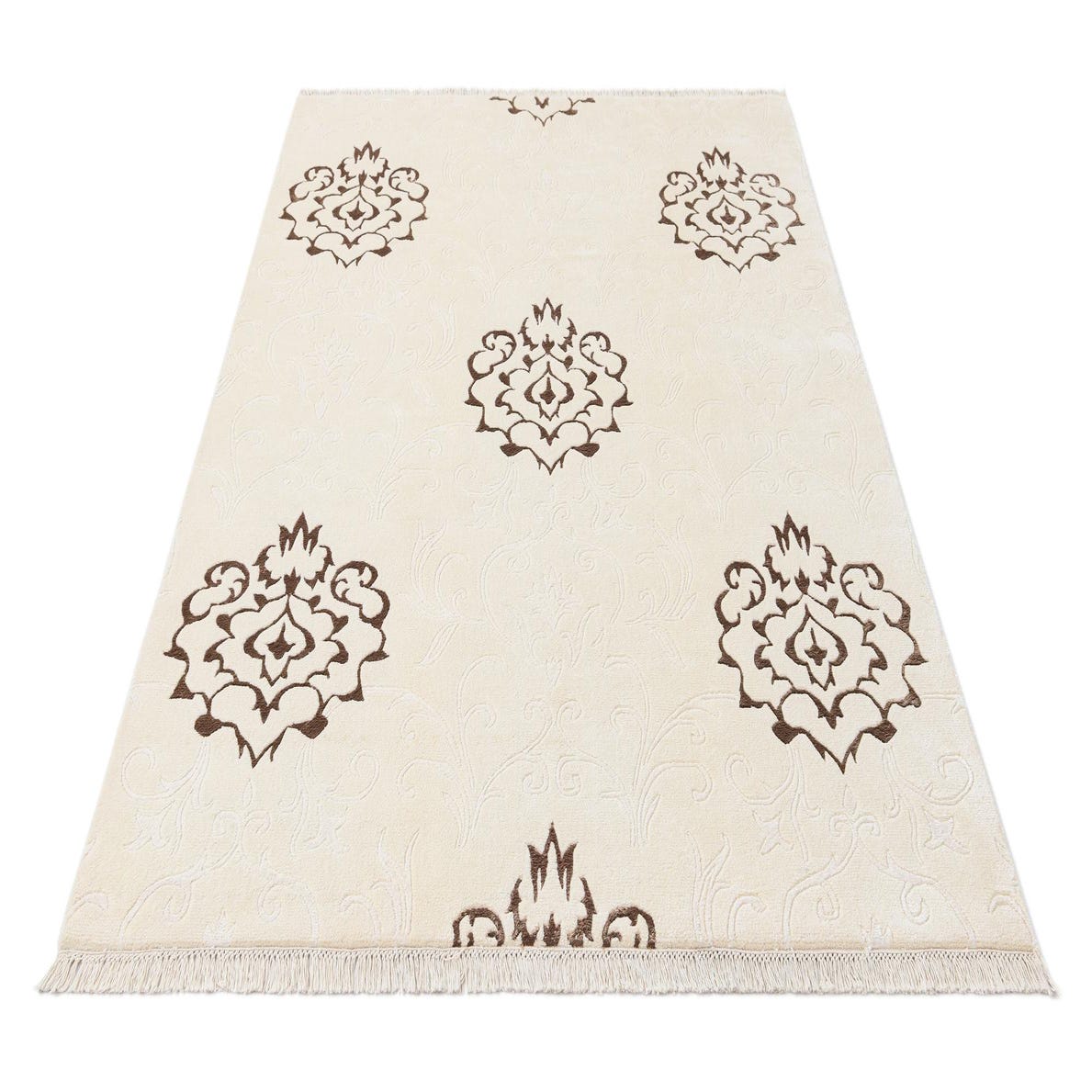 The Darya collection presents a 5x8 hand-made rug crafted from a blend of wool and cotton, promising a durable and comfortable underfoot experience. This rug features an elegant cream background adorned with a traditional pattern in a harmonious palette of beige and brown. The design integrates stylized damask motifs, each intricately defined to add depth and visual interest to the piece.