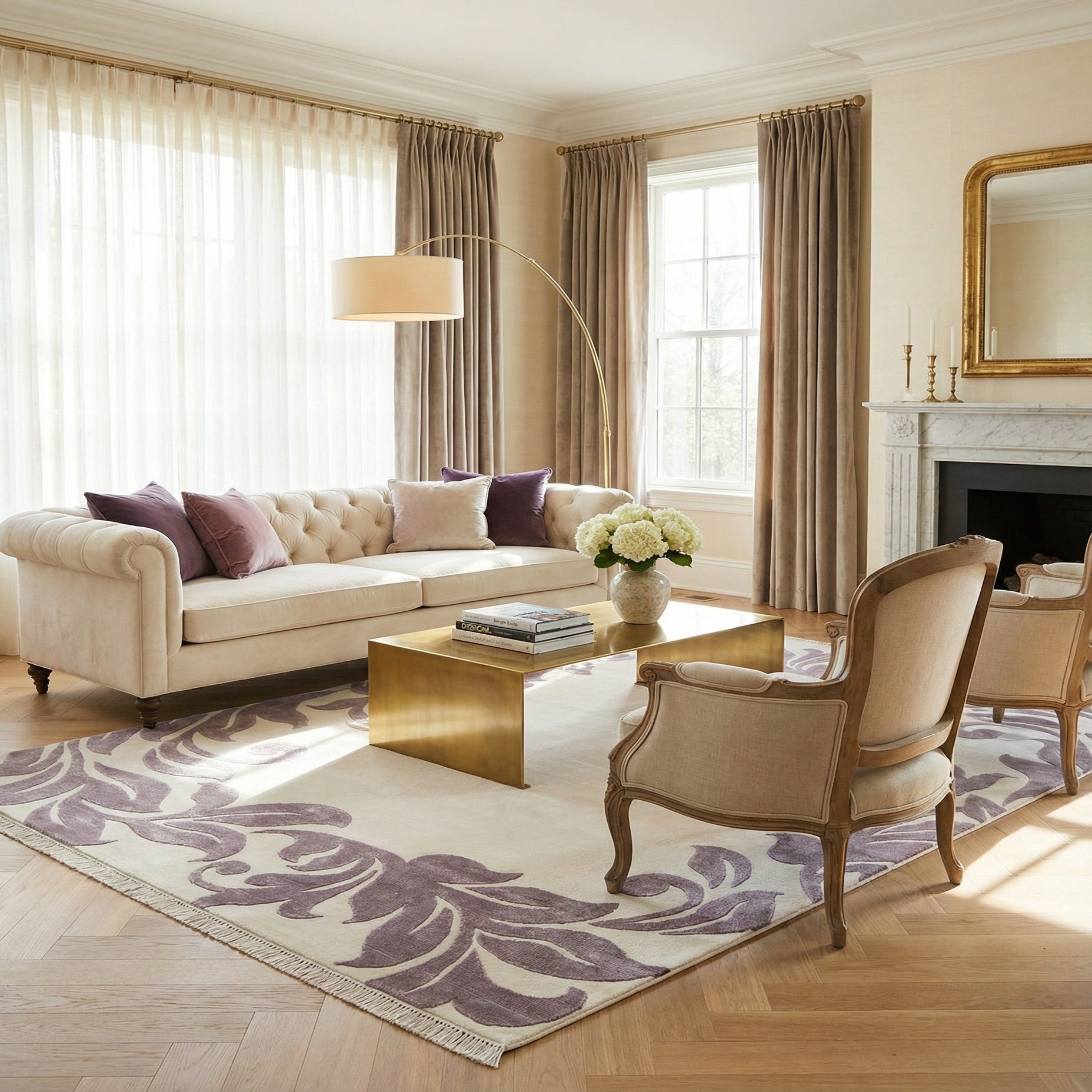 A 5x8 rectangular ivory rug with a modern Persian-inspired lilac floral border design, suitable for a living room.