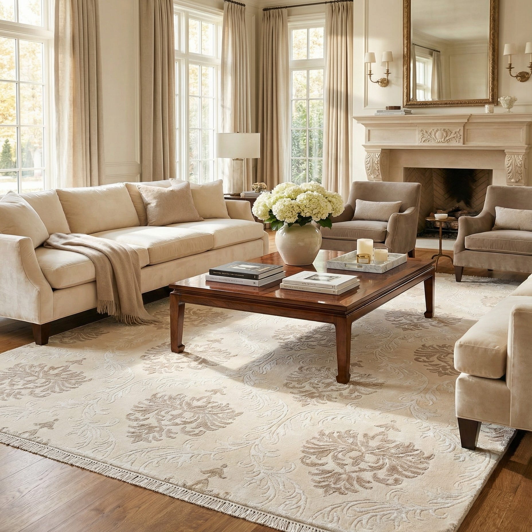 The Darya collection presents a 5x8 hand-knotted wool rug that offers subtle elegance with its cream background and complementary palette of beige, light brown, and tan. Its symmetrical pattern exhibits a series of intricate motifs reminiscent of classic damask, providing both visual interest and harmonious balance. The texture is a testament to the craftsmanship of hand knotting, giving this piece a tactile dimension that is inviting to both touch and sight.