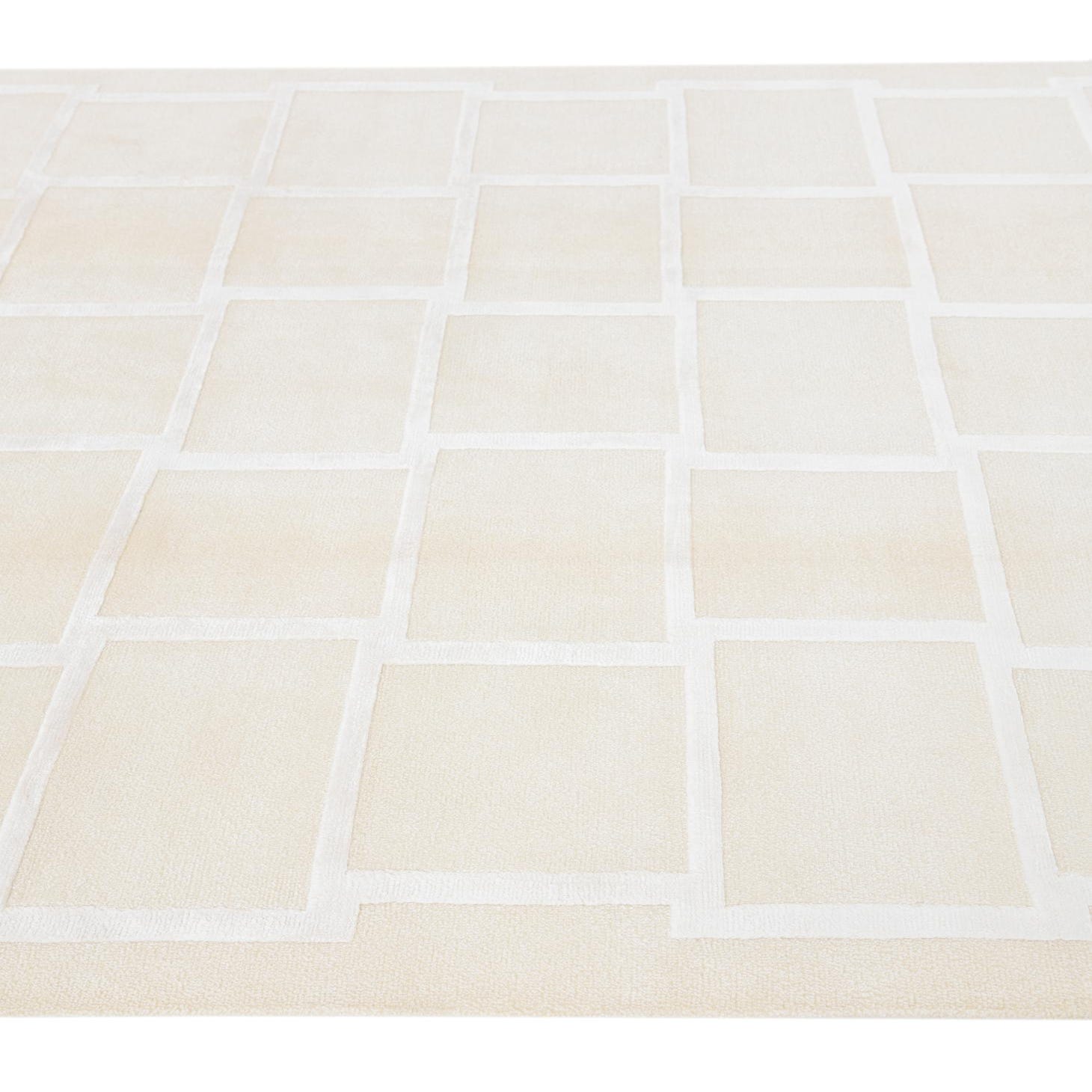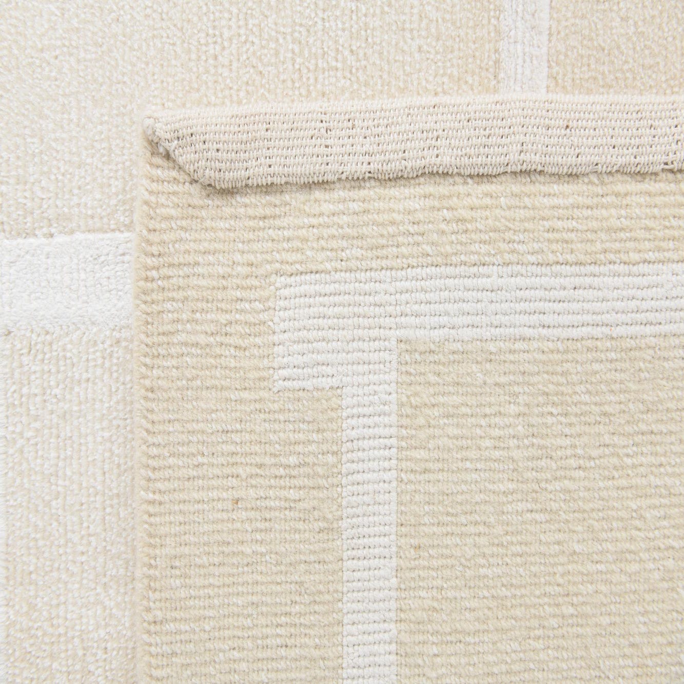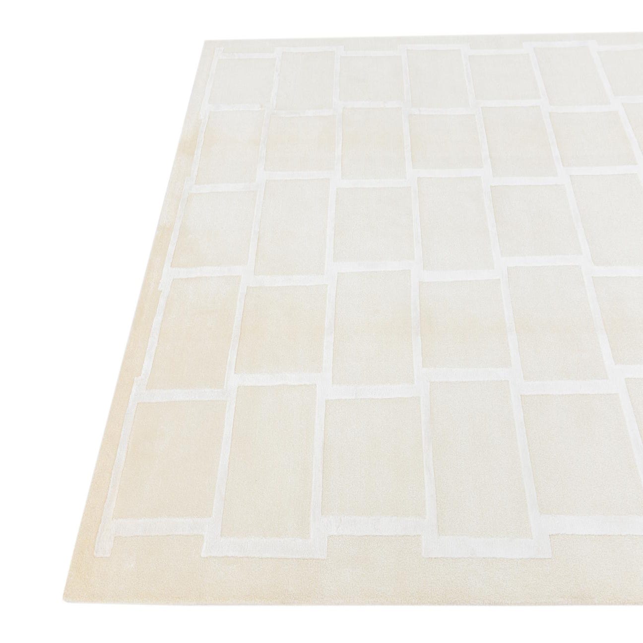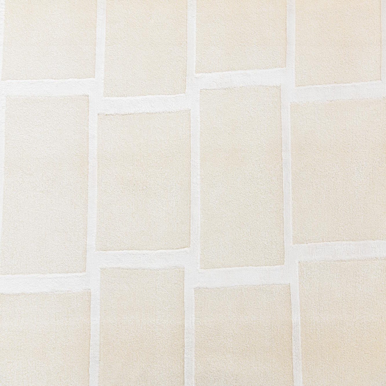 A 5x8 rectangular ivory wool rug with a modern geometric pattern of light cream rectangles outlined in white, suitable for a living room.