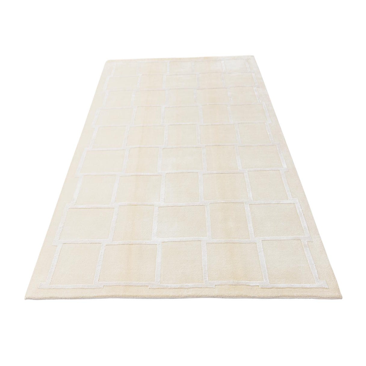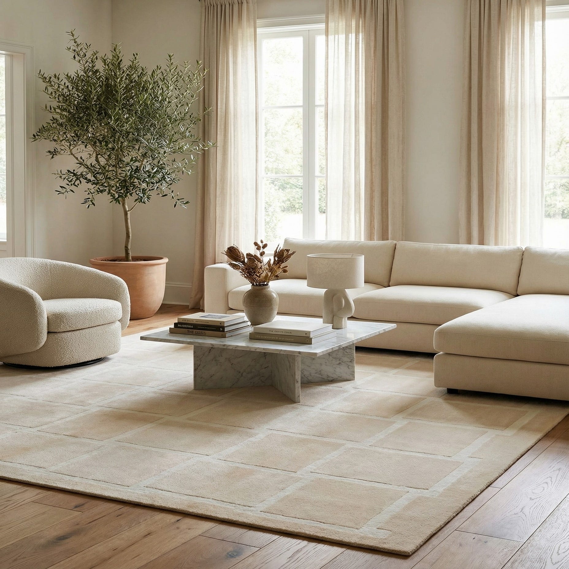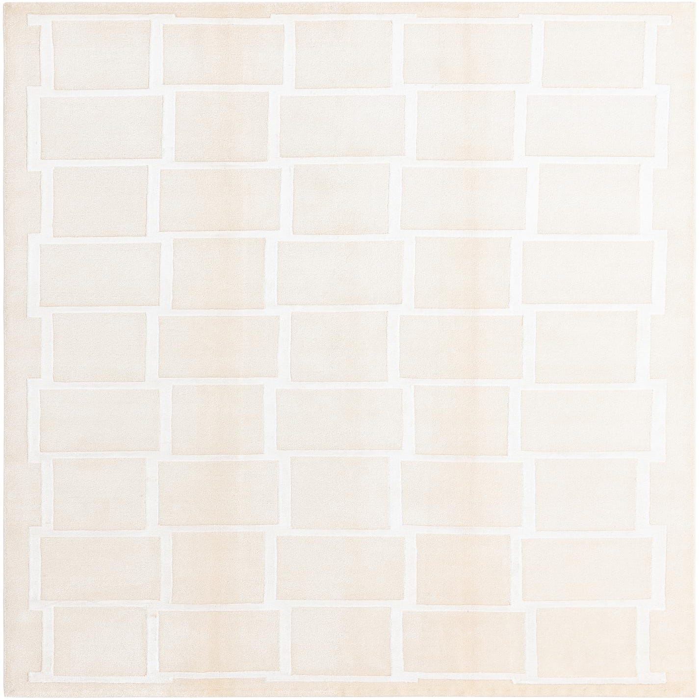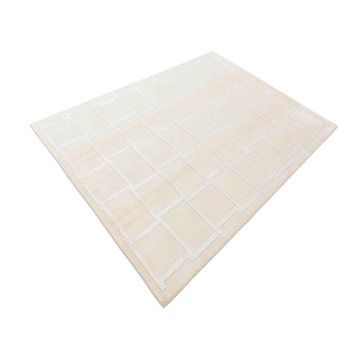 A 5x8 rectangular ivory wool rug with a modern geometric pattern of light cream rectangles outlined in white, suitable for a living room.