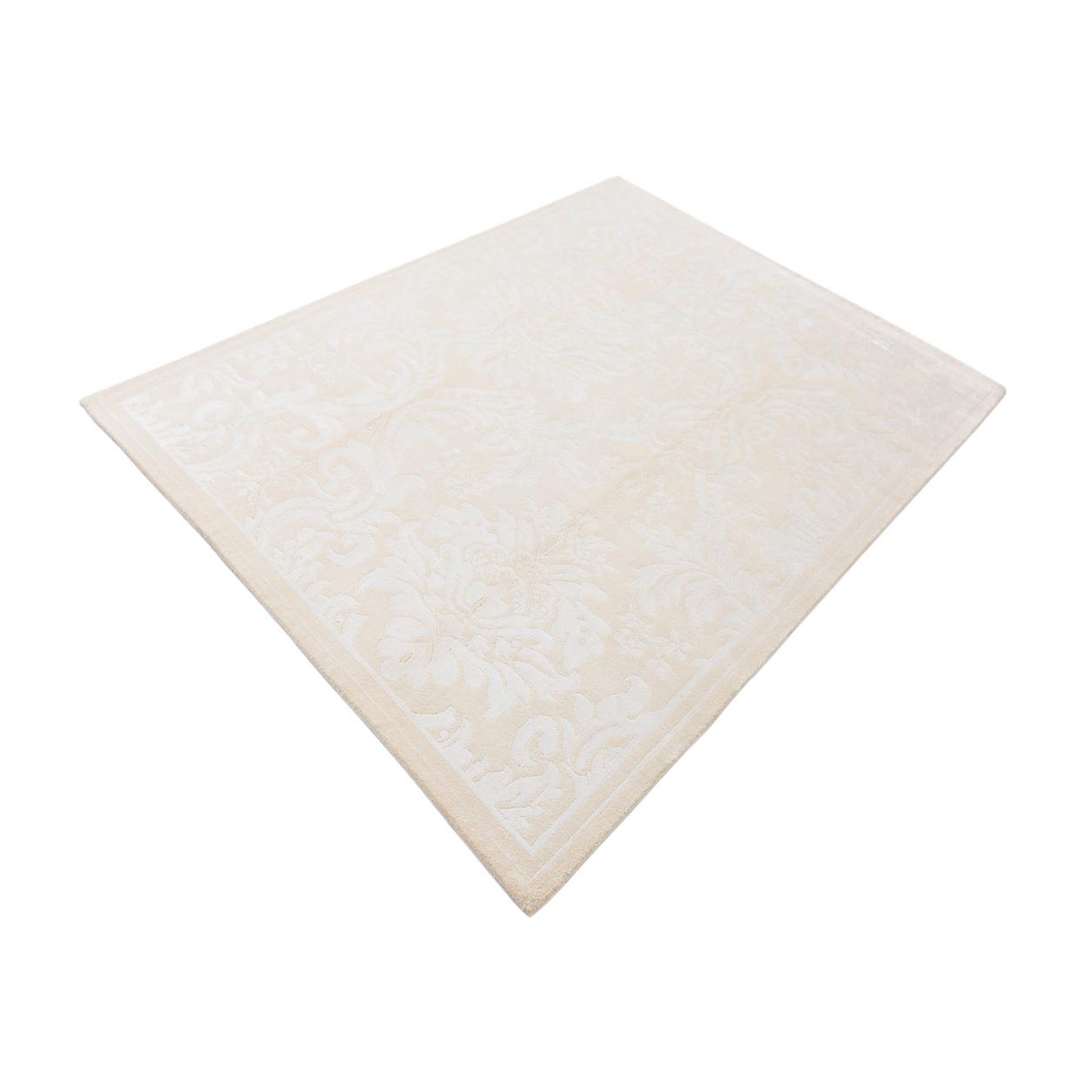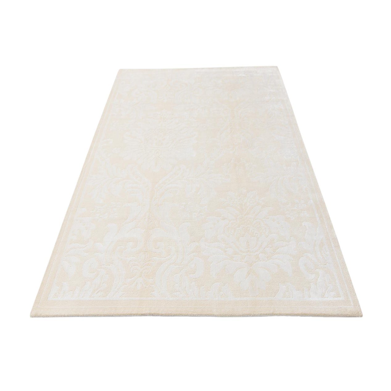 The Darya collection presents a 5x8 hand-knotted rug crafted from 100% wool, offering a luxurious foundation for any room. The rug displays an intricate pattern, characterized by ornate floral motifs and scrolling vine designs that create a sense of classic elegance. The palette is composed of cream, beige, and ivory hues, with a dominant cream background that ensures versatility and warmth.