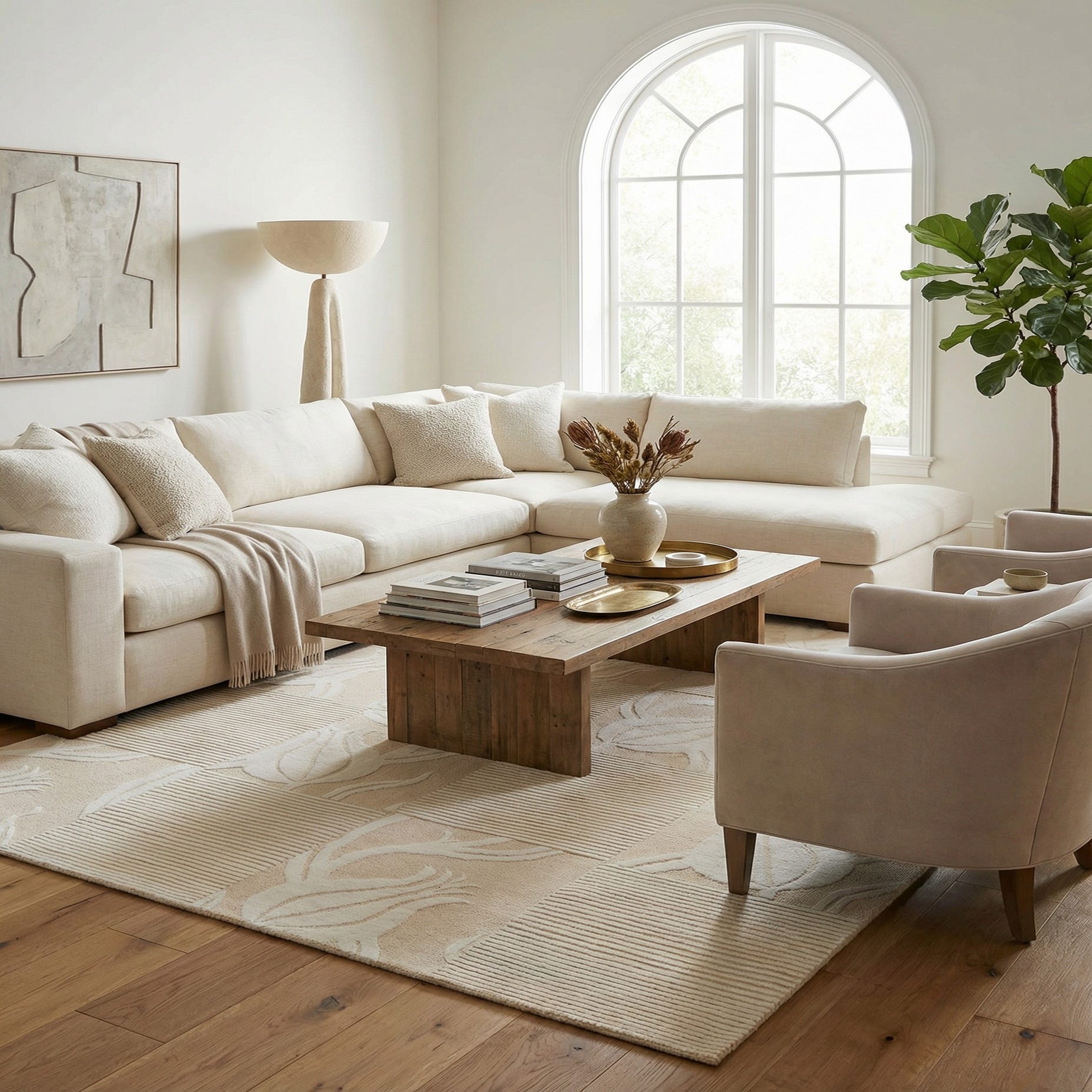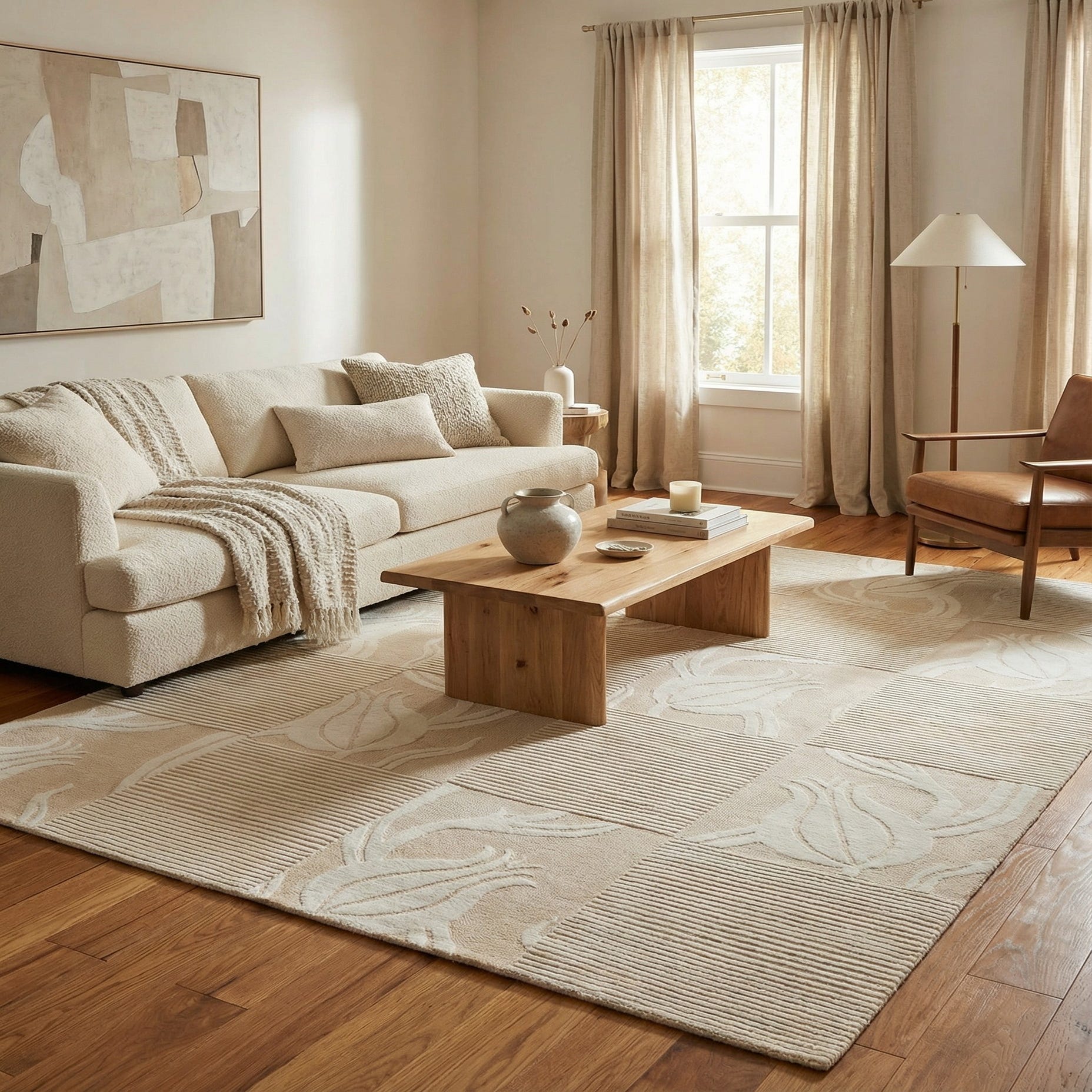 The rug's natural wool construction provides a plush feel underfoot, ensuring comfort without compromising on durability. Thanks to its neutral hues and timeless design, this rug can seamlessly integrate into a variety of interior aesthetics. It is particularly well-suited for contemporary living spaces, minimalistic designs, or rooms with a neutral color scheme that require a touch of warmth and sophistication. This rug could also serve as a calming foundation in a more eclectic decor, providing balance to more vibrant furnishings.