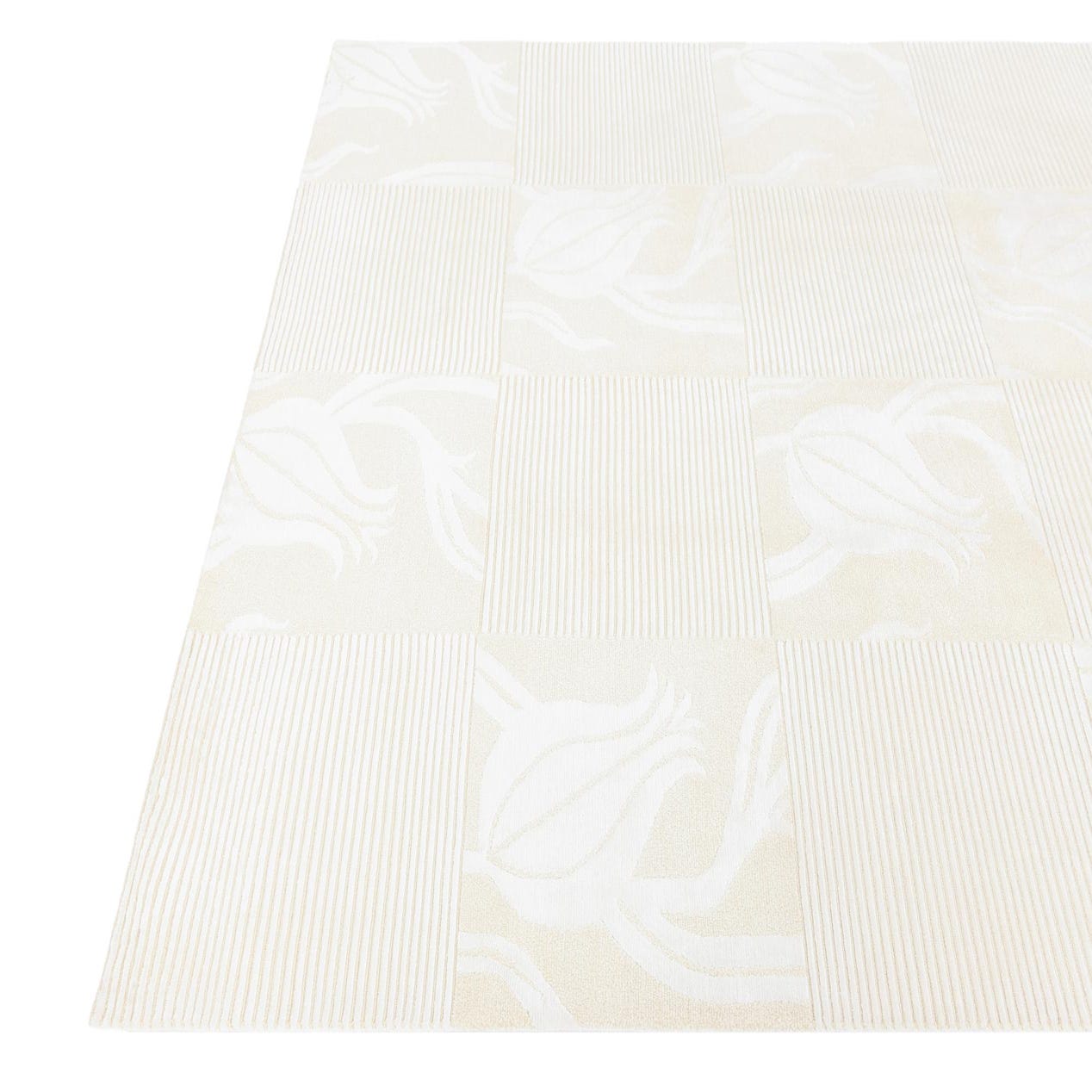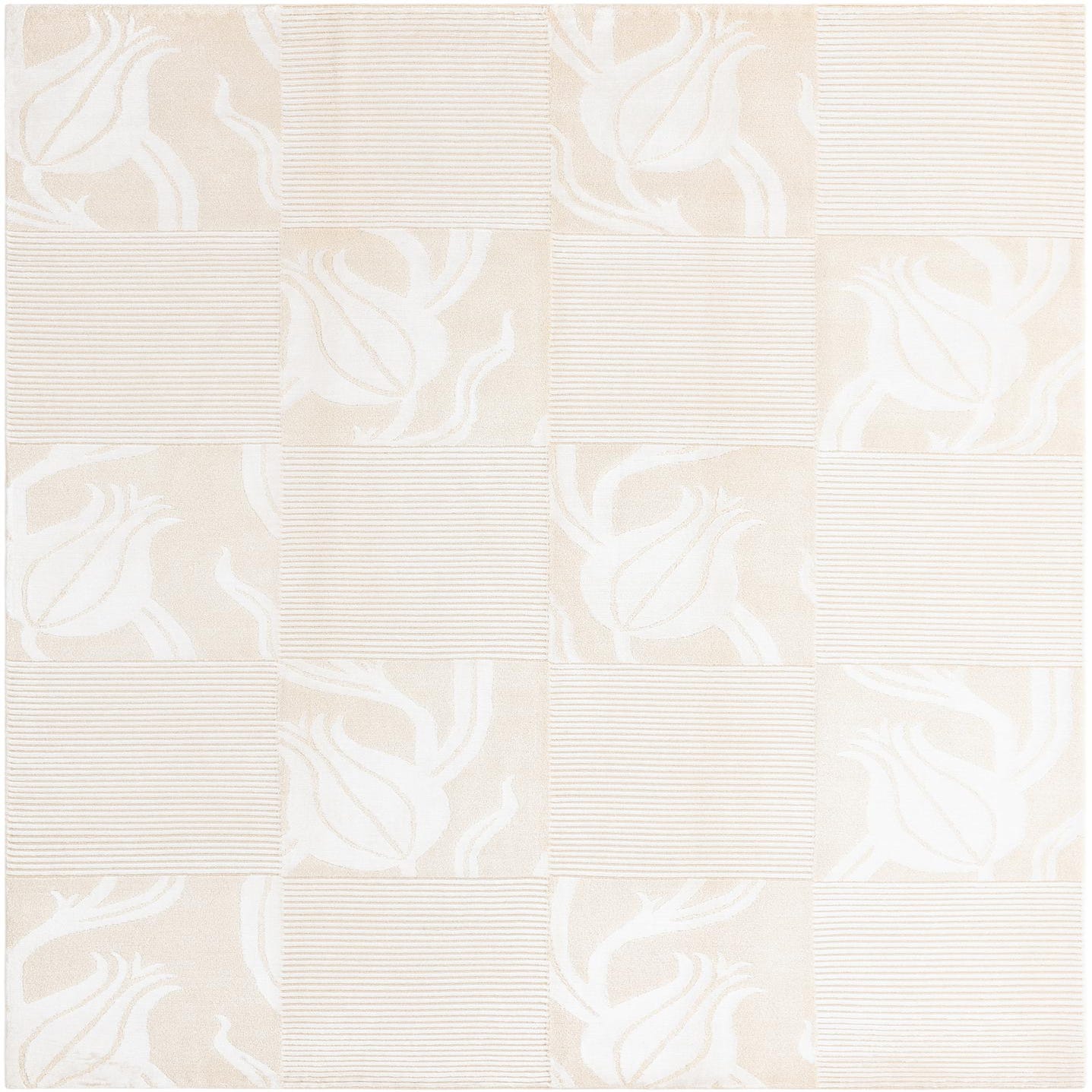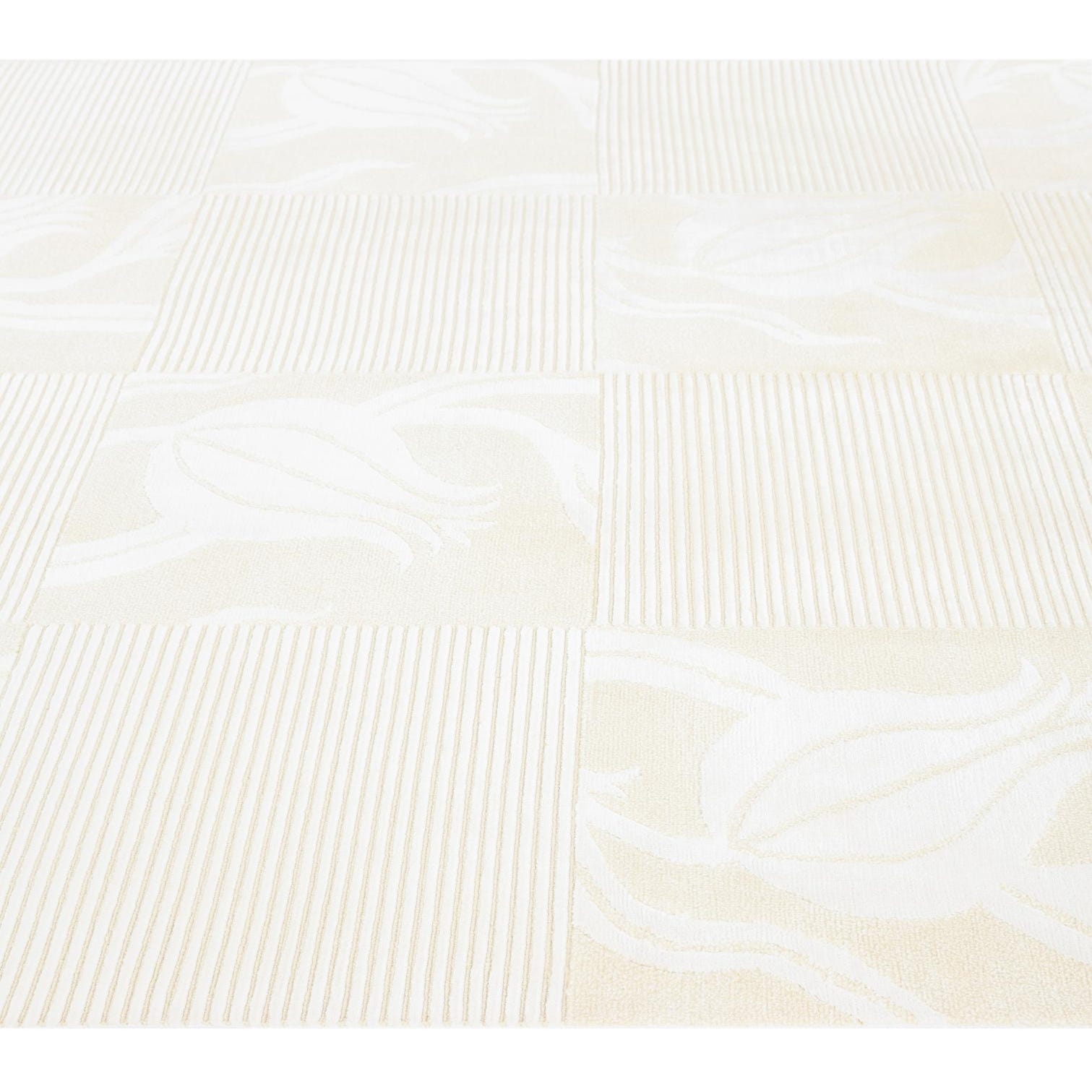A 5x8 rectangular ivory wool rug with a modern oriental pattern of alternating floral and striped squares.