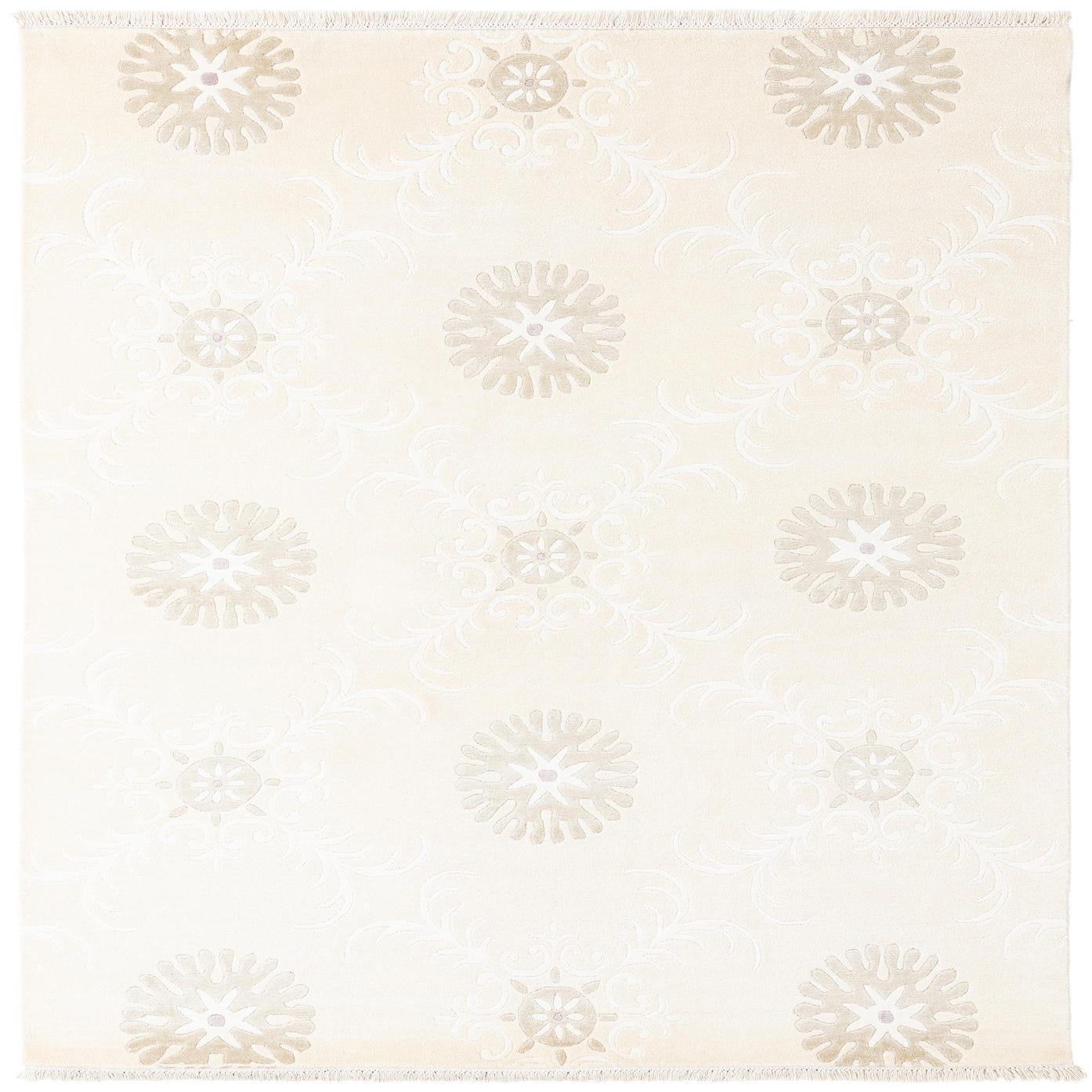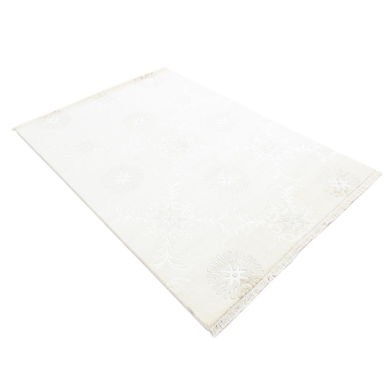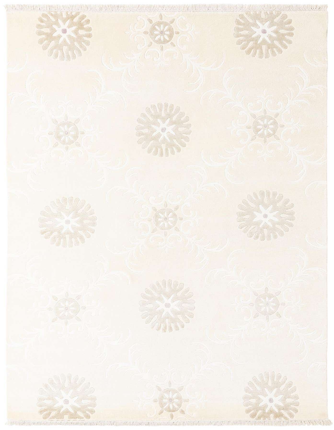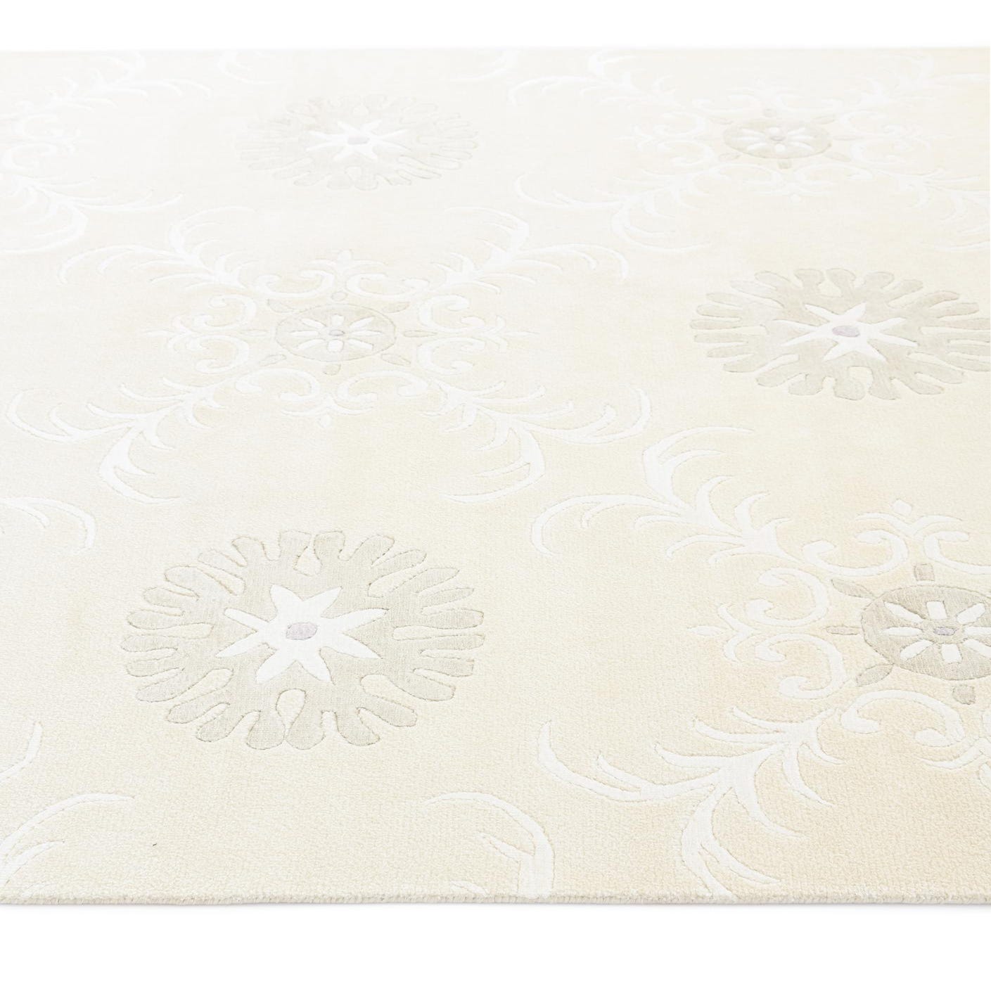 A 5x8 rectangular ivory wool rug with a modern pattern of repeating light beige medallions and subtle cream floral swirls.