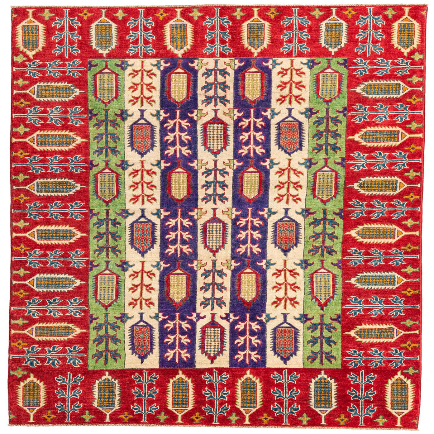 A 5x8 rectangular Rugs.com Kazak rug with a Southwestern-style pattern in red, ivory, blue, and green.