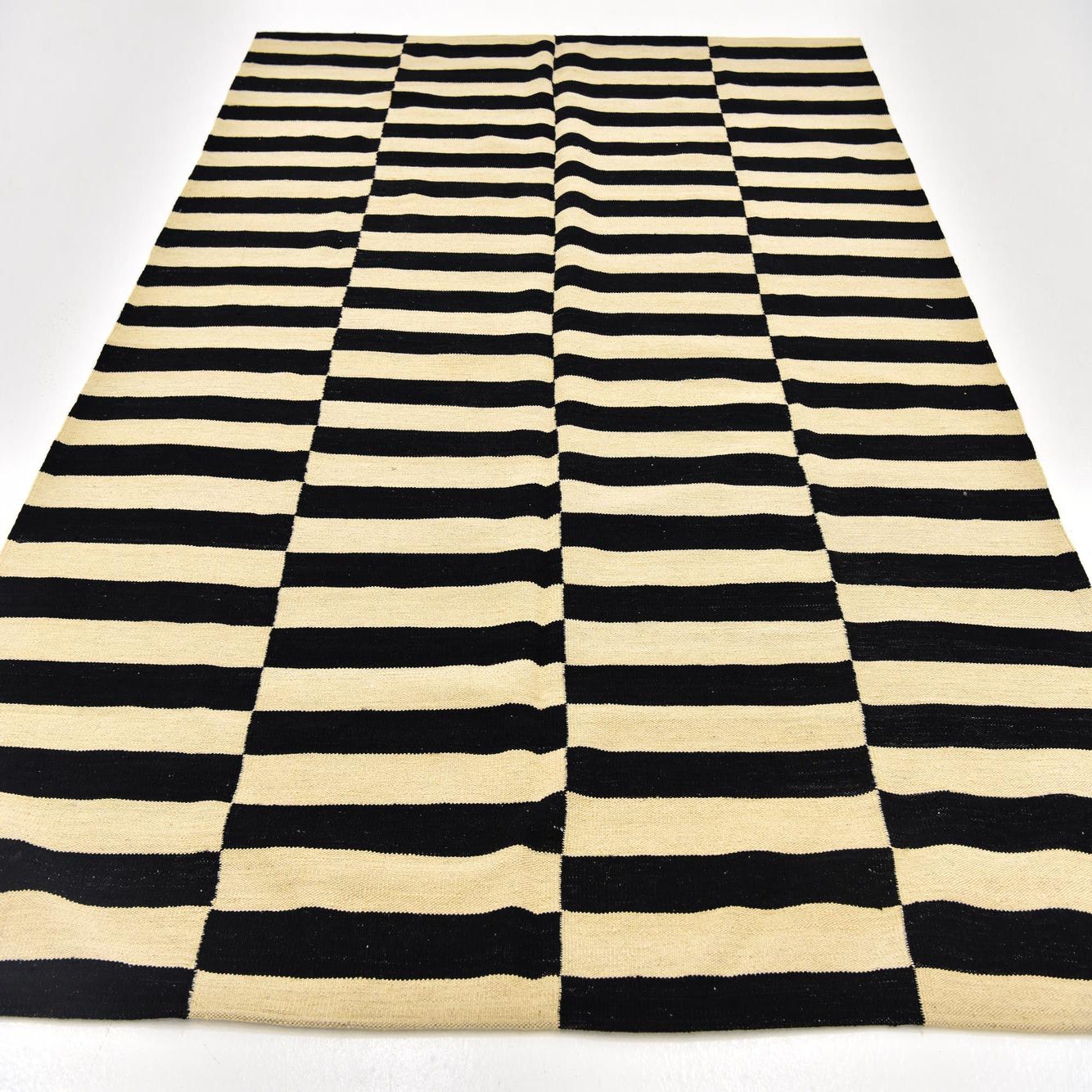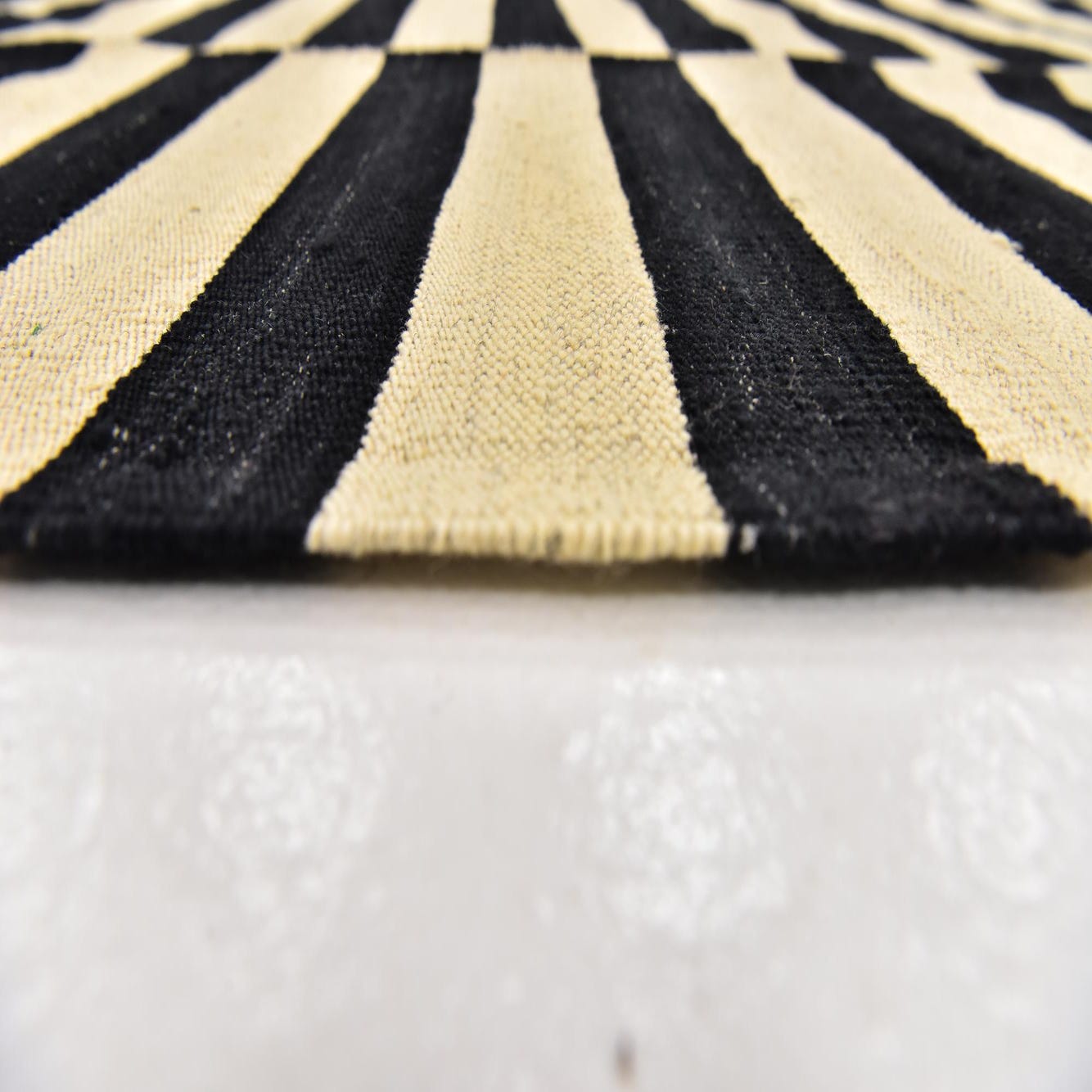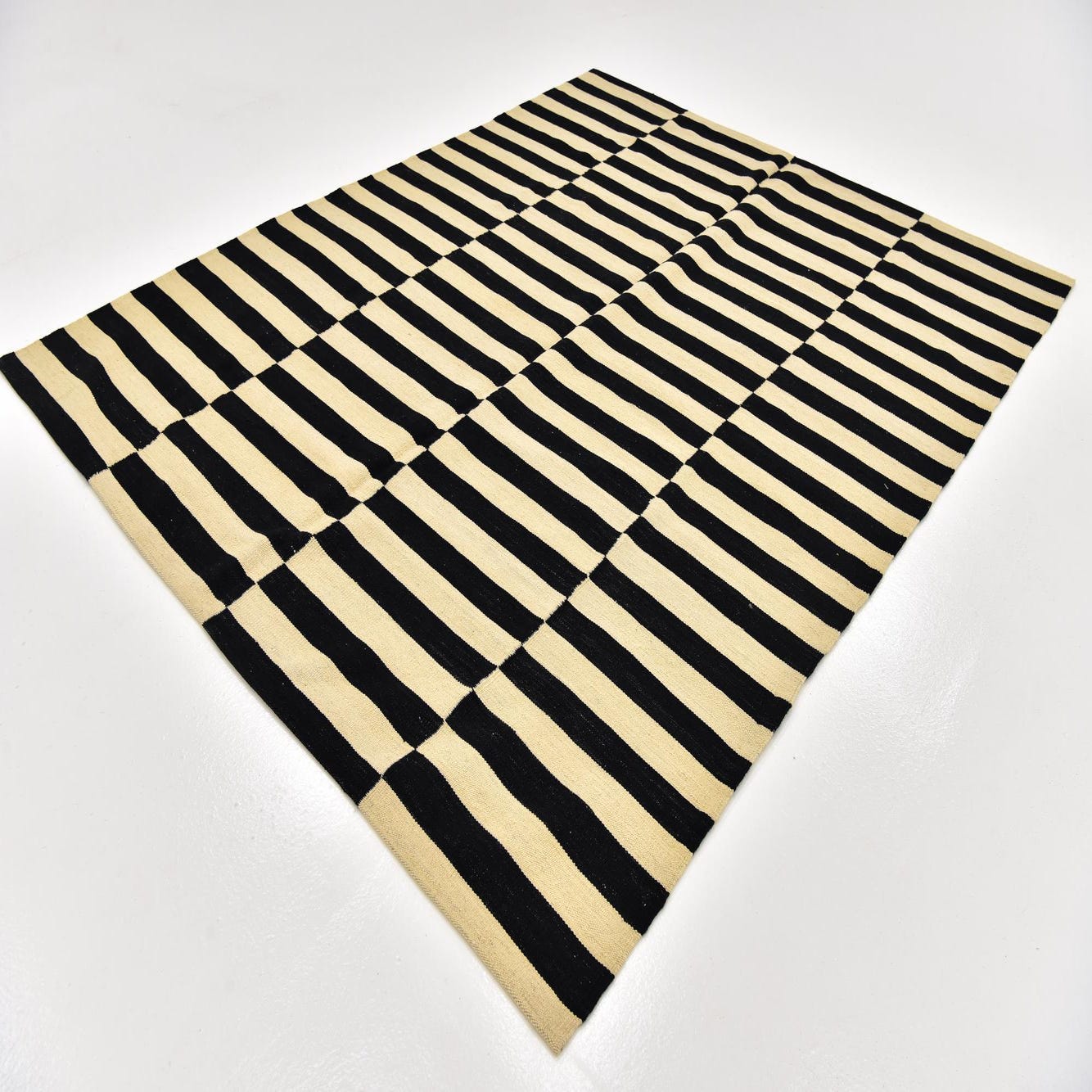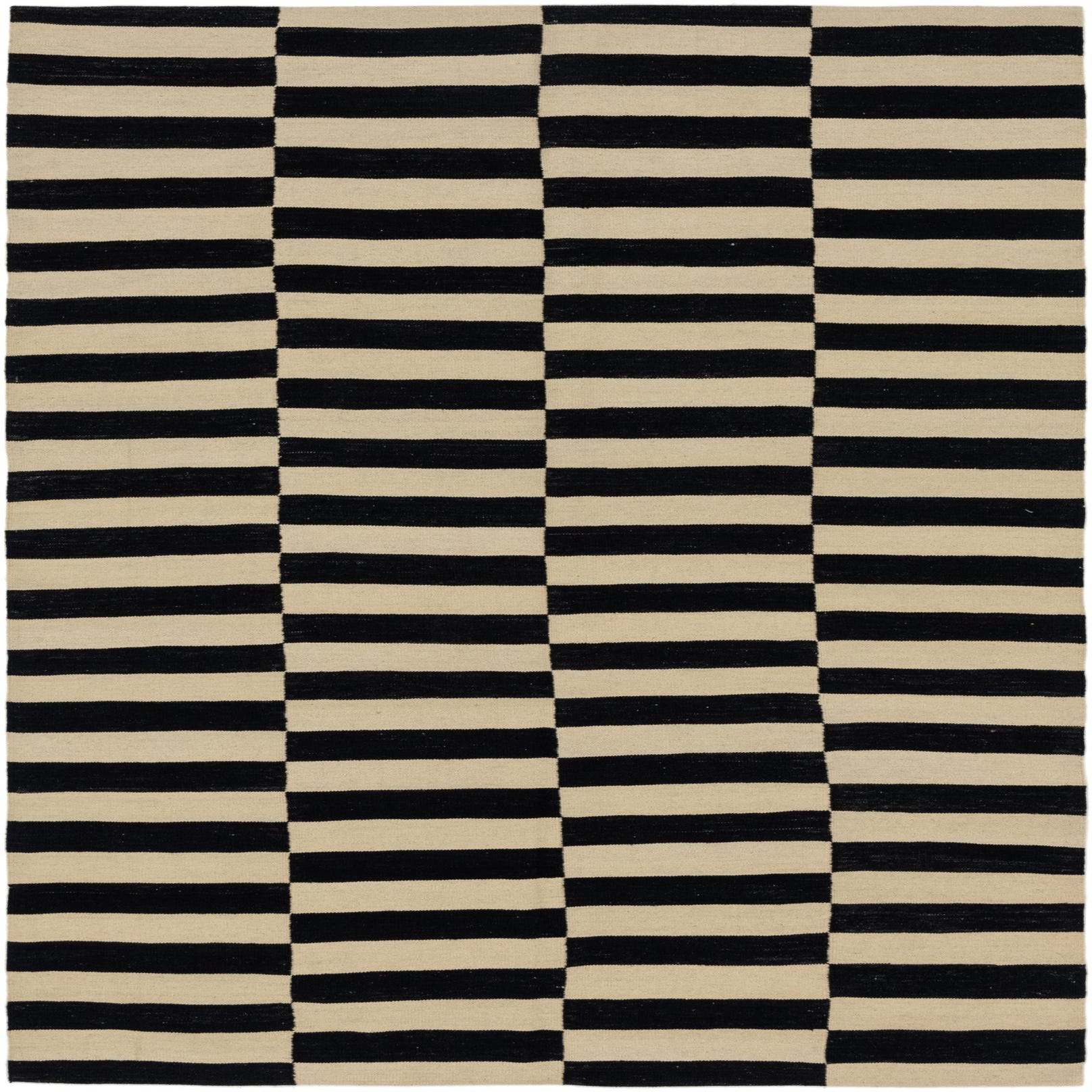 A 5x8 rectangular Kilim Modern rug with a bold black and ivory striped pattern, perfect for a living room.