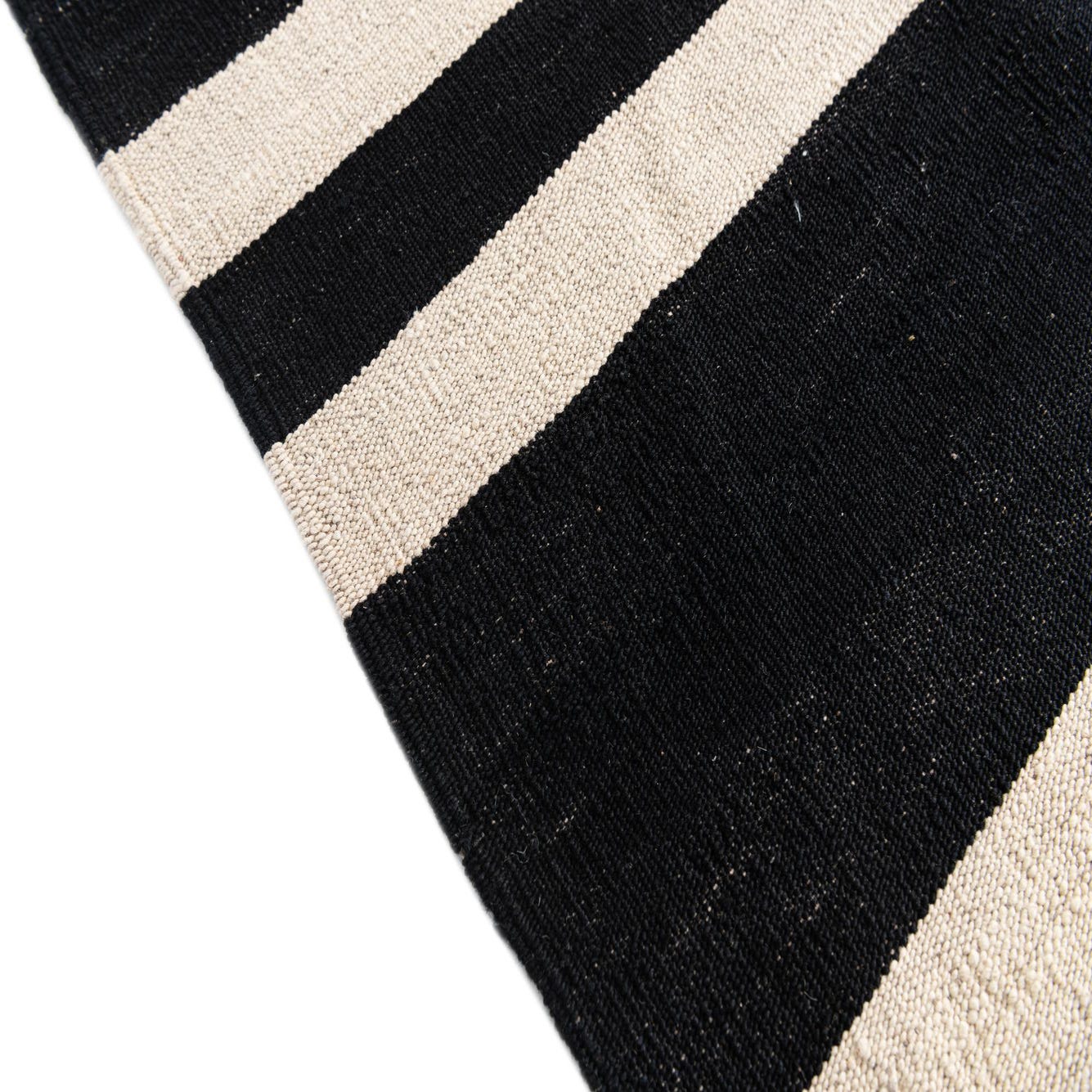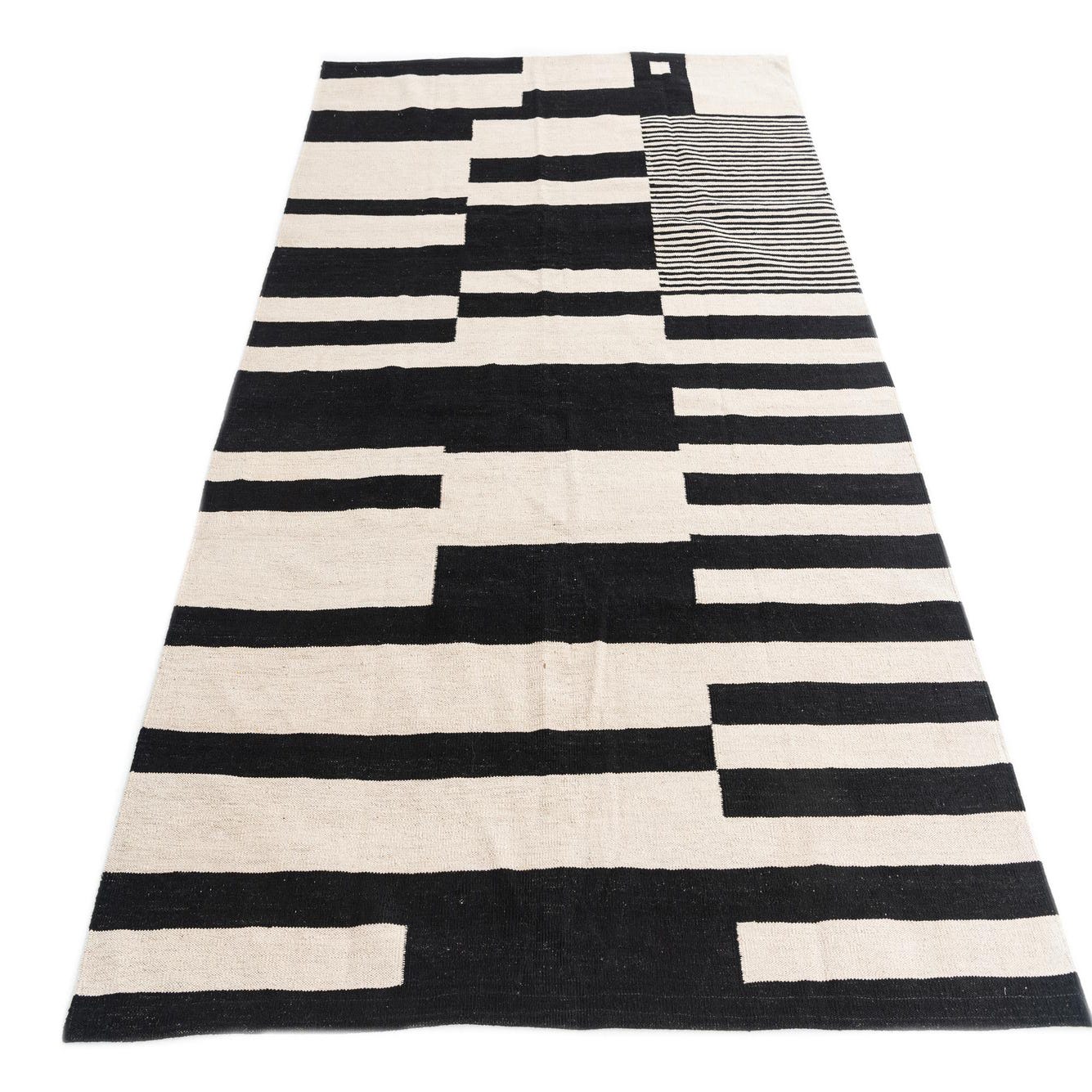 This hand-woven, 100% wool kilim presents a crisp, modern geometric pattern on a cream ground. Bold black bars and stepped rectangles run across the field, interrupted on one side by a section of tight black-and-cream pinstripes that add rhythm and visual texture. The flat-weave surface is firm underfoot with the subtle irregularities and softness of natural wool—tactile but low in profile, with a hand-made character that shows in the slight variations of line and tone.