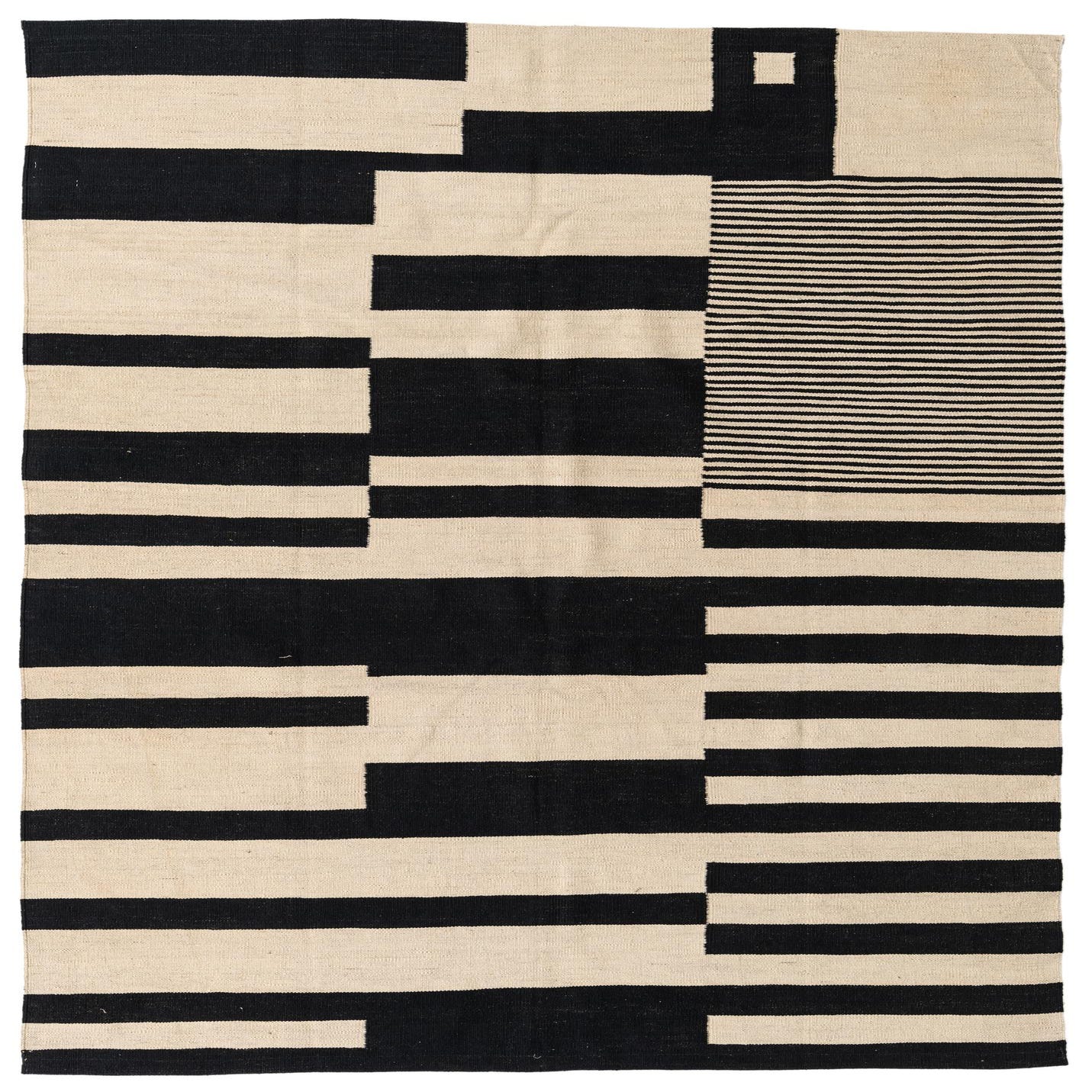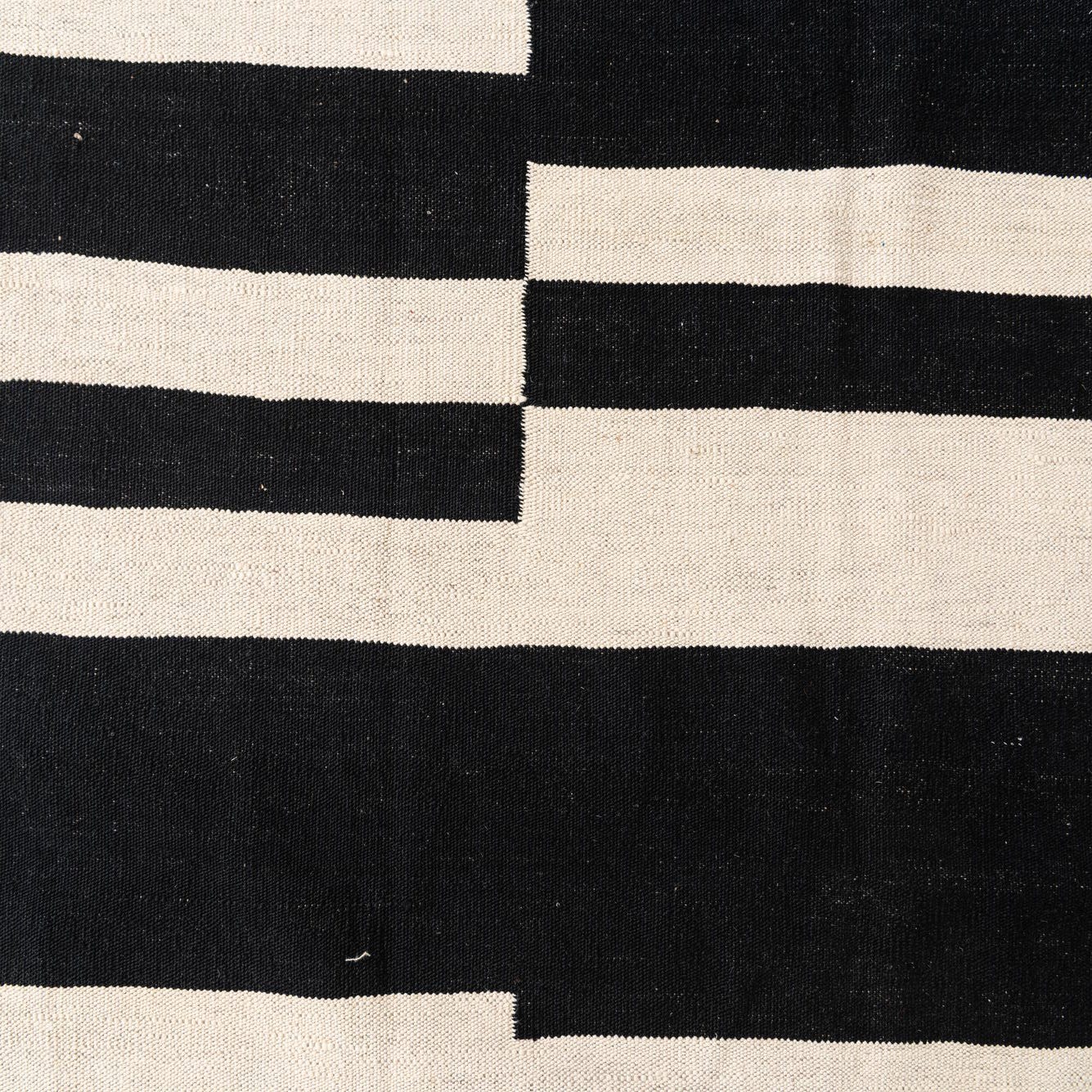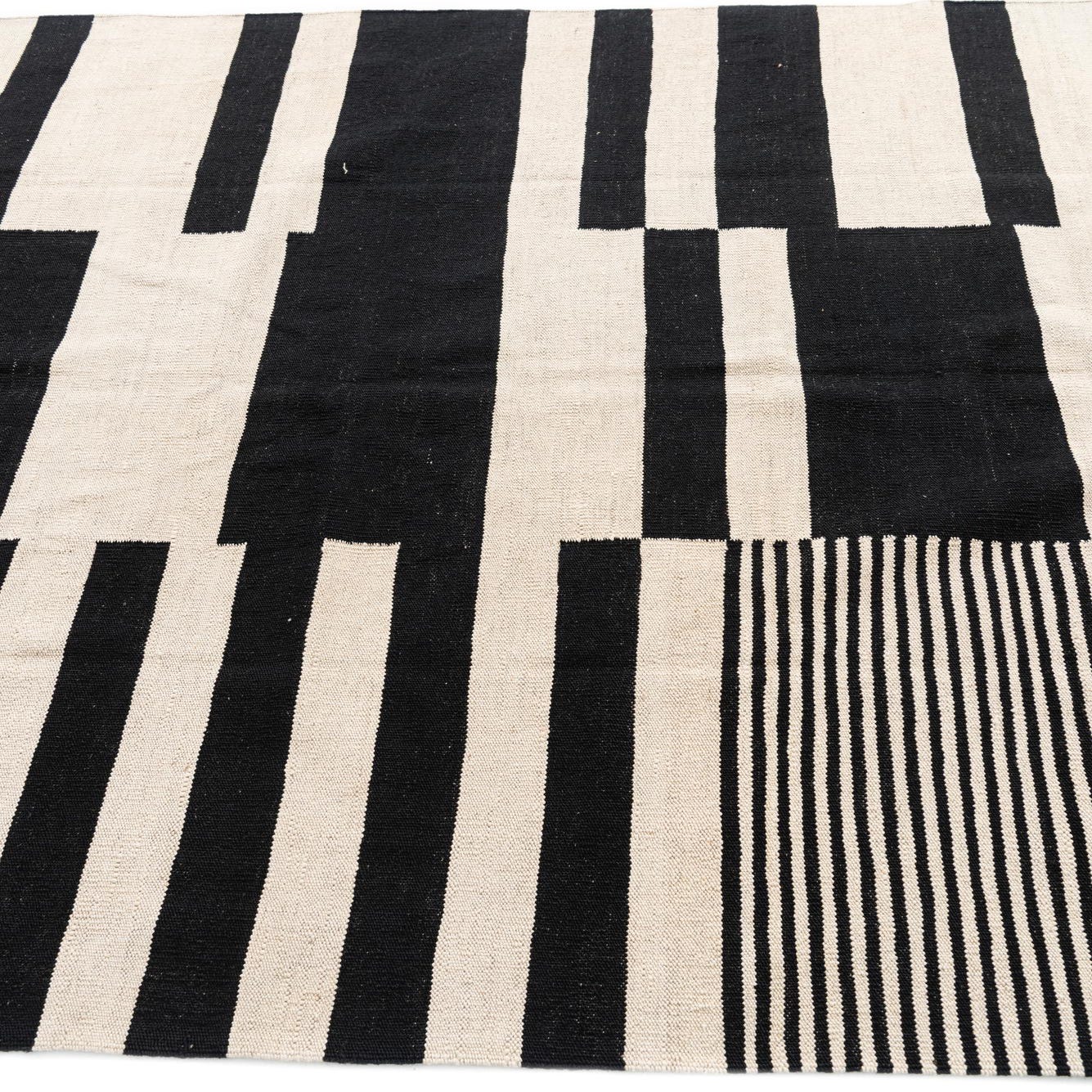 A bold, graphic arrangement of black bars and narrow pinstripes sits on a cream background, creating a modern, geometric composition that is both orderly and dynamic. The pattern alternates solid rectangular blocks with finely striped sections, offering visual contrast and movement without extra texture. Hand-woven from 100% wool, the flatweave surface is low-profile with a tactile, slightly firm hand — you can feel the tight weave beneath your feet while the natural wool offers a warm, matte finish.