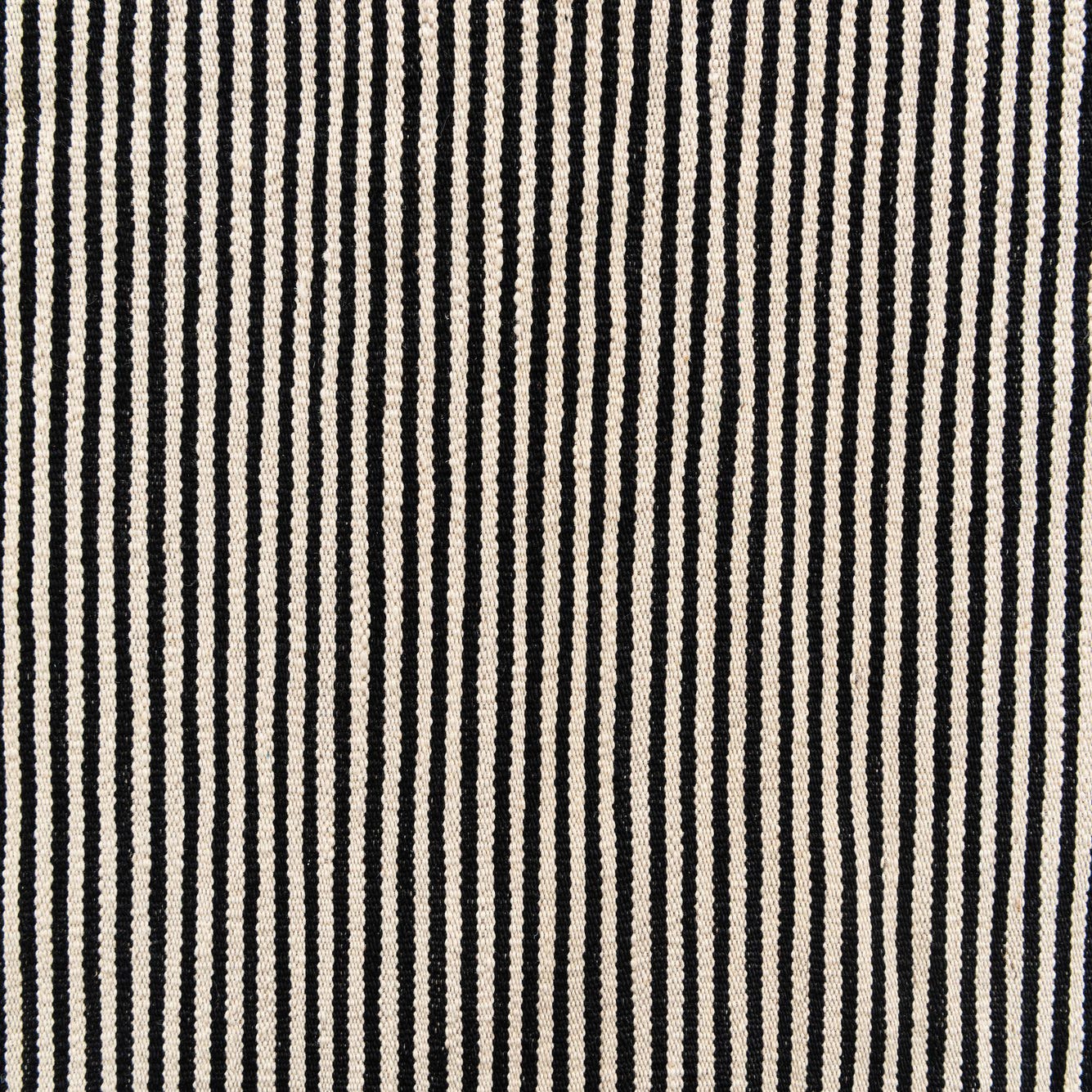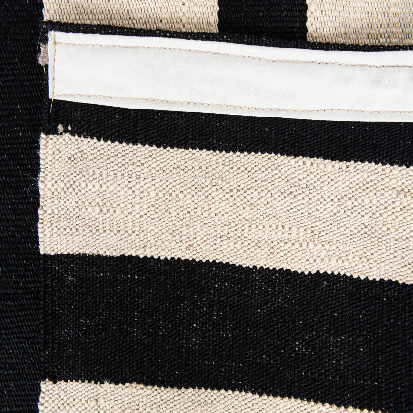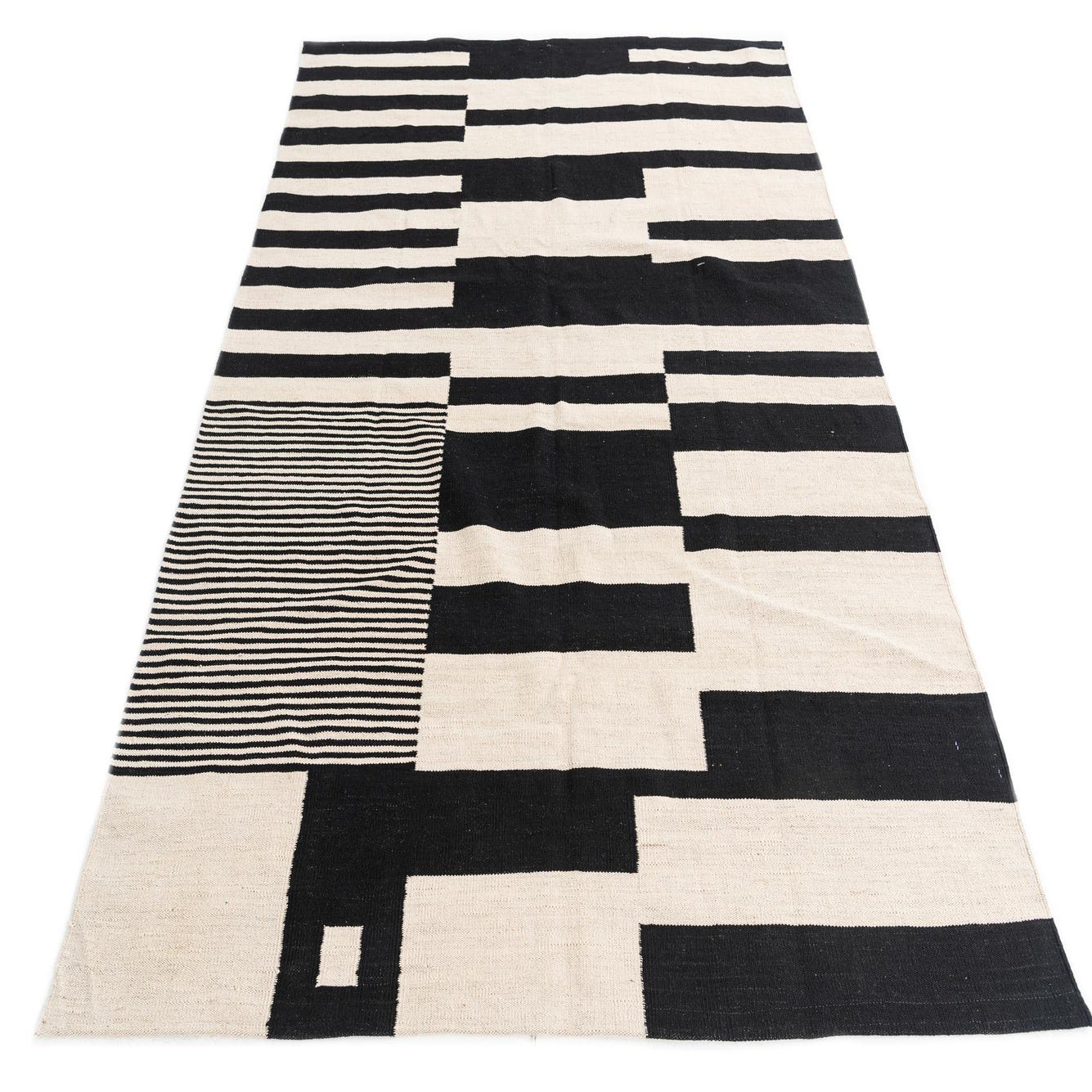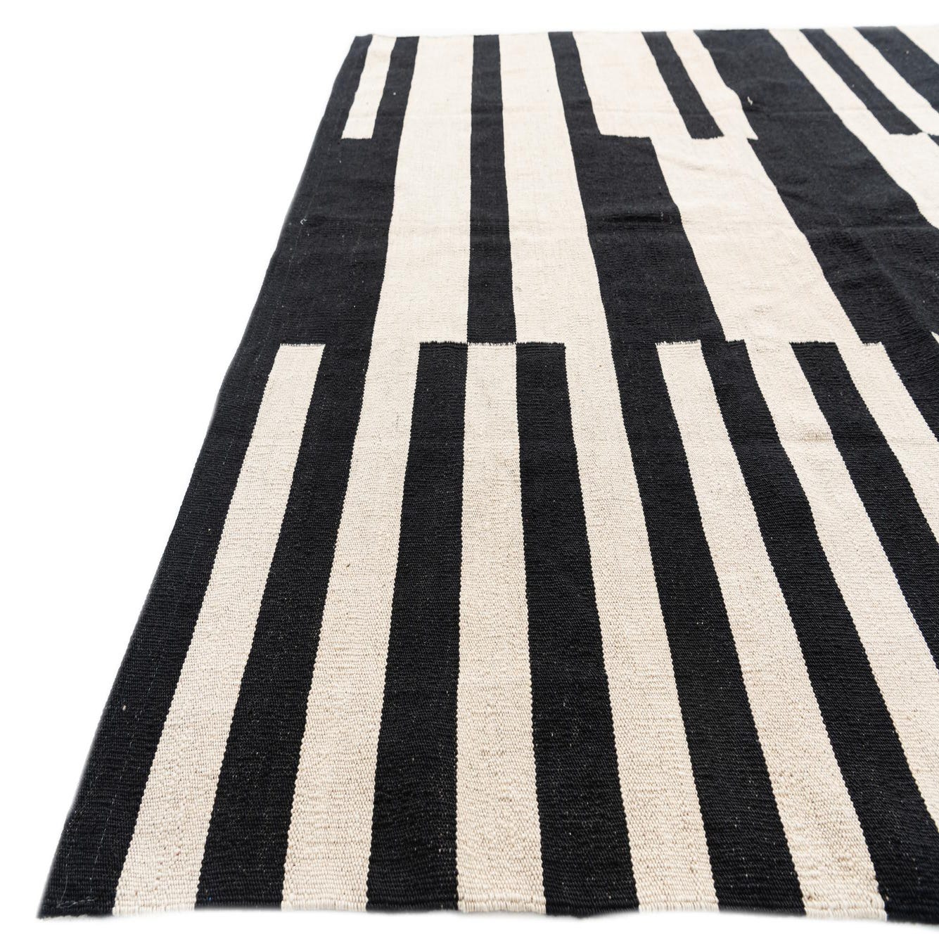 A bold, graphic arrangement of black bars and narrow pinstripes sits on a cream background, creating a modern, geometric composition that is both orderly and dynamic. The pattern alternates solid rectangular blocks with finely striped sections, offering visual contrast and movement without extra texture. Hand-woven from 100% wool, the flatweave surface is low-profile with a tactile, slightly firm hand — you can feel the tight weave beneath your feet while the natural wool offers a warm, matte finish.