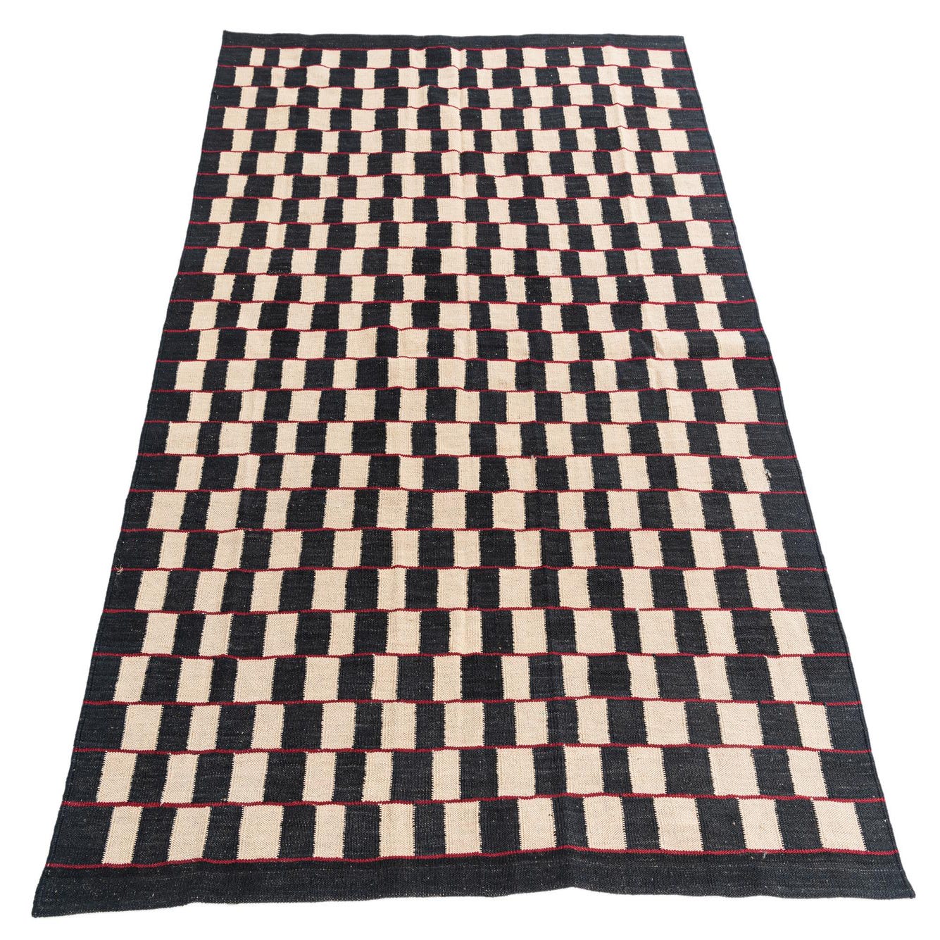 A 5x8 rectangular flatweave rug featuring a bold checkerboard pattern of ivory and black squares, with thin red lines separating the rows.