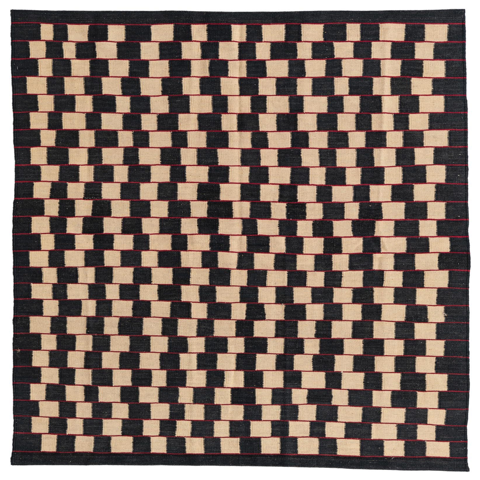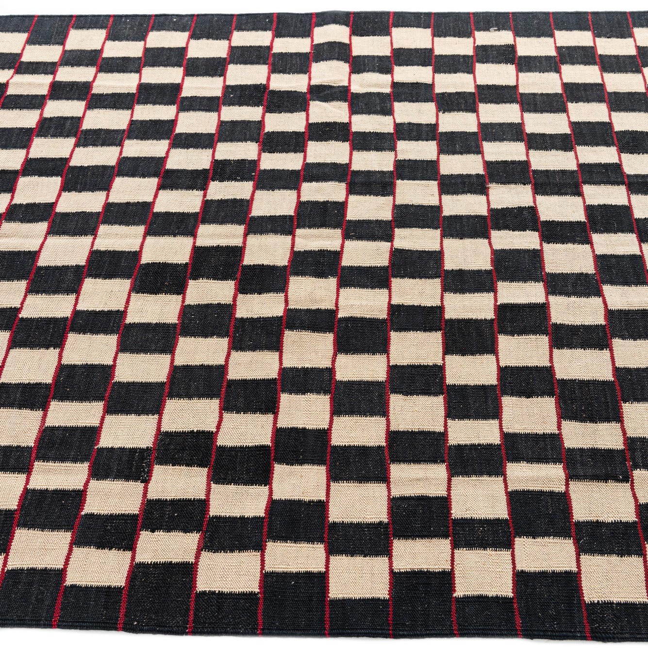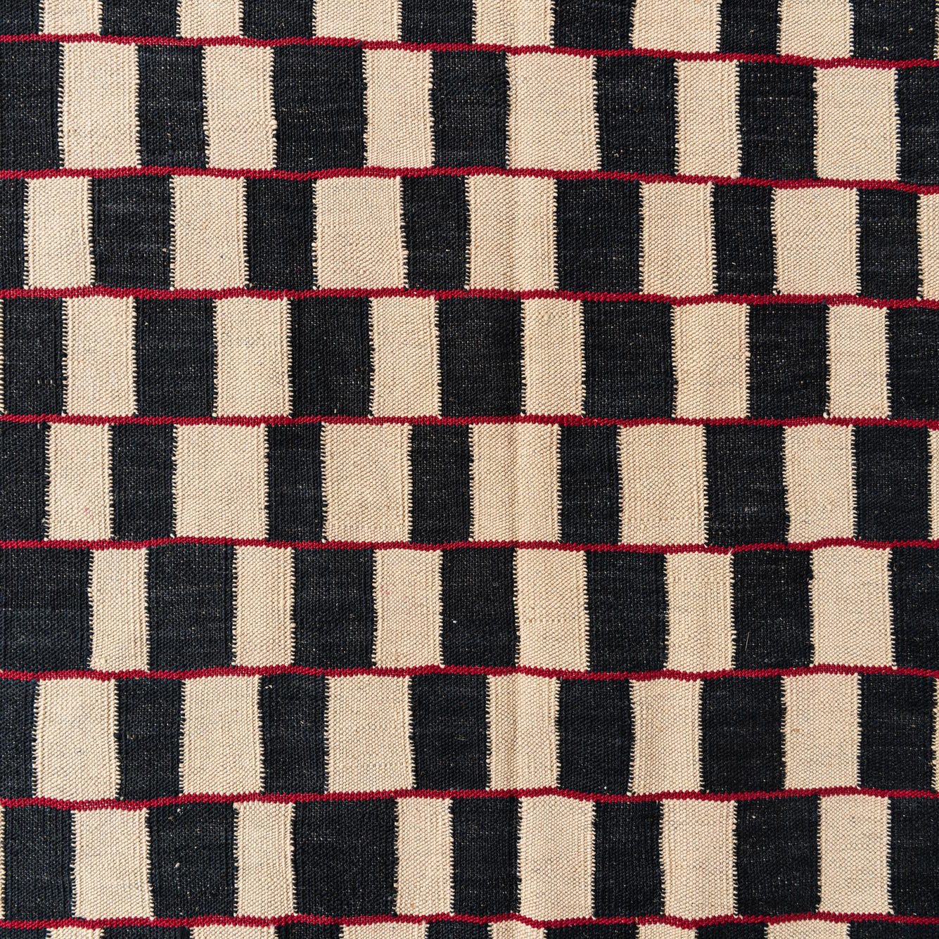 A bold, geometric checkerboard pattern plays across a cream field, alternating deep black blocks with narrow red lines that run horizontally between the rows. The design has a slightly irregular, hand-formed rhythm that highlights its hand woven construction. The flatweave surface, made of 100% wool, lies low to the floor with a firm, tactile feel—wool fibers give a warm, natural texture without a high pile, and a slim black border frames the composition.