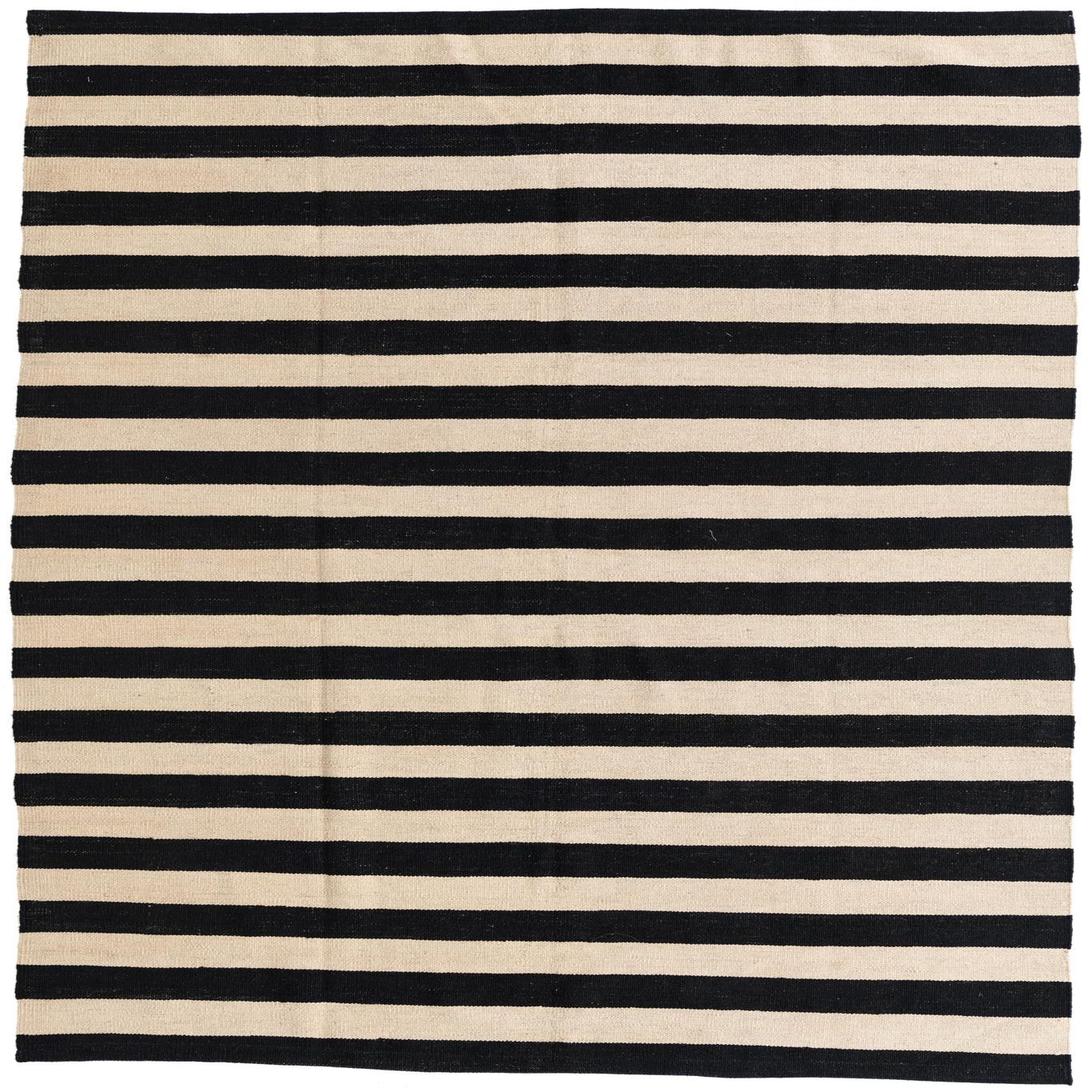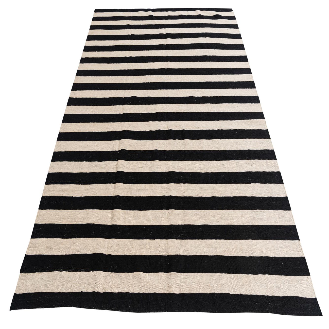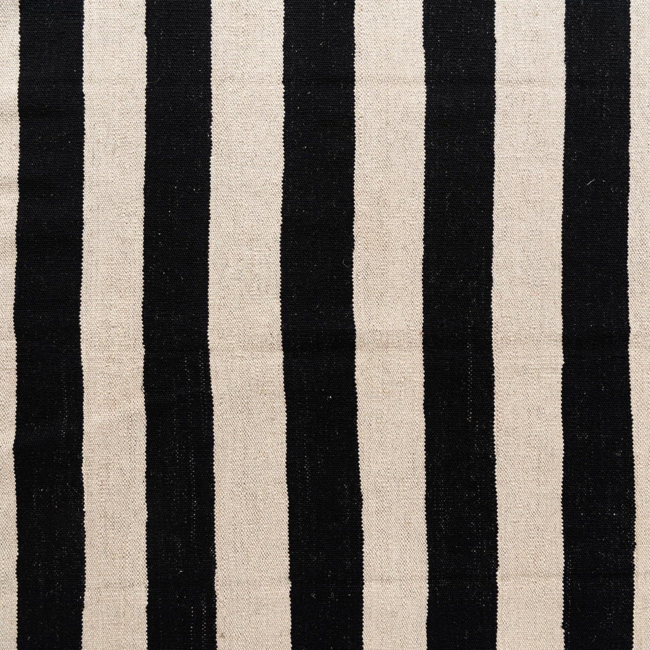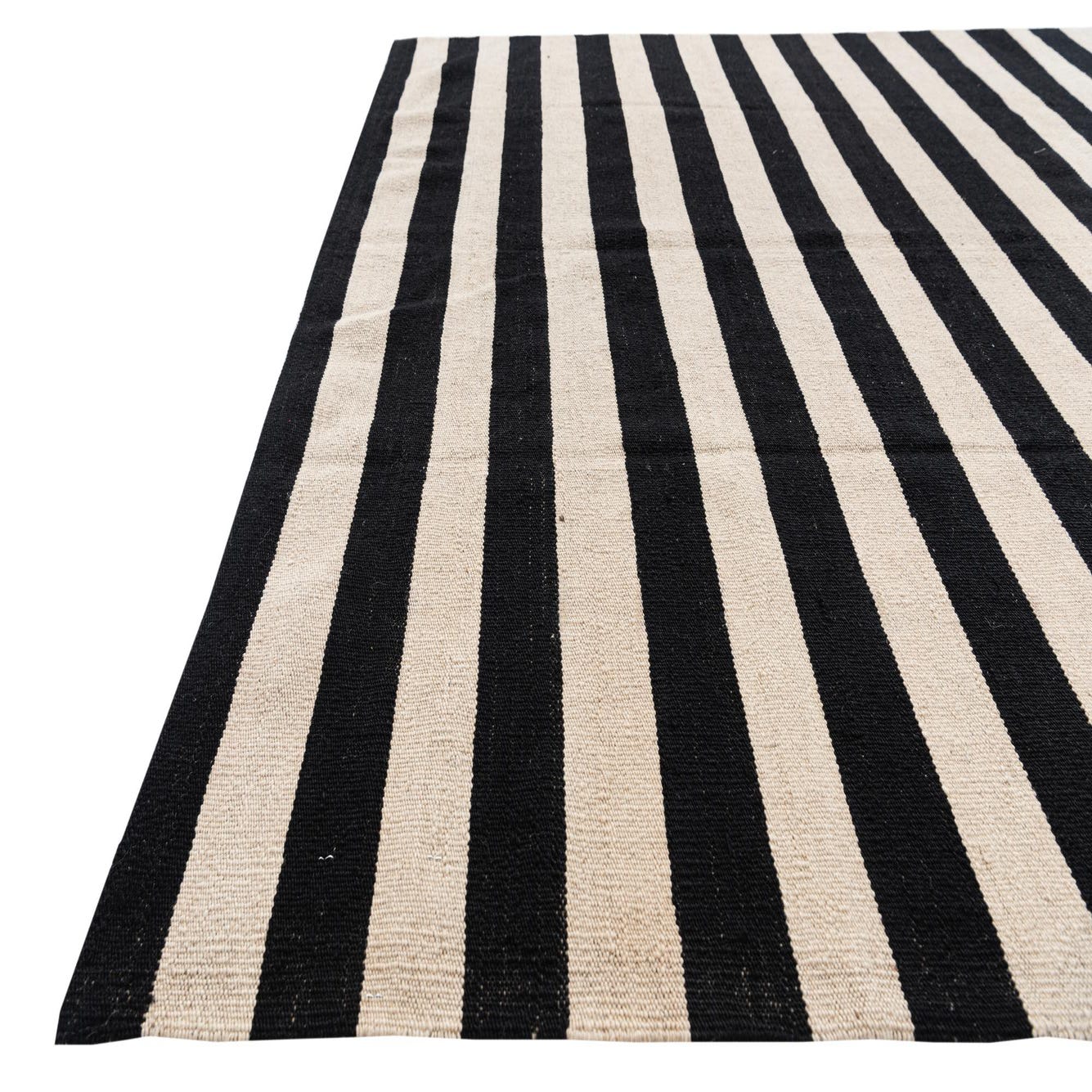 The Kilim Modern collection presents a 5x8 hand-woven rug crafted from 100% wool, offering durability and a soft underfoot experience. This particular design showcases a bold and graphic striped pattern that alternates between black and cream, imbuing the piece with a contemporary yet timeless visual appeal. The clean lines and the contrast created by the colors provide a sense of structure and sophistication.