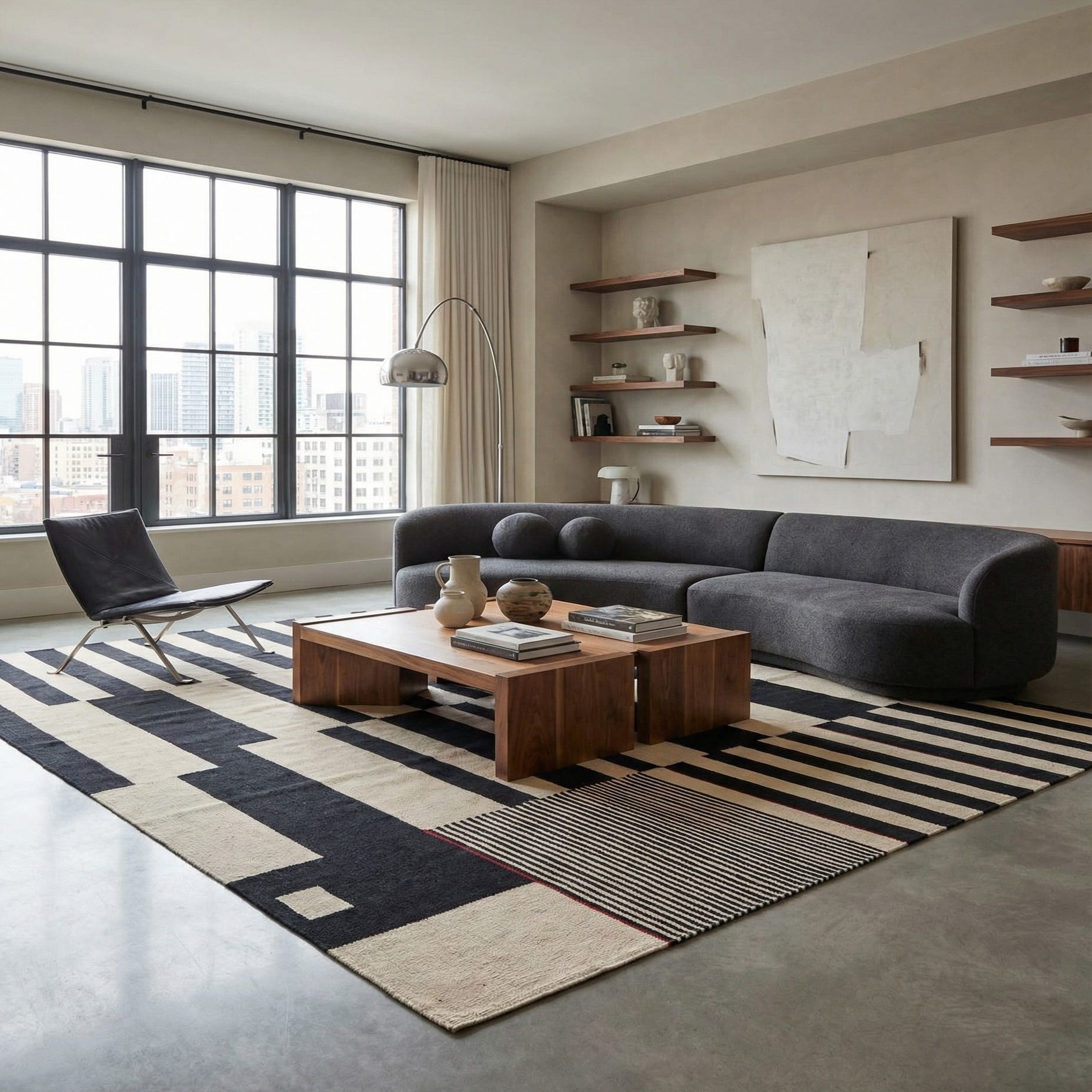 The rug's pattern, comprised of abstract rectilinear forms and stripes, gives it a modern and versatile appeal. This two-tone palette ensures that the rug will blend seamlessly with various decor styles, from minimalist or Scandinavian-inspired spaces that favor clean lines and neutral colors, to more eclectic or contemporary interiors where it can serve as a grounding element amid more vibrant furnishings.