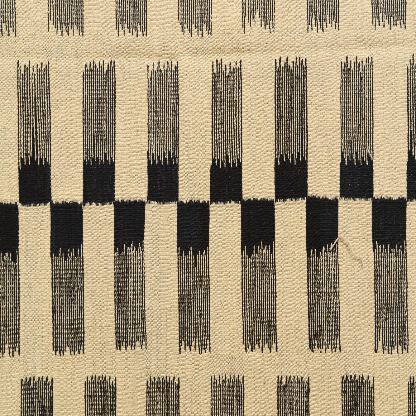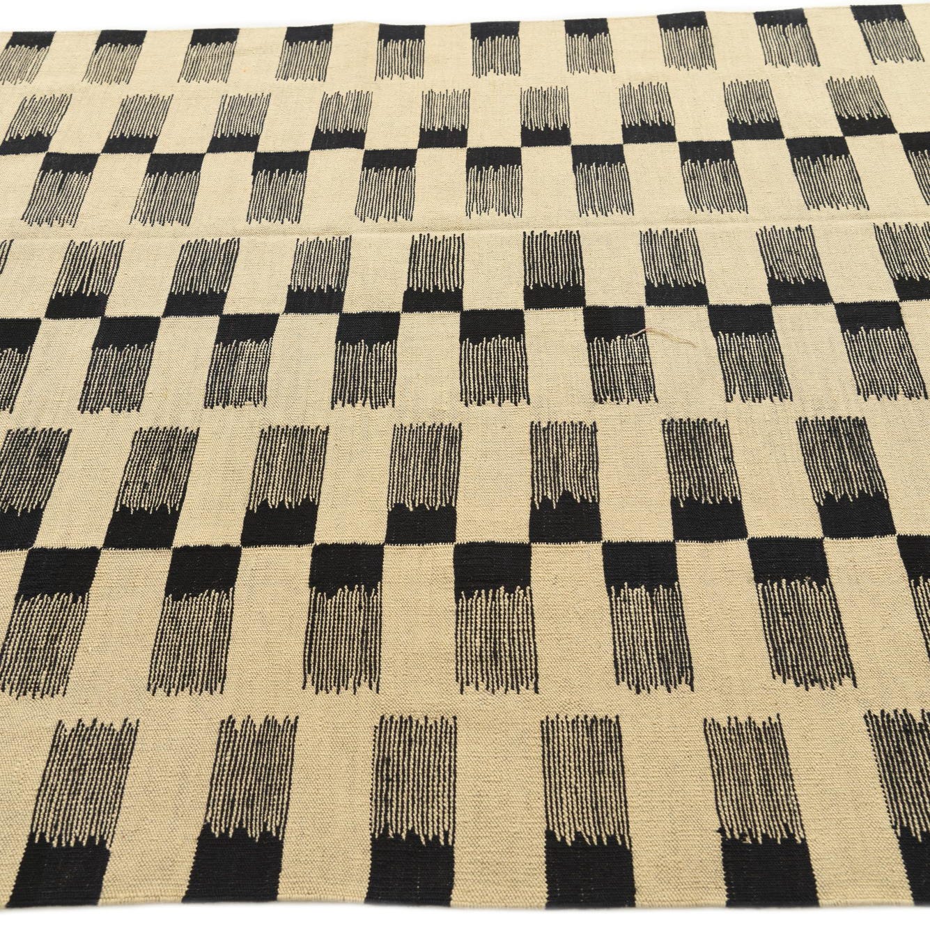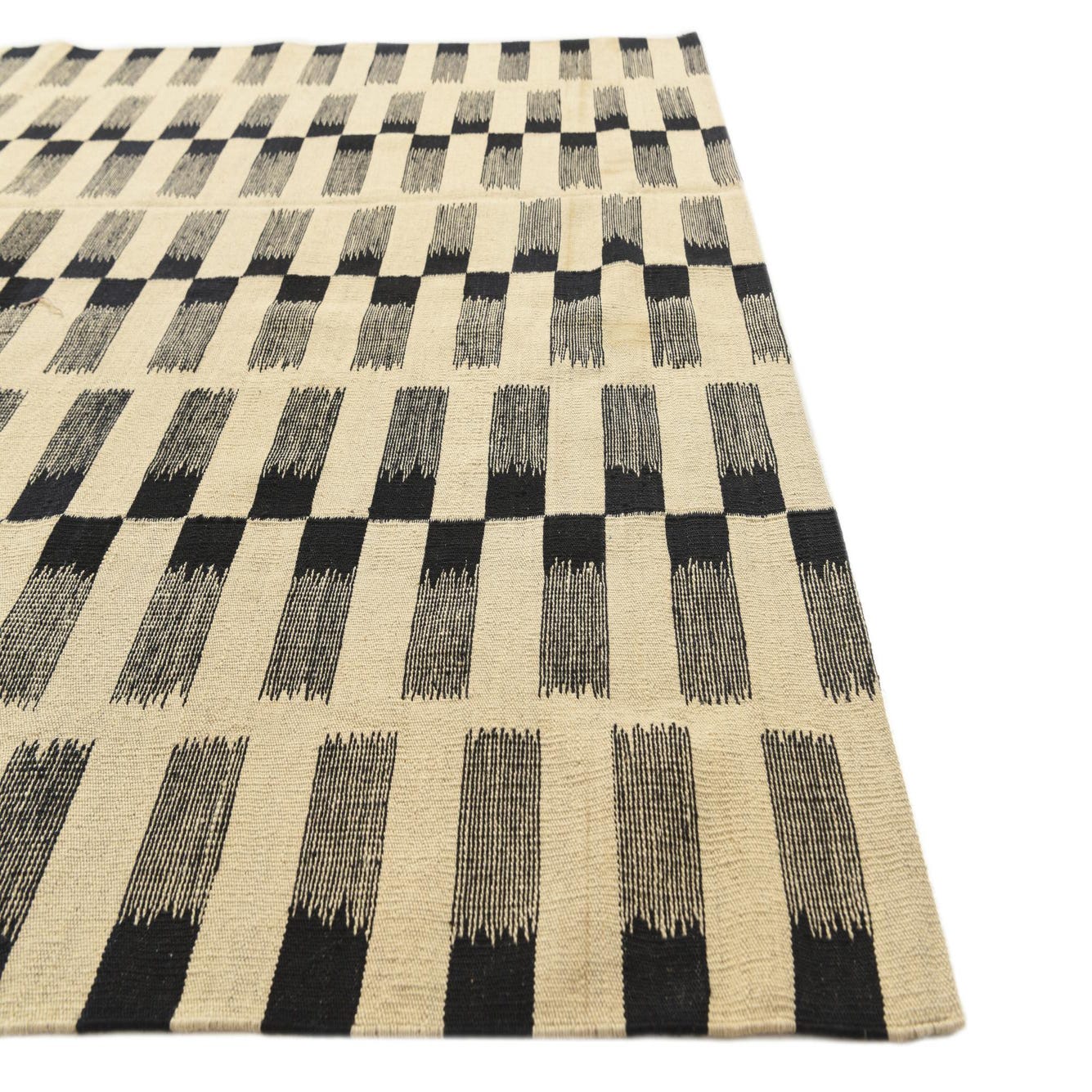 Hand-woven from 100% wool, this flatweave rug pairs a cream ground with a bold black geometric motif. Short, brushstroke-like rectangles are arranged in regular vertical columns, alternating solid blocks with fine linear textures to create a steady, graphic rhythm across the field. The kilim-style weave produces a low-profile, tightly woven surface with a subtle tactile grain—you can feel the woven structure underfoot while the wool retains a pleasant natural resilience.
