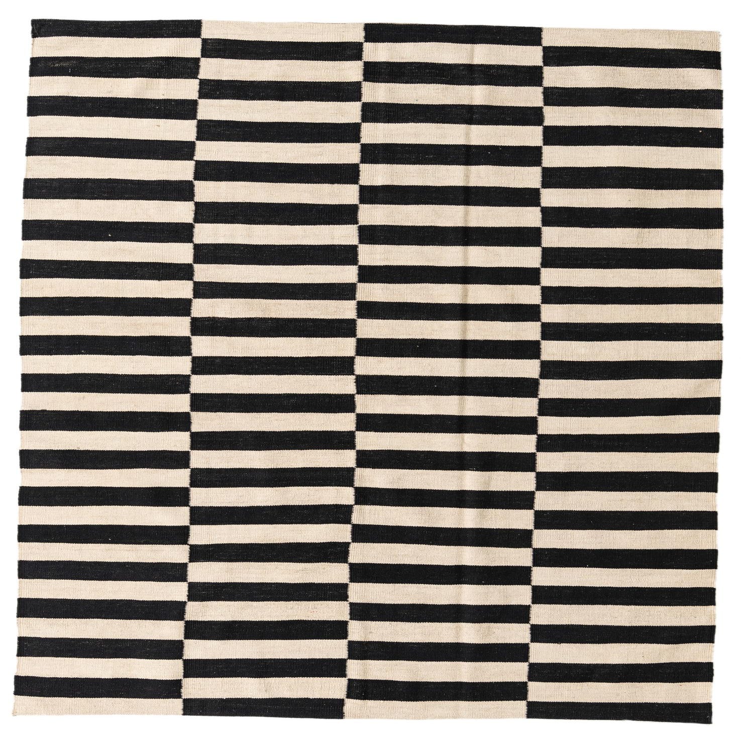 A 5x8 rectangular Kilim Modern rug with a bold black and ivory stripe pattern, perfect for a living room.
