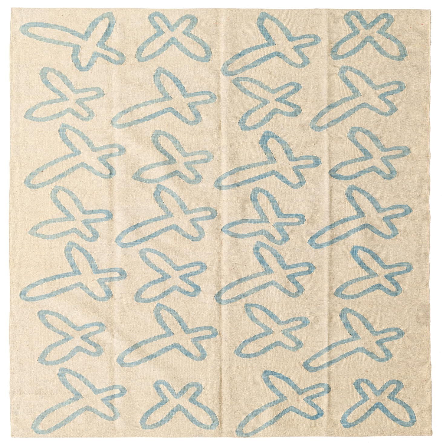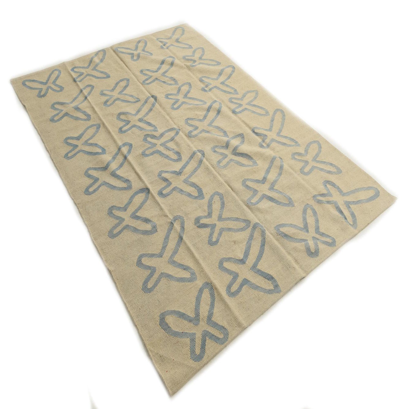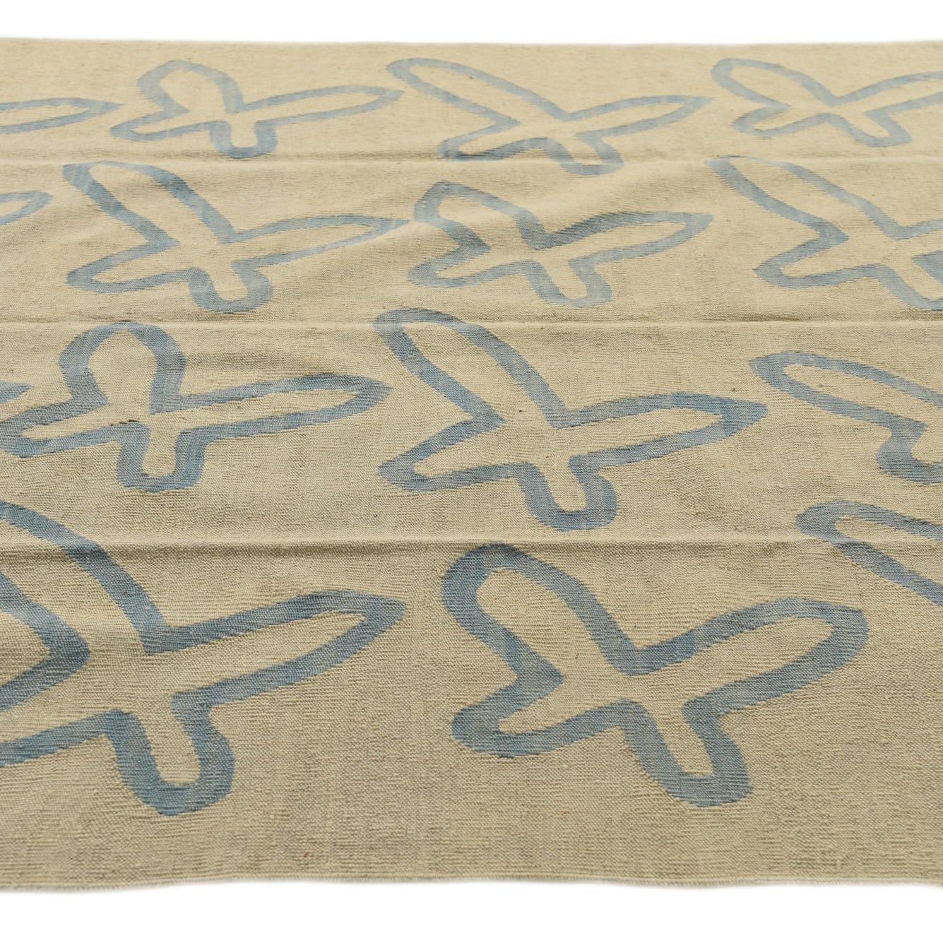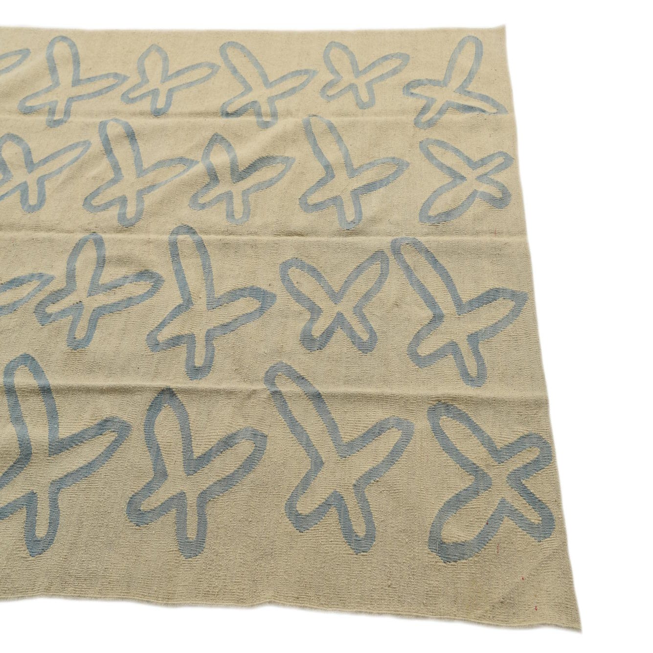A 5x8 rectangular ivory flatweave rug with a repeating light blue abstract tribal pattern, suitable for a modern living room.