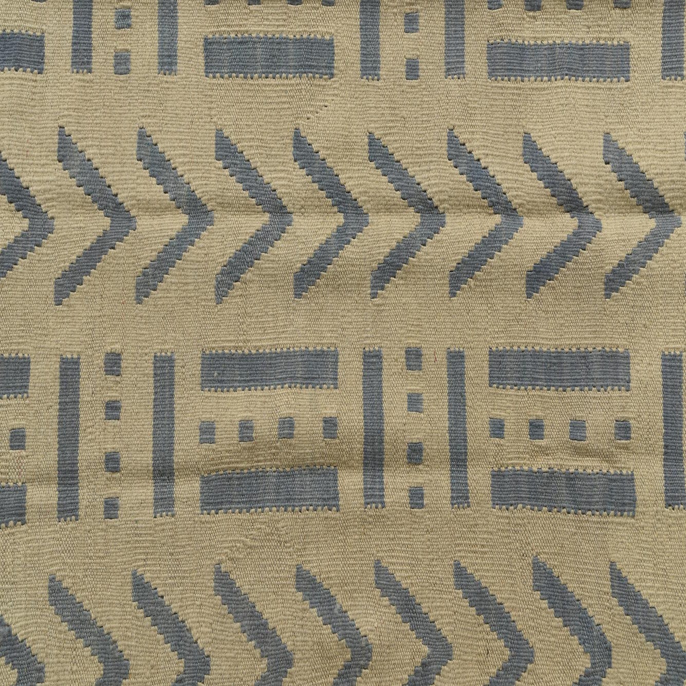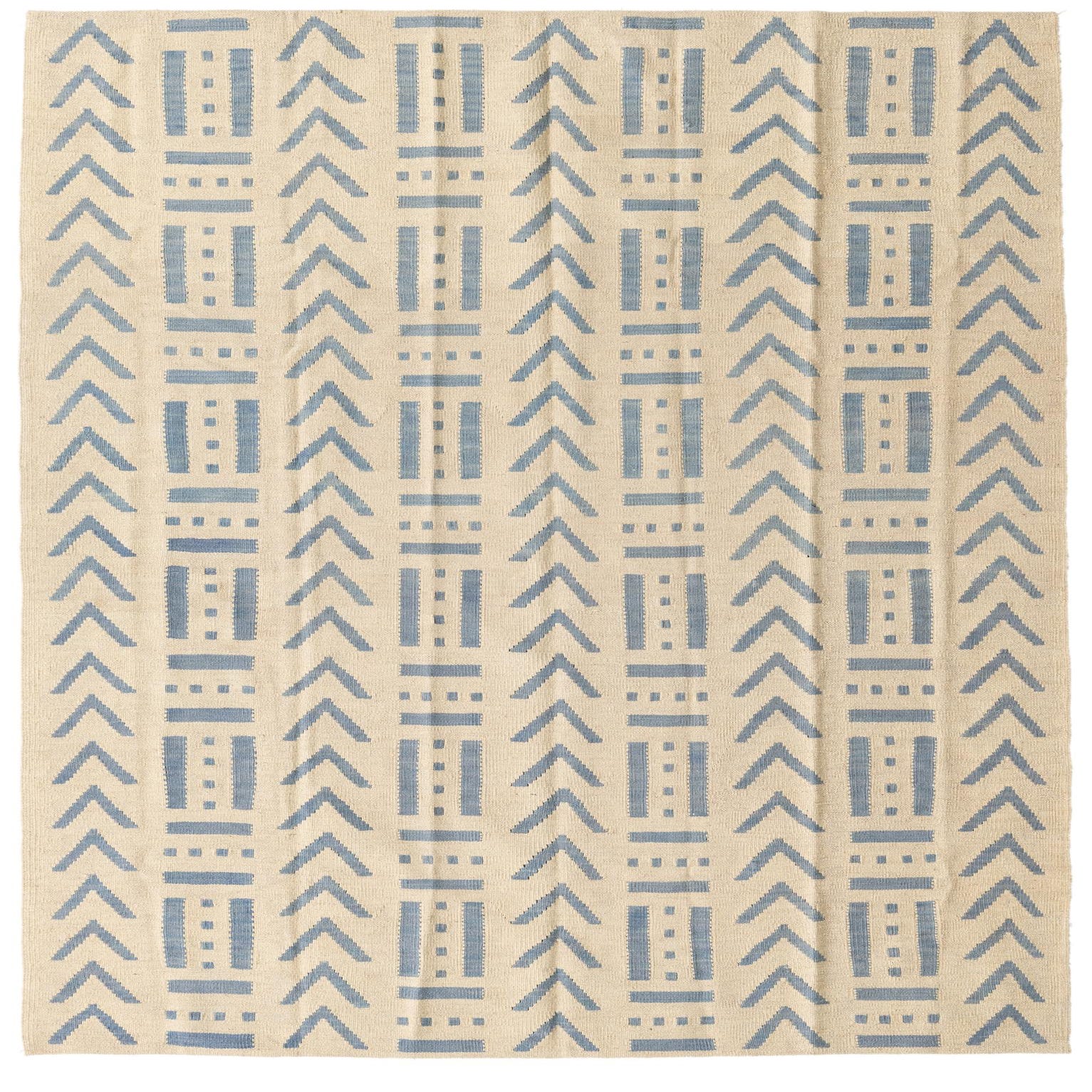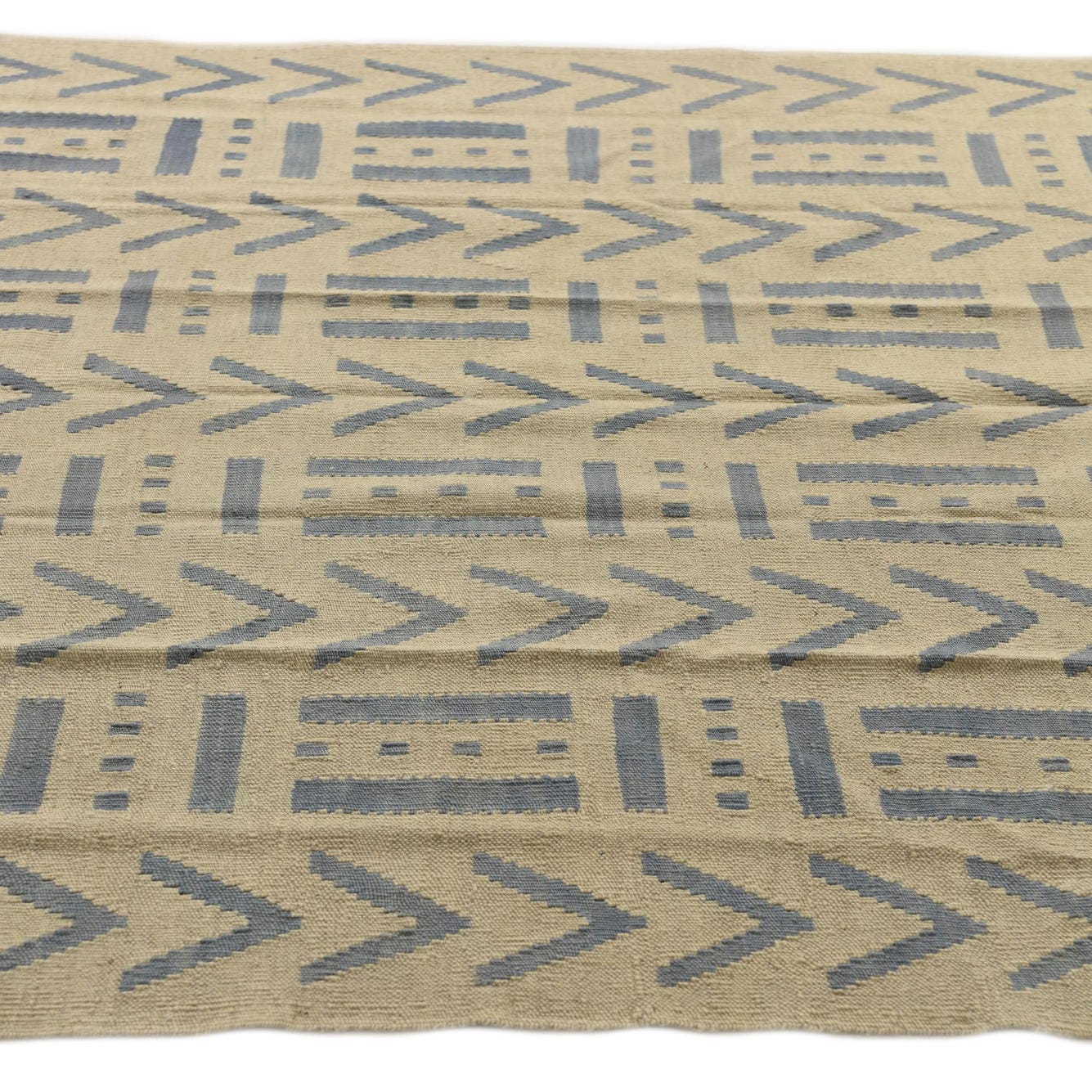 A 5x8 rectangular ivory and blue flatweave rug featuring a modern tribal pattern of arrows and dashes.