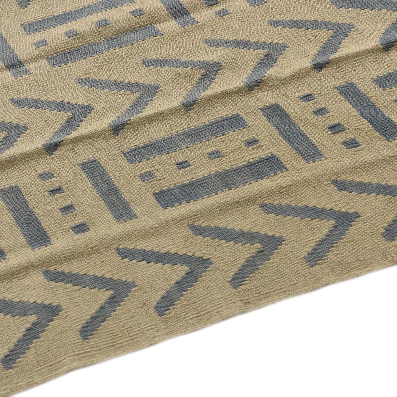 The Kilim Modern collection offers a contemporary rug that features a geometric pattern with linear motifs in a crisp blue accentuated against a neutral cream background. This 5x8 rug is hand-woven from 100% wool, providing a flatweave construction that grants a durable and tactile texture.