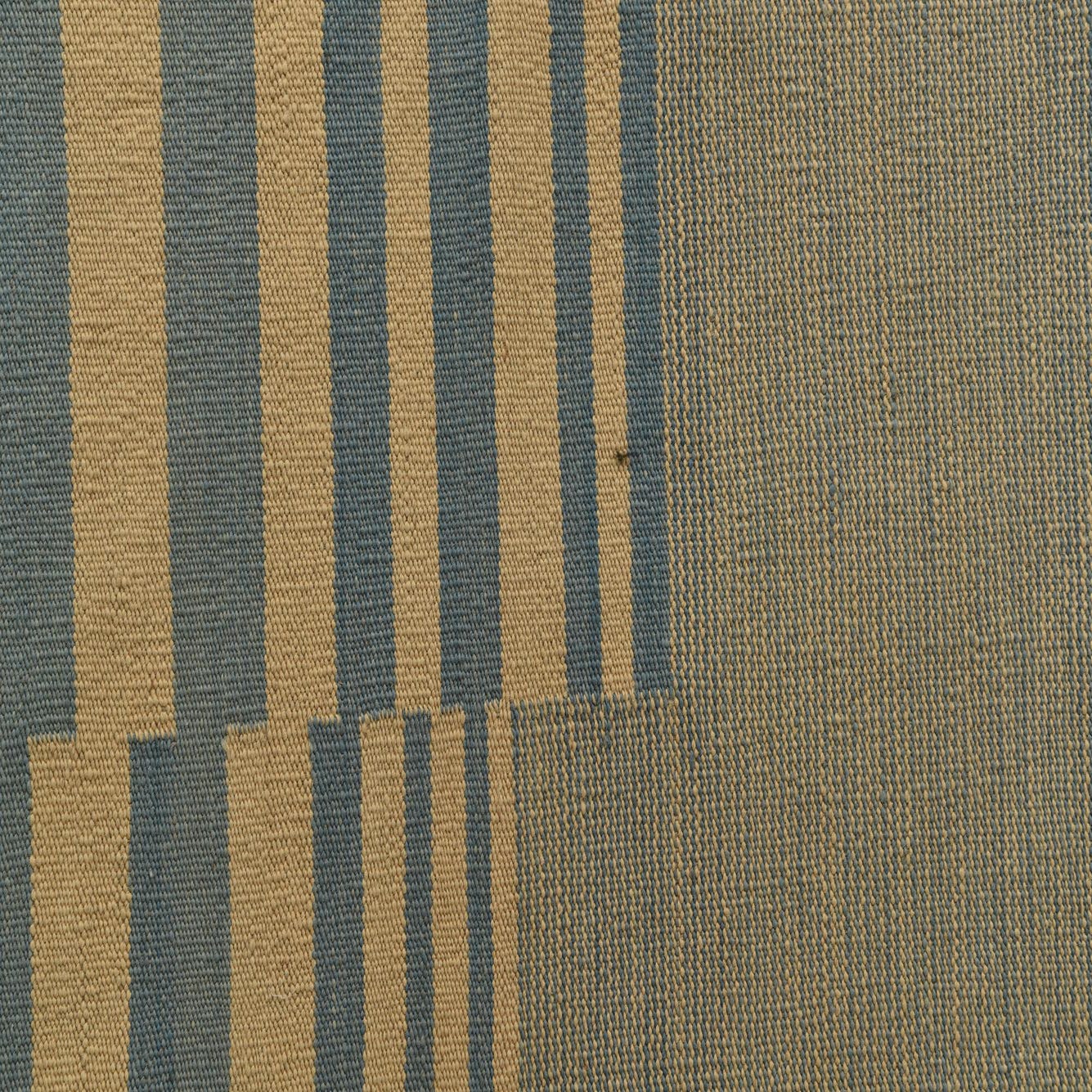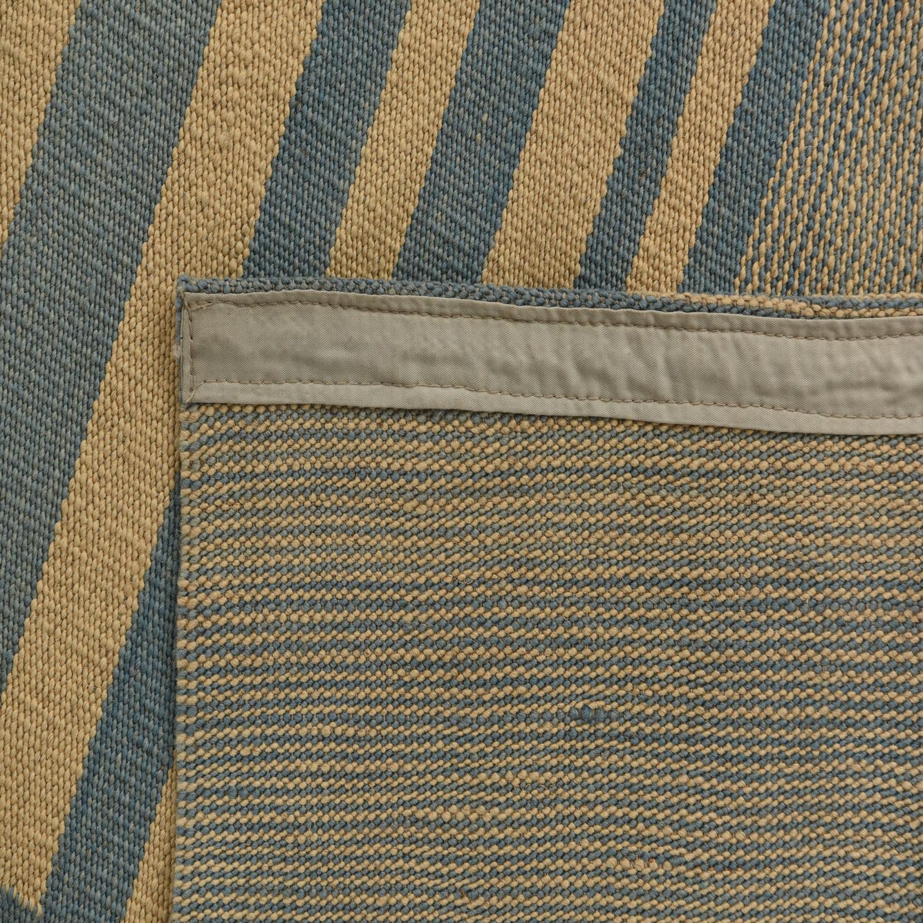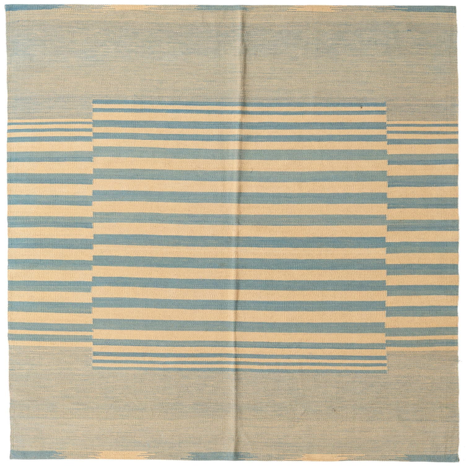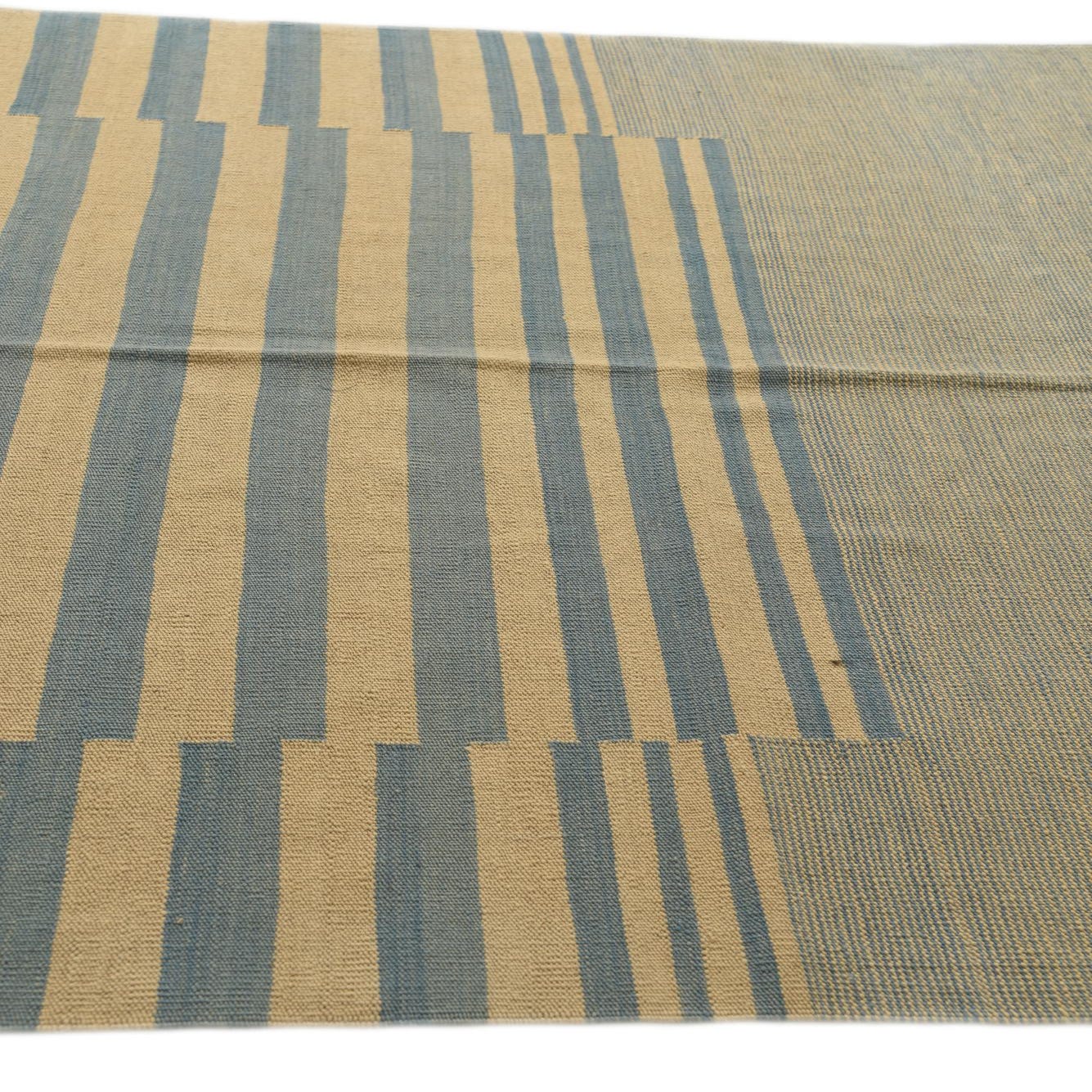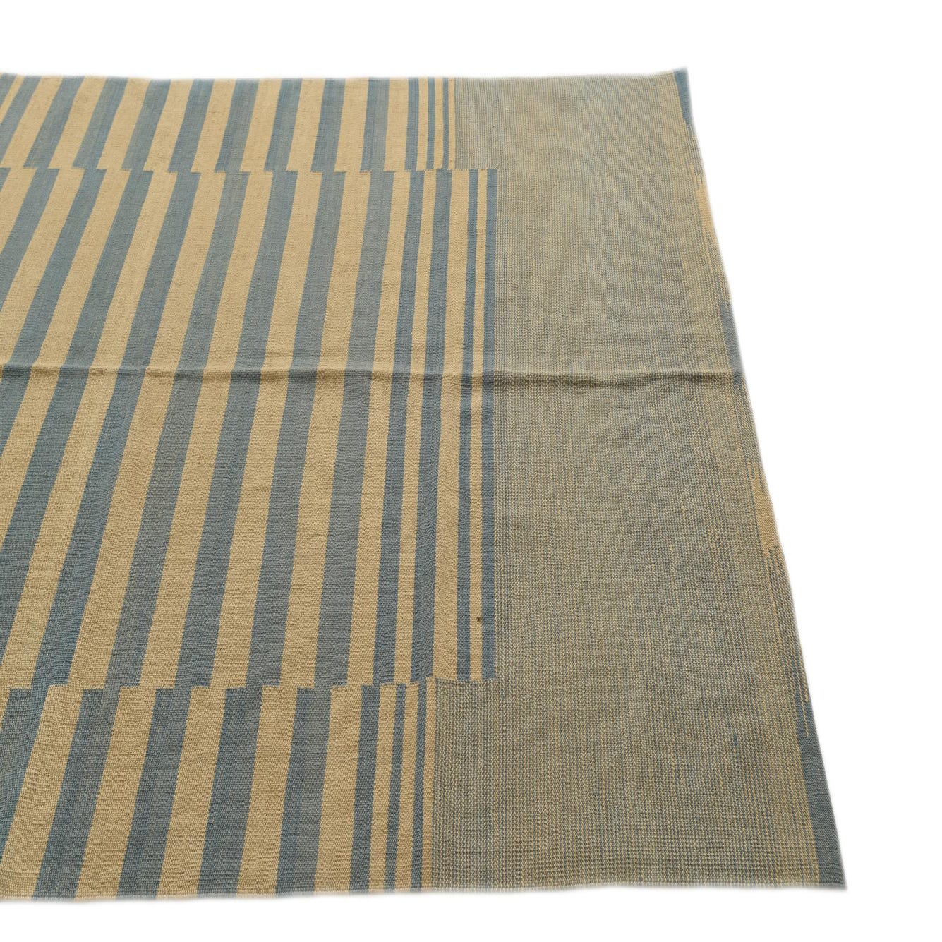 A 5x8 rectangular Kilim Modern rug with a central ivory and blue striped pattern, bordered by solid blue-cream sections.