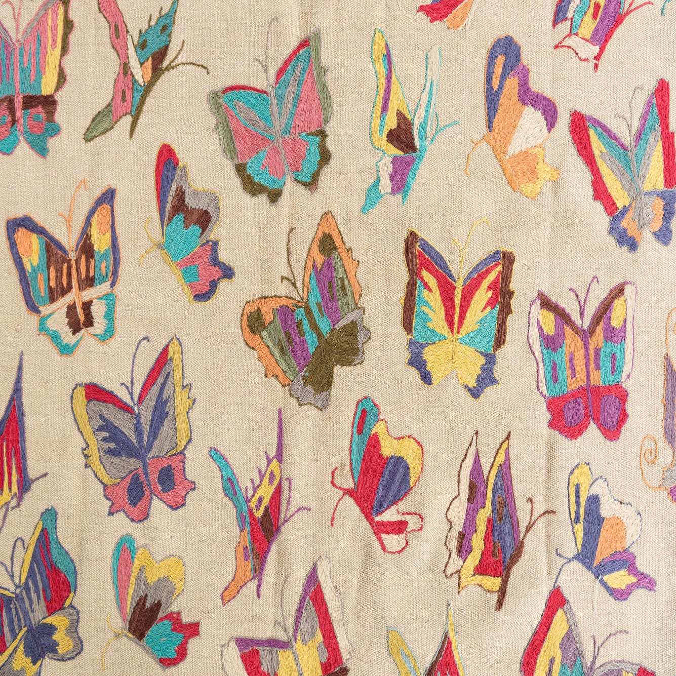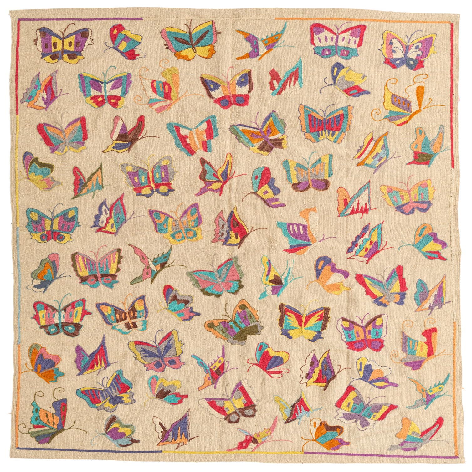 A cream field punctuated with lively butterfly motifs in beige, blue, brown, yellow, red, violet, olive and orange gives this hand-woven 100% wool rug a warm, approachable presence. The design has a folk-art quality—individual butterflies vary in shape and color so the surface feels dynamic without overcrowding. The flatweave construction has a low profile underfoot, while the densely worked motifs add a gentle, tactile contrast you can feel when you run your hand across the pile. A simple narrow border in complementary hues frames the composition and keeps the look grounded.