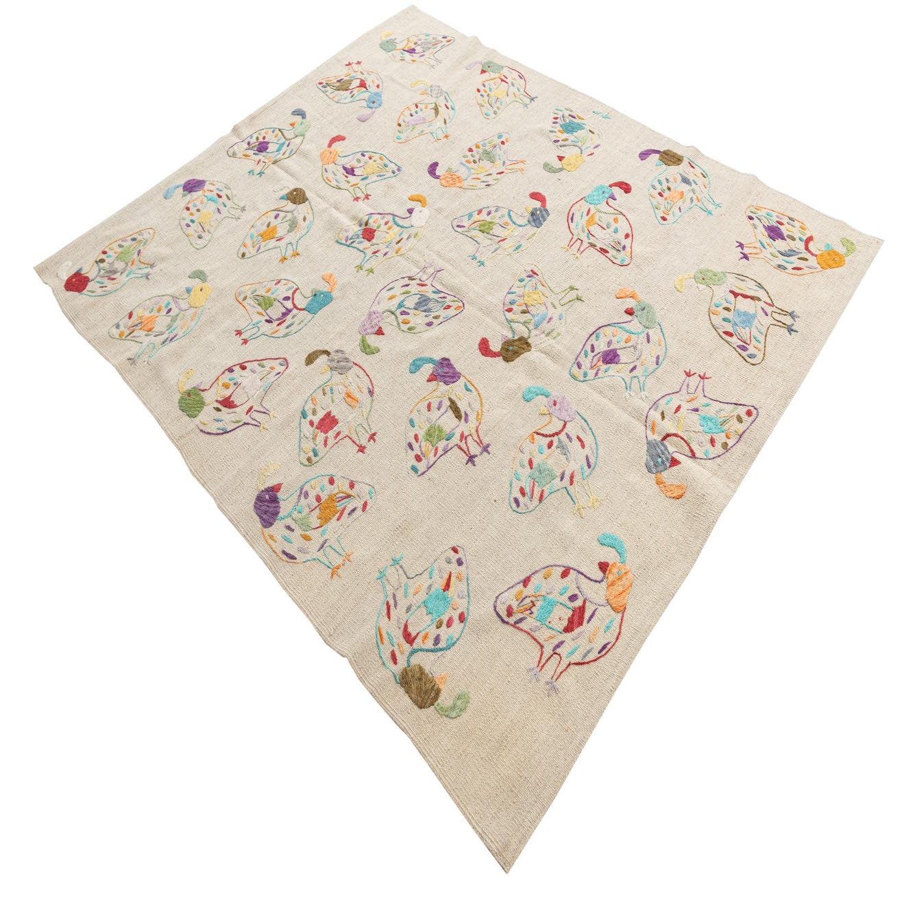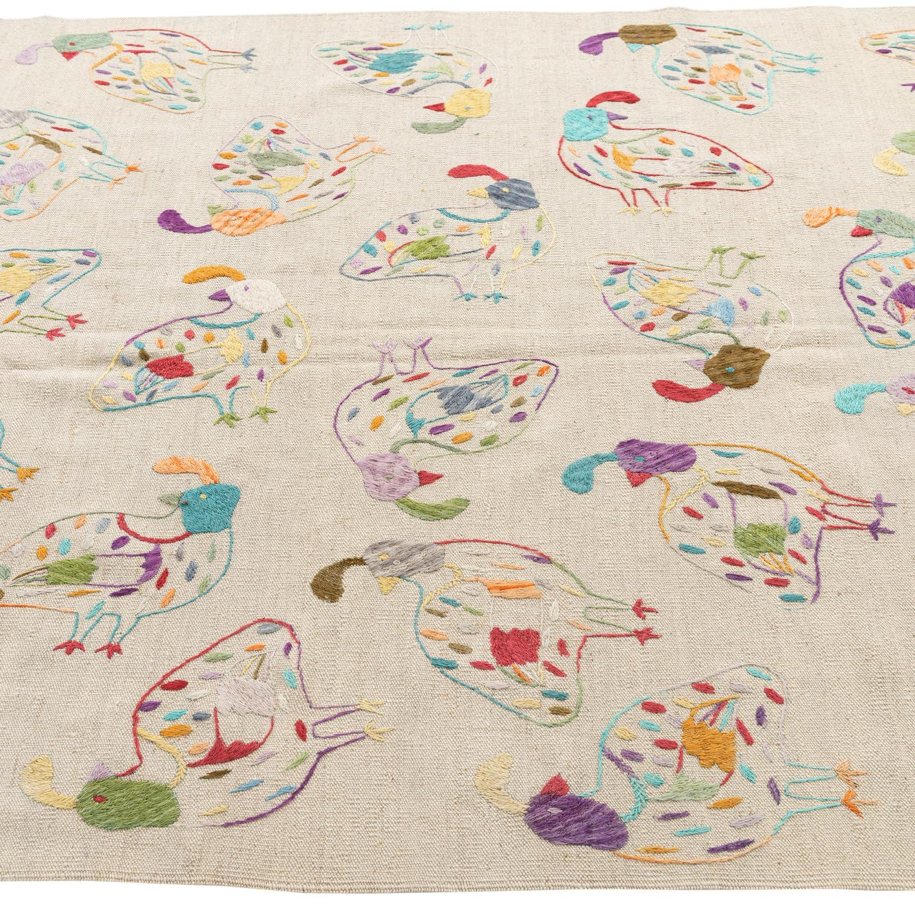 The Kilim Suzani collection presents a 5x8 hand-woven rug crafted from 100% wool, offering a flatweave texture that is durable and suitable for high-traffic areas. The pattern of this rug displays a playful yet sophisticated array of stylized bird motifs, rendered in a diverse palette including cream, beige, blue, brown, gray, green, olive, red, yellow, and violet, all set against a calming cream background.
