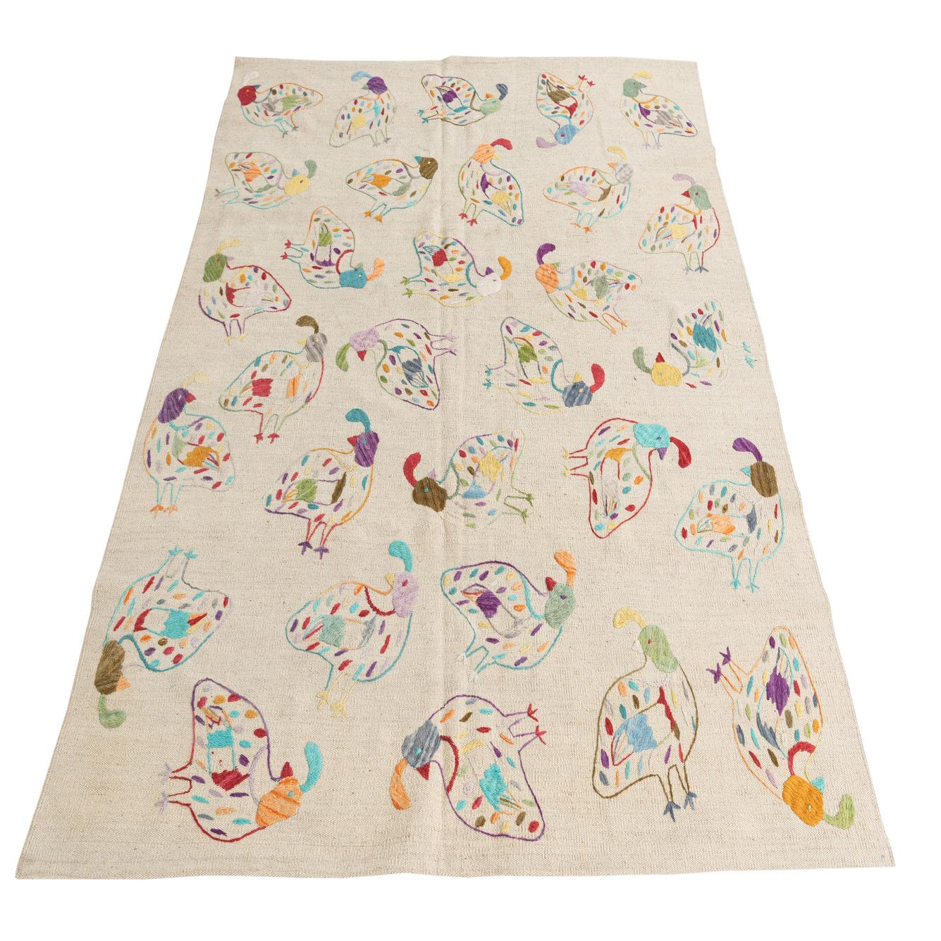 A 5x8 rectangular ivory wool rug featuring a colorful, repeating tribal bird pattern in various hues.