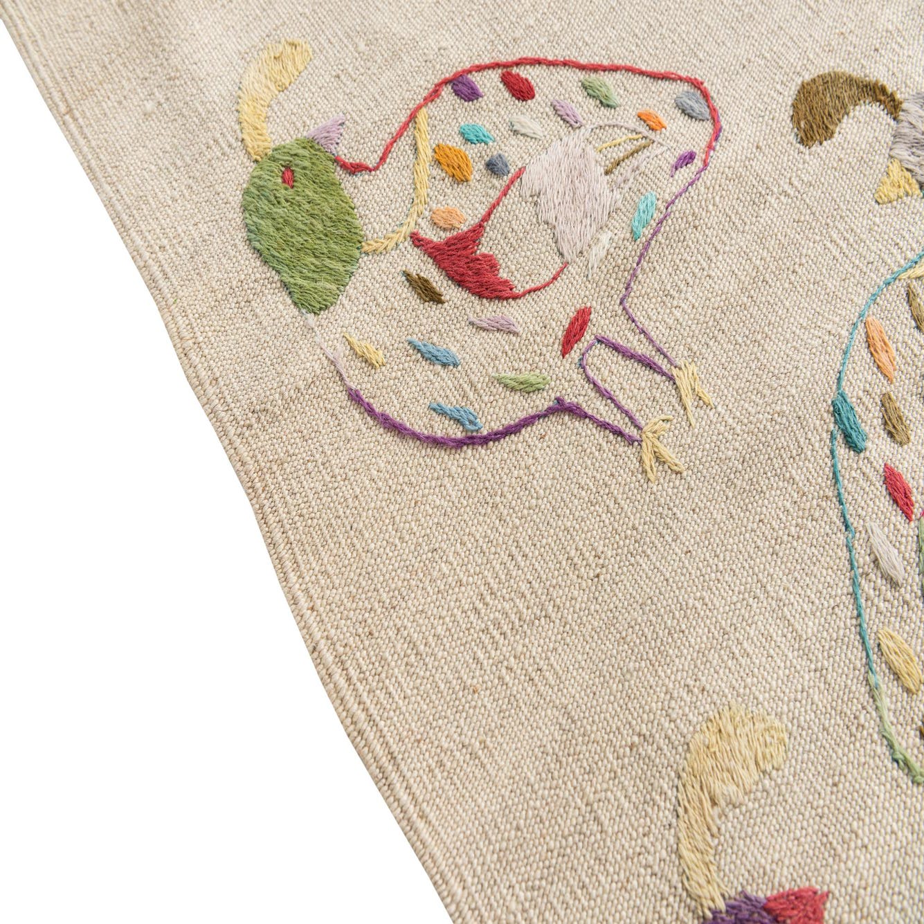 This tapestry of colors makes for a versatile and charming centerpiece that is bound to become a focal point in any space it inhabits. With its whimsical pattern, this rug would blend seamlessly into interiors that embrace bohemian chic, eclectic, or even contemporary aesthetics. Its flatweave texture can complement spaces with a preference for natural materials and artisanal flair.