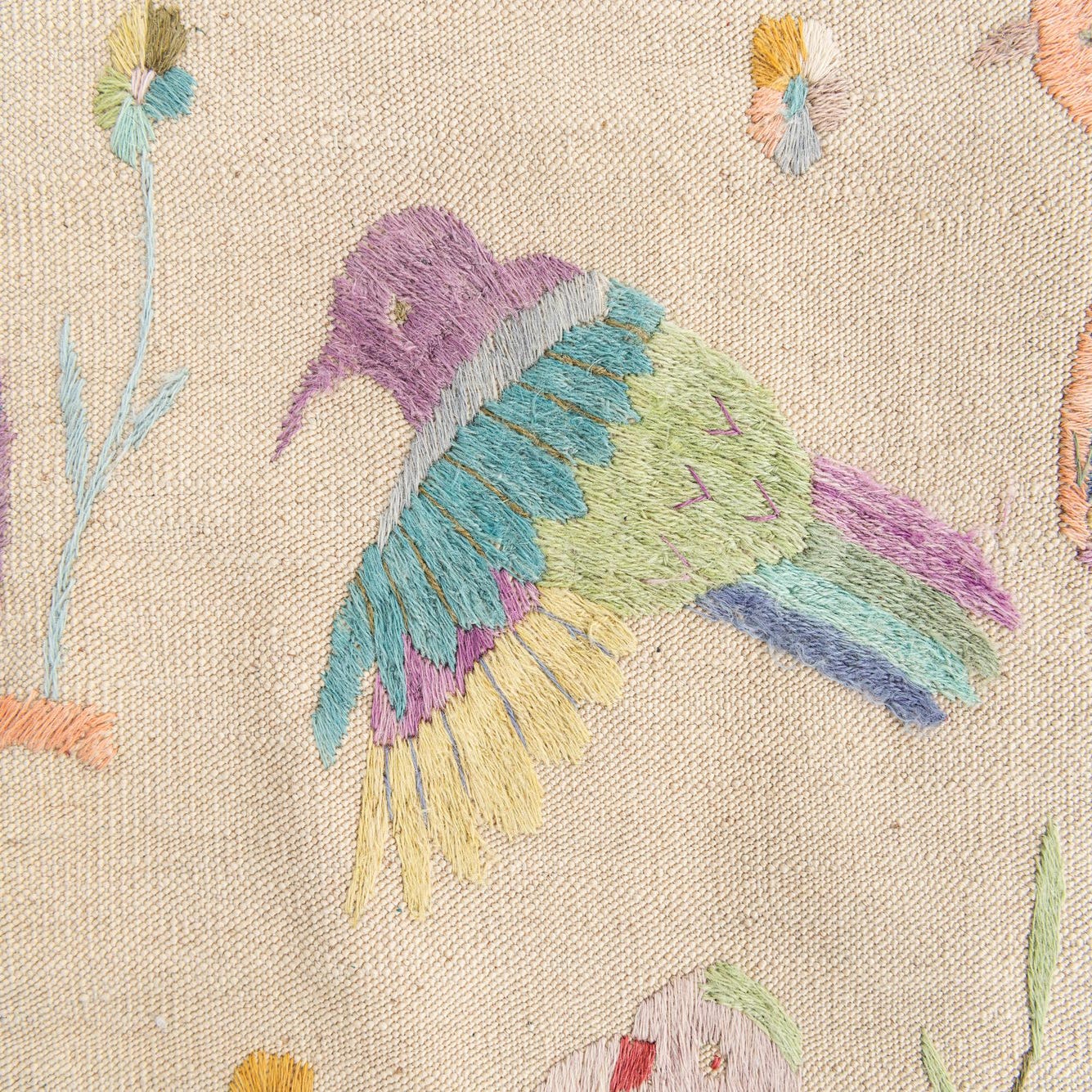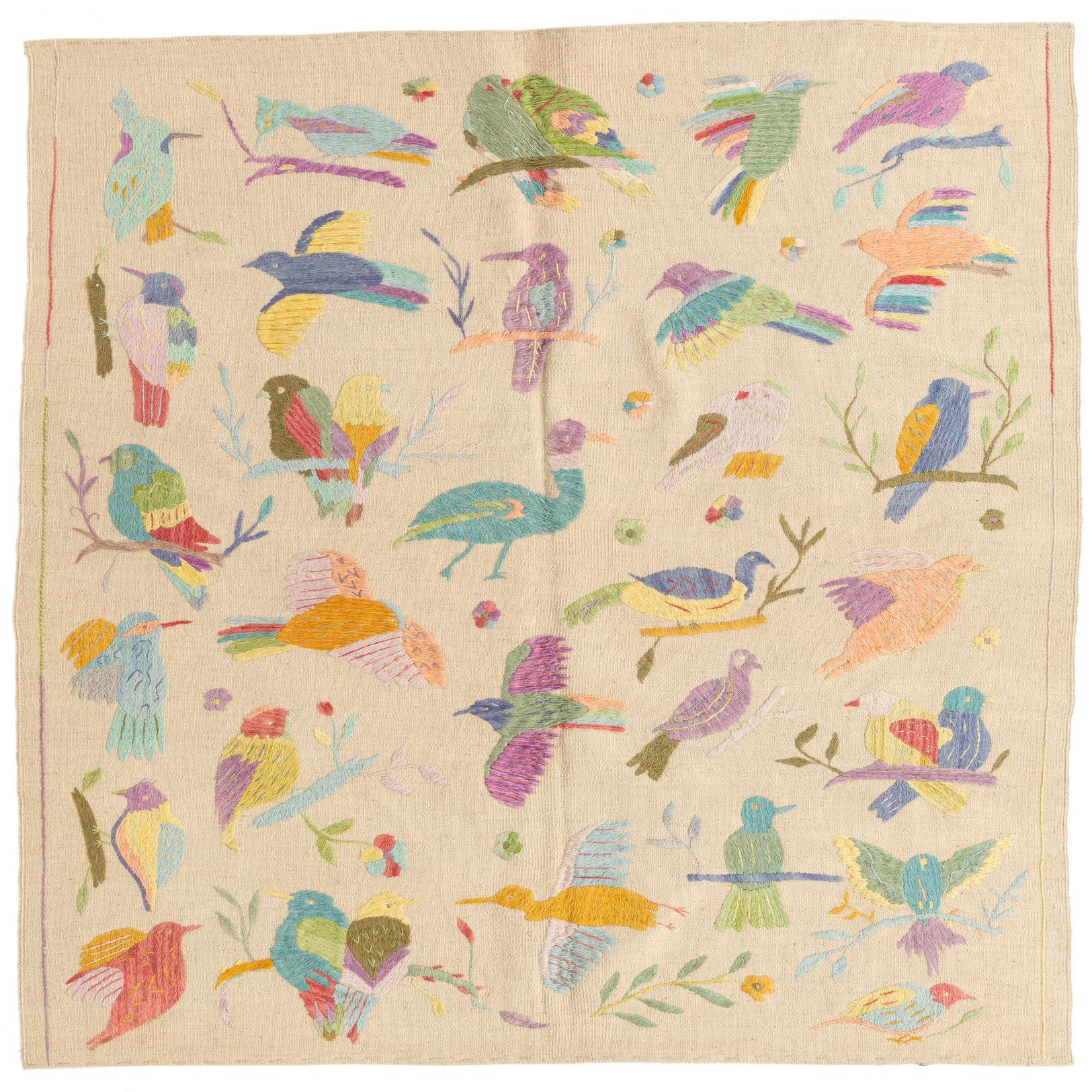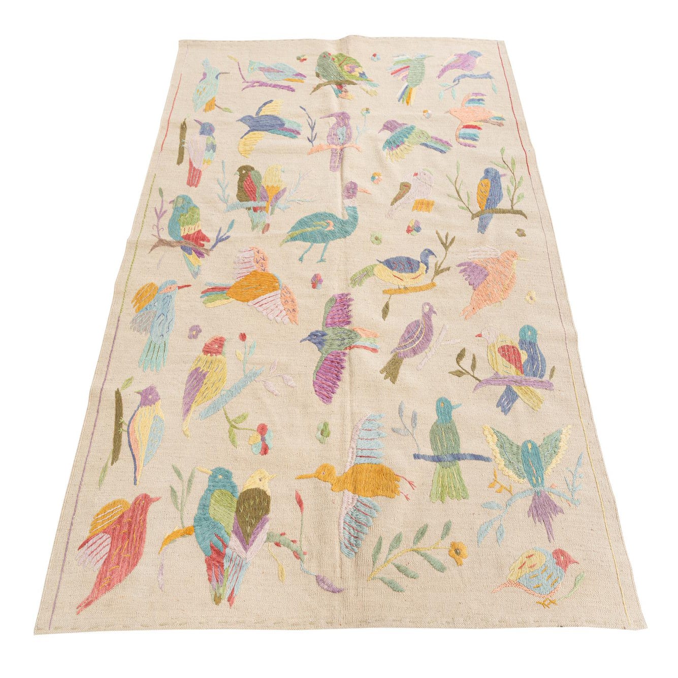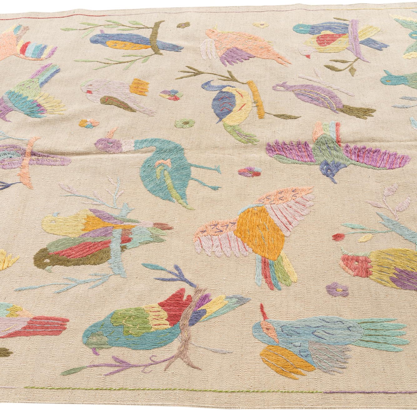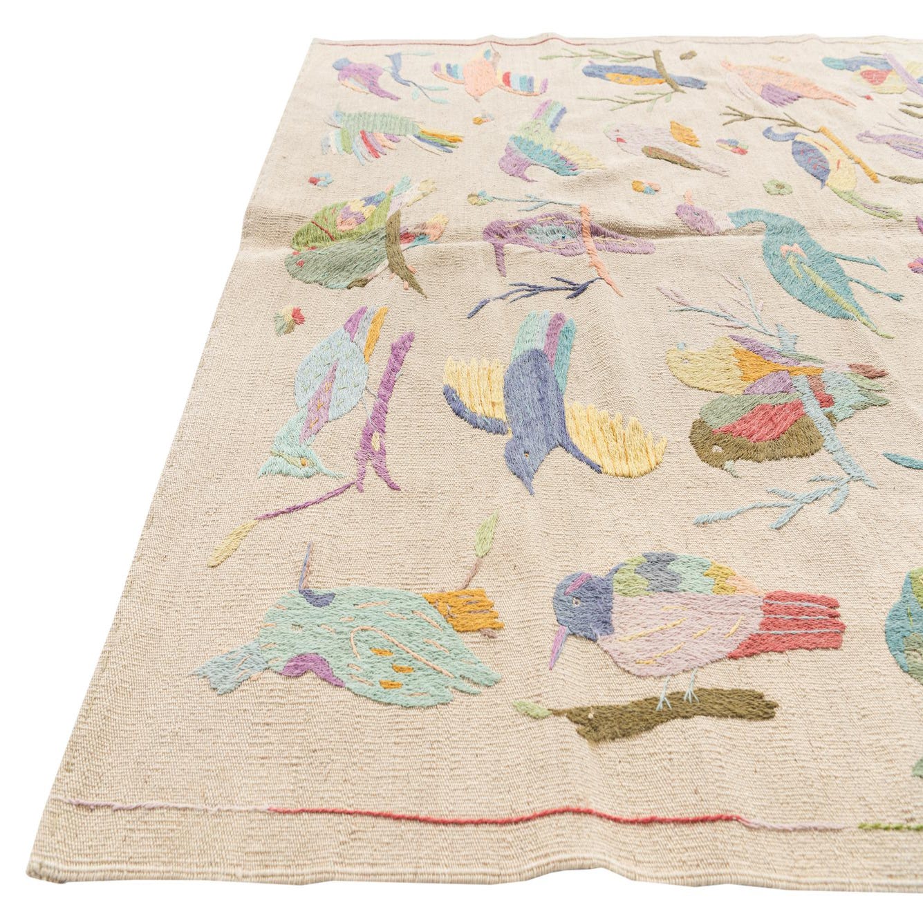 A 5x8 rectangular ivory flatweave rug featuring a vibrant, multicolored tribal bird pattern, perfect for a living room.