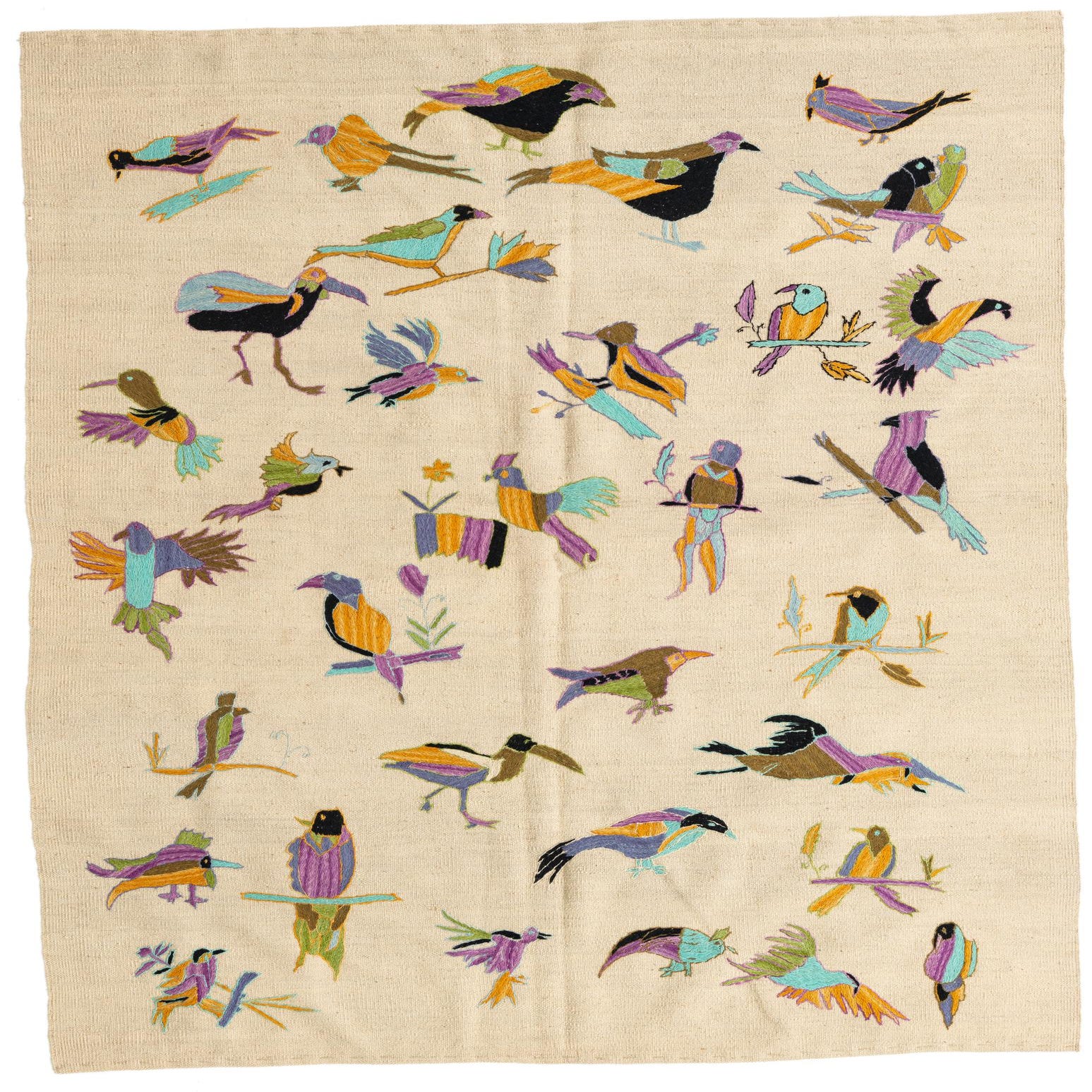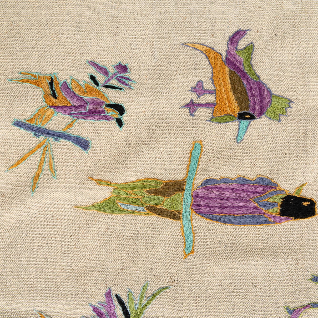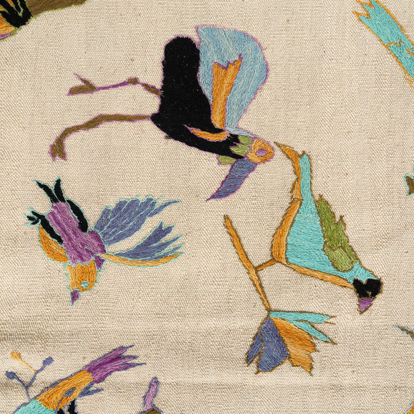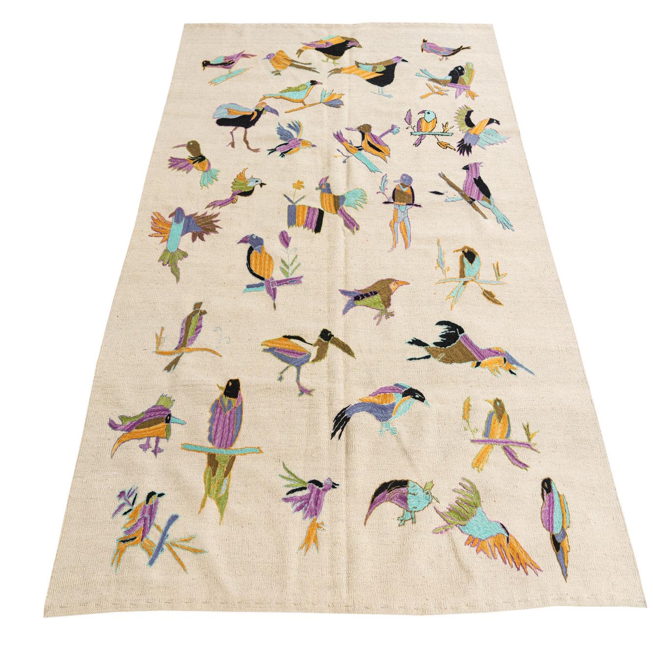 A 5x8 rectangular ivory flatweave rug featuring a vibrant, multicolored tribal bird pattern, suitable for a living room.