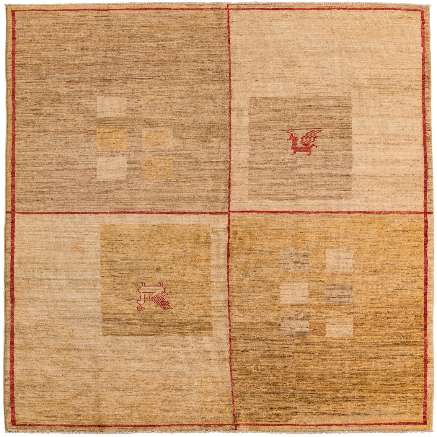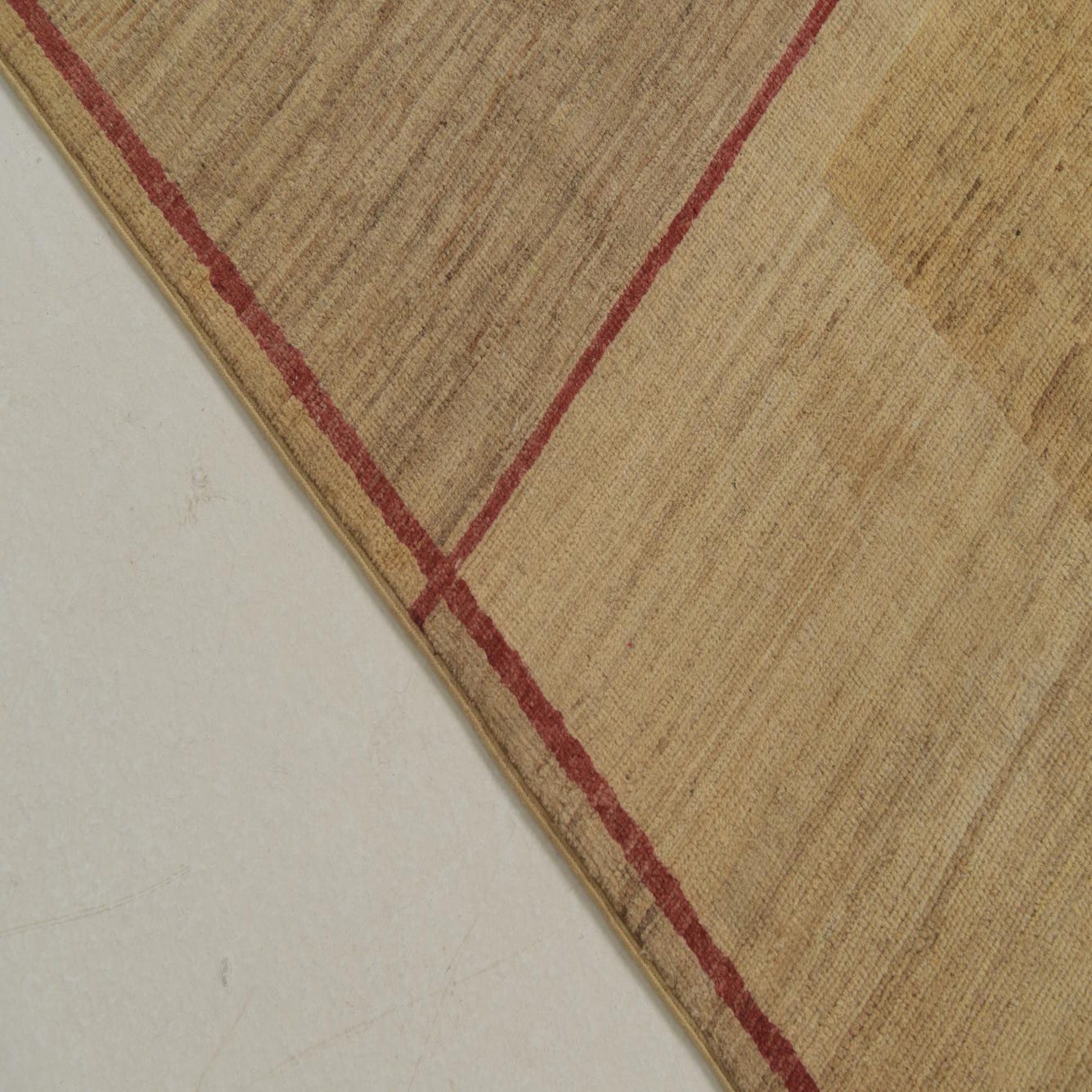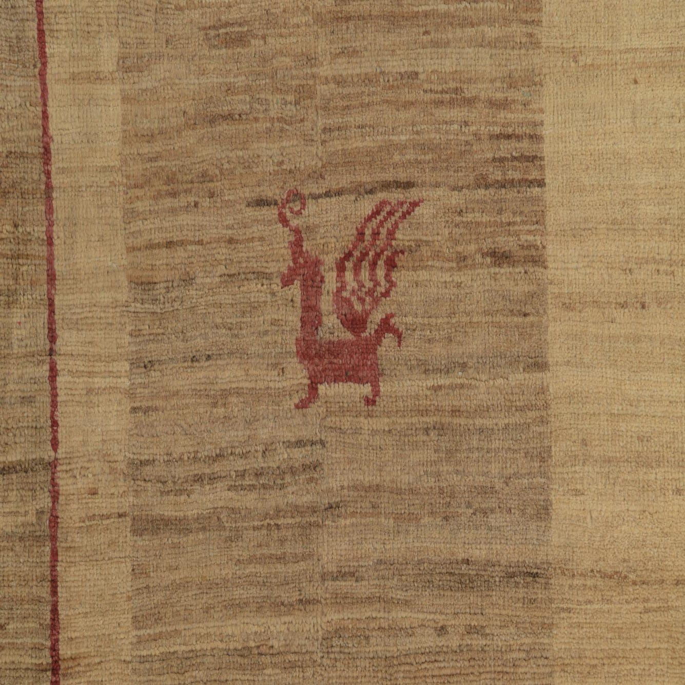 This Modern Ziegler rug boasts a balanced cream background with a subtle geometric pattern, accented by hues of brown, red, light brown, and ivory. The pattern consists of delicately varied tonal blocks that create a contemporary design with a nod to traditional motifs, as evidenced by the two stylized animal figures in red that add a distinctive character to the overall aesthetic. Hand-knotted from 100% hand-spun wool, the rug offers an inviting texture, indicative of careful craftsmanship and quality materials.
