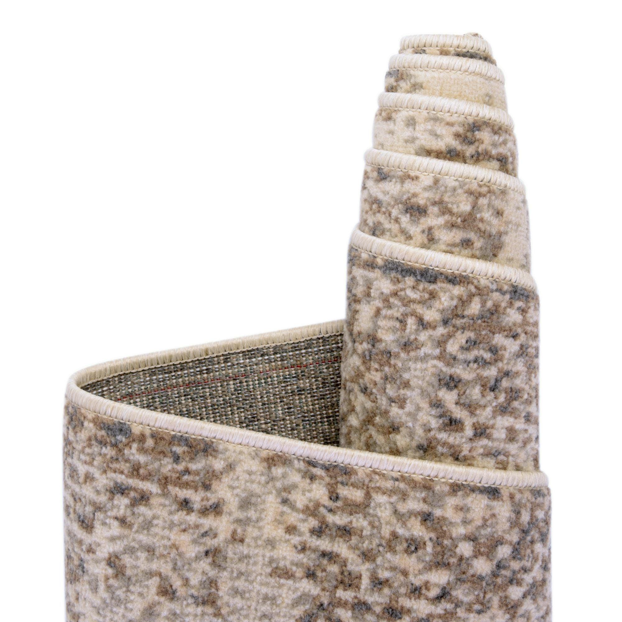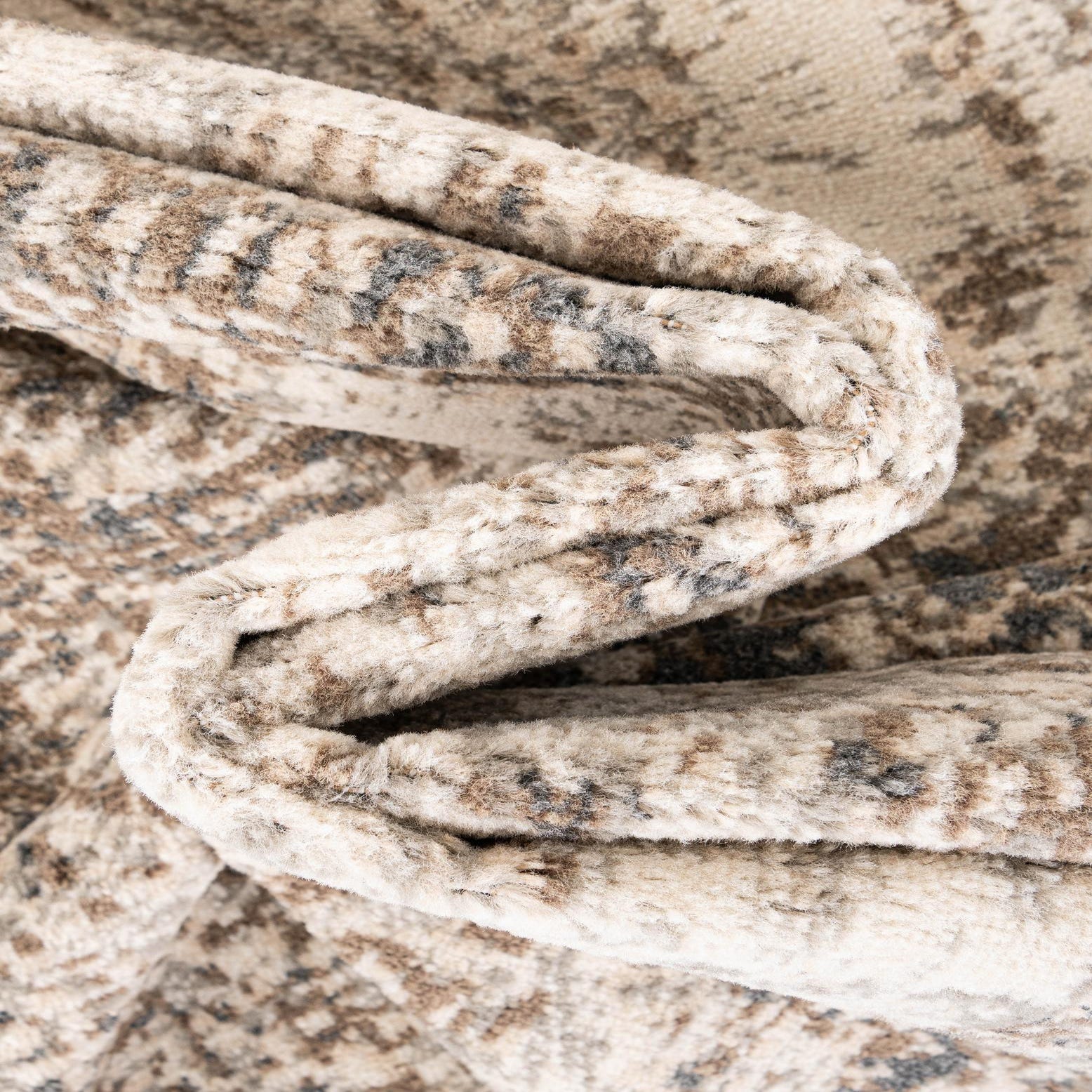 A soft cream field provides a neutral backdrop for a layered, distressed abstract pattern in beige, brown and gray. The design reads as weathered and slightly mottled, with scattered linear and block-like textures that give the rug visual depth without a defined medallion or border. Machine-made from 100% polypropylene, the construction produces a low, even surface that feels smooth underfoot while keeping the pattern crisp and consistent.