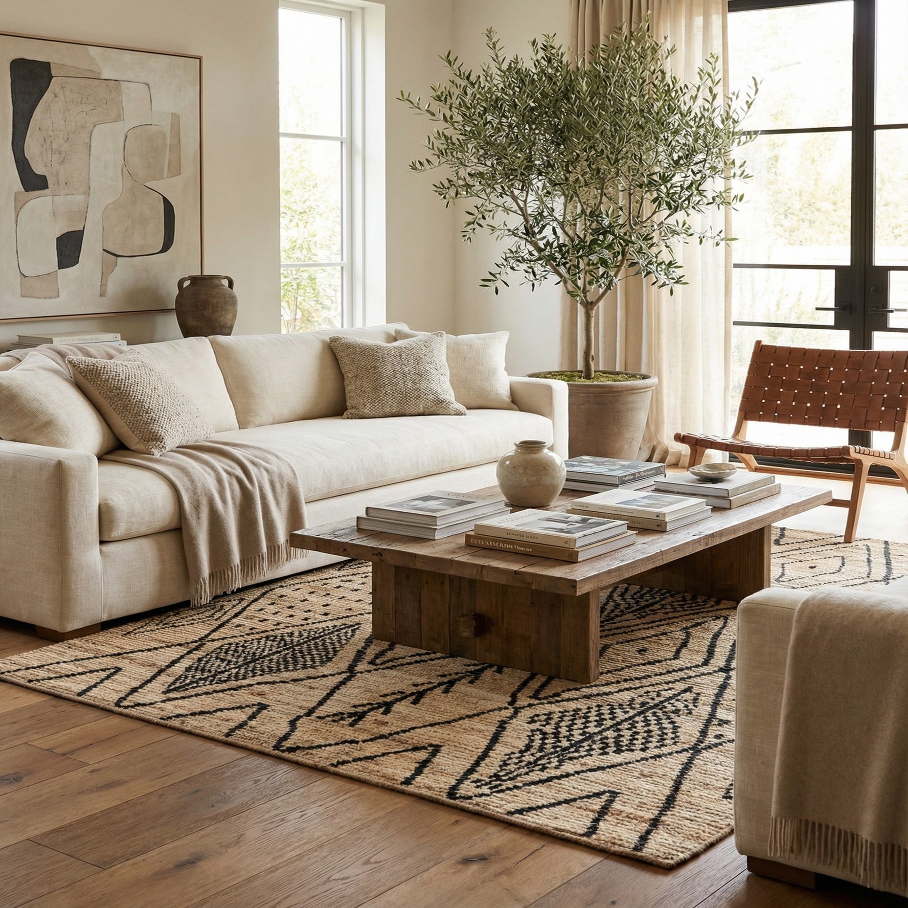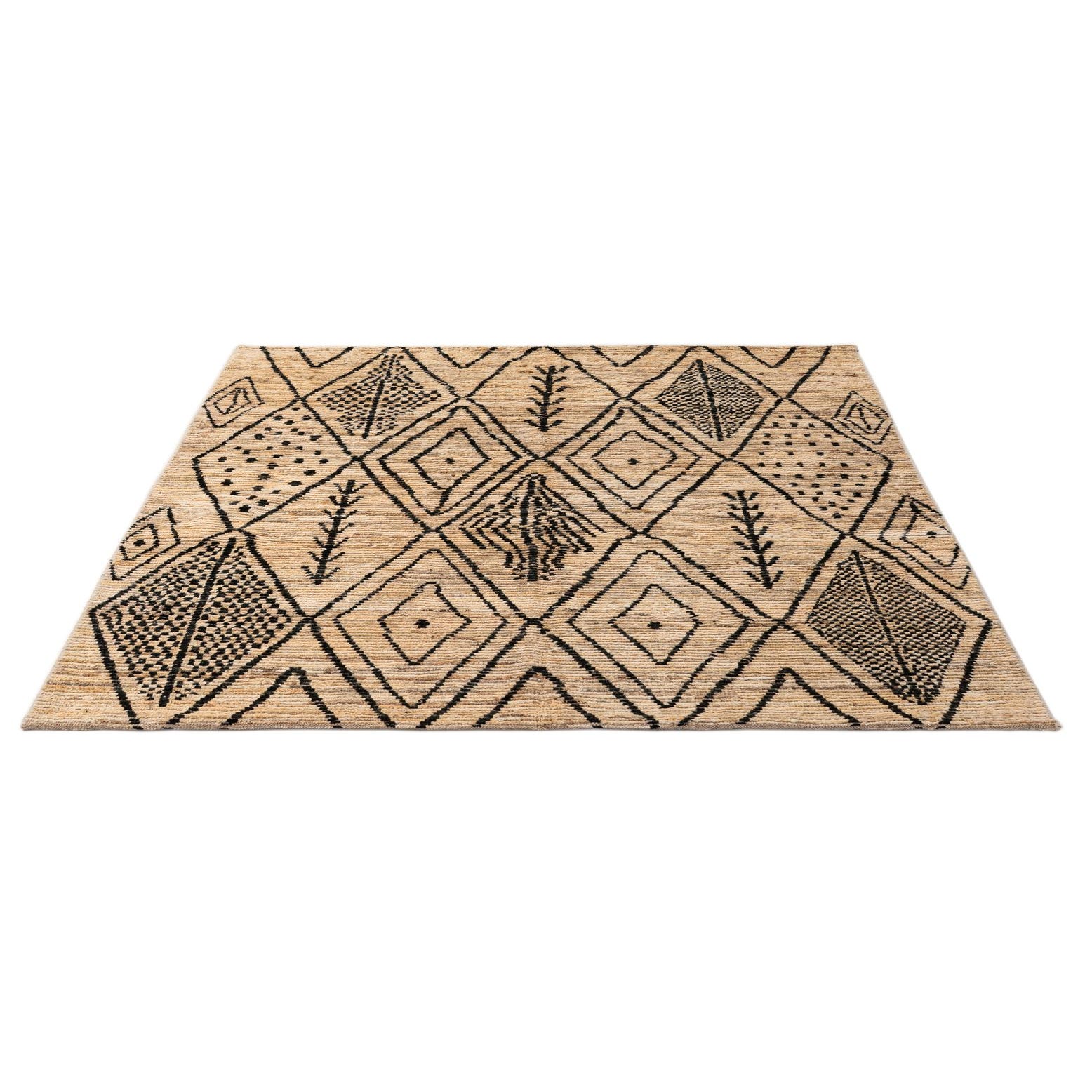 A 5x8 rectangular ivory wool rug with a black tribal diamond and arrow pattern, suitable for a living room.