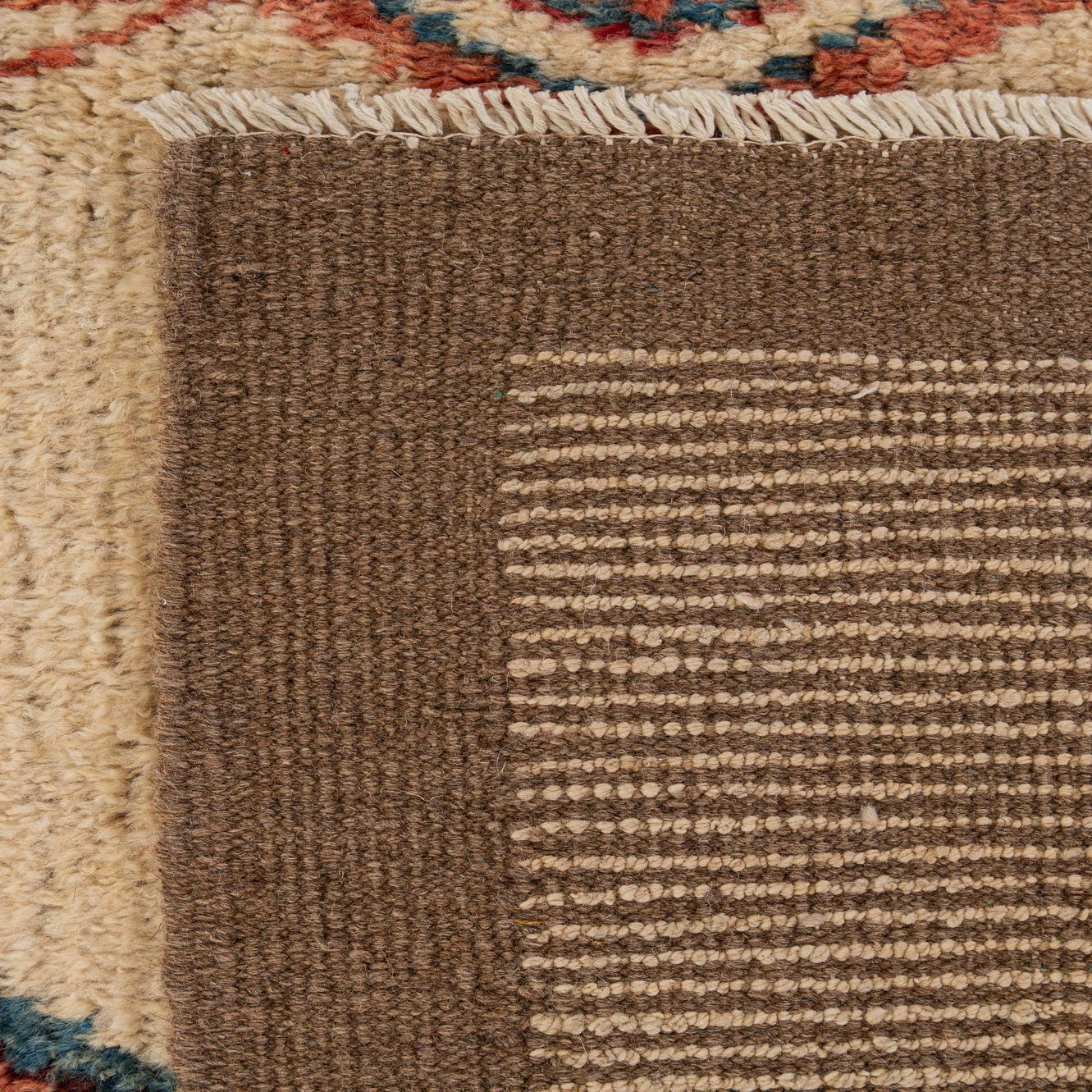 Primary color is Cream. Colors in this rug include: Cream, Blue, Brown, Red, Burgundy.