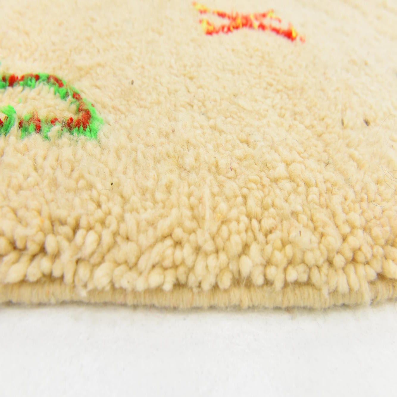 Hand-knotted in 100% wool, the pile is plush and dense with a comfortable, springy feel underfoot and subtle variations where the colored knots rise from the main field. A short fringe completes the edges and reinforces the artisanal quality. This rug works well layered under a coffee table in a living room, as an anchor in a cozy reading nook or at the foot of a bed; it pairs especially nicely with midcentury modern furnishings for contrast, with bohemian or global-inspired decor to echo the motifs, or with neutral Scandinavian interiors when you want a touch of color without overpowering the space.