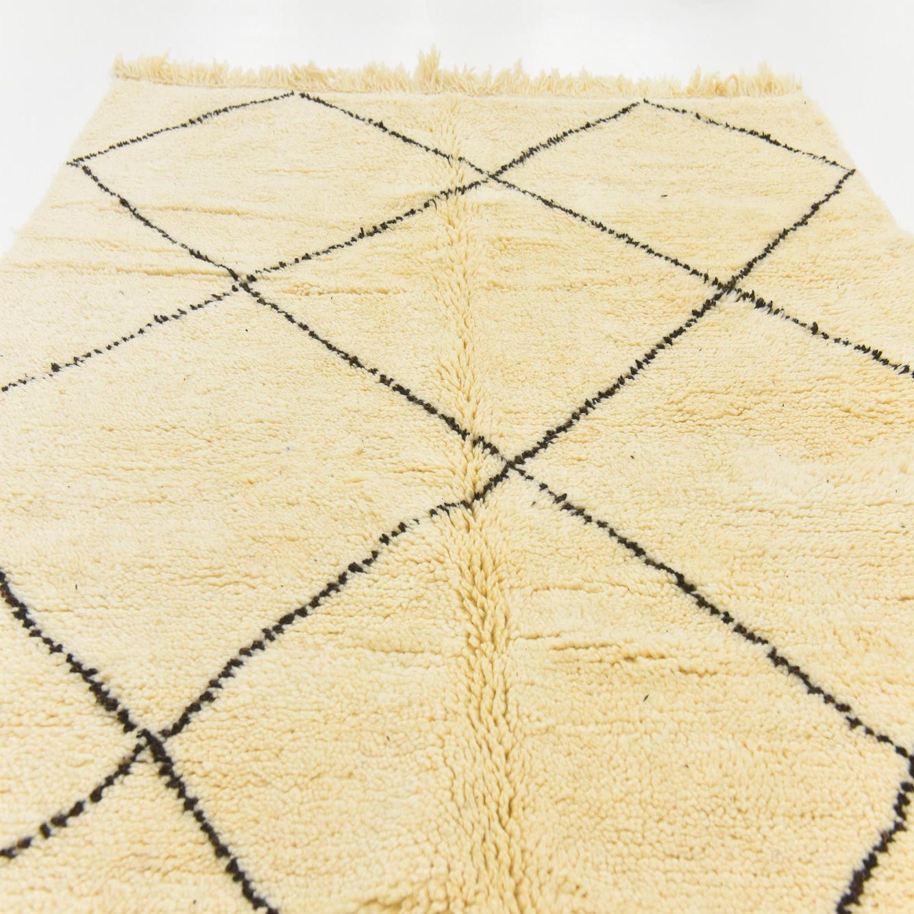 This Moroccan collection rug is a hand-knotted piece, made with 100% wool that offers a durable and plush texture, with a size of 5x8, making it a versatile floor covering for a variety of room settings. The rug features a cream background, providing a neutral base that is punctuated by a simple, yet bold, geometric black diamond pattern. This contrasting color scheme adds visual interest without overwhelming a room's aesthetic.