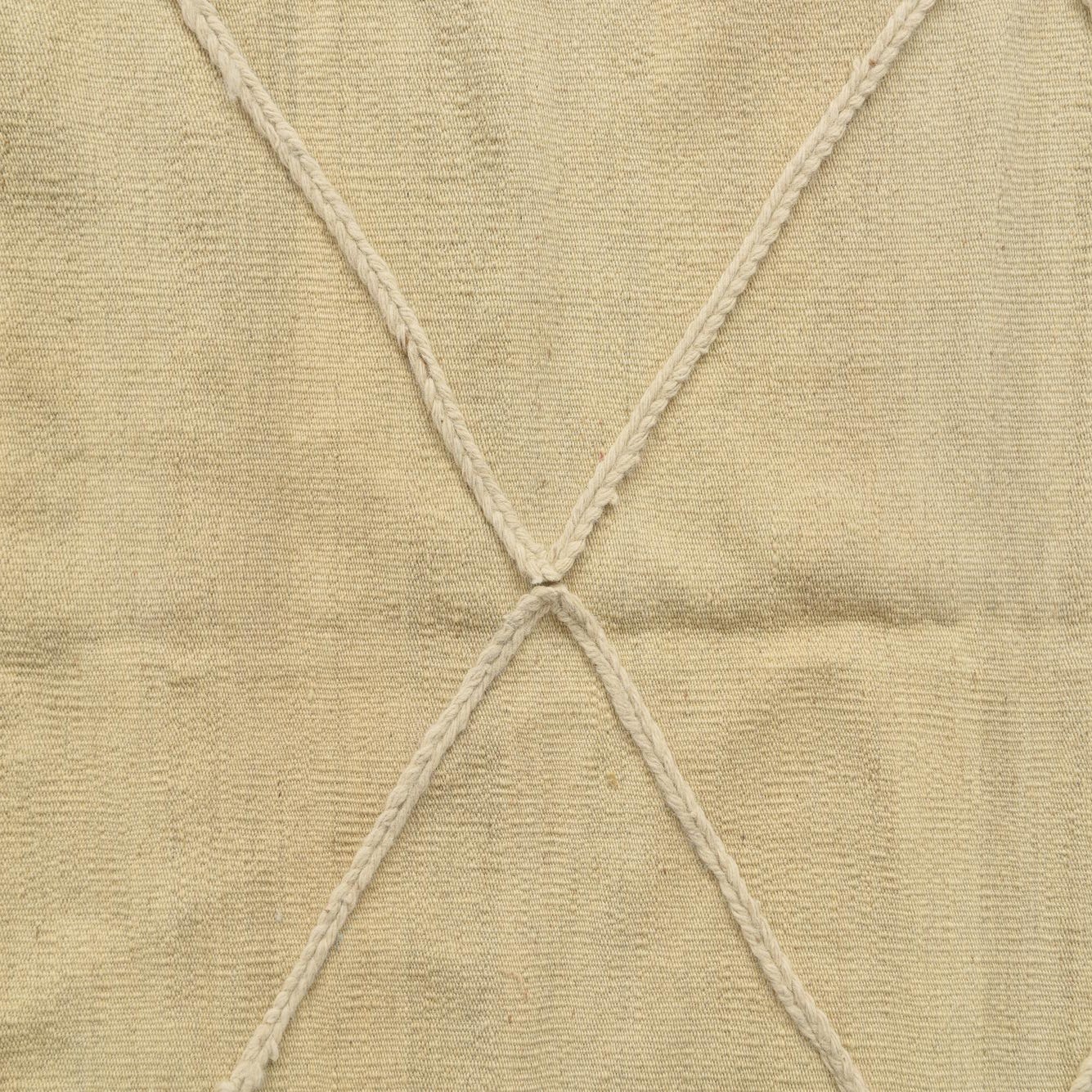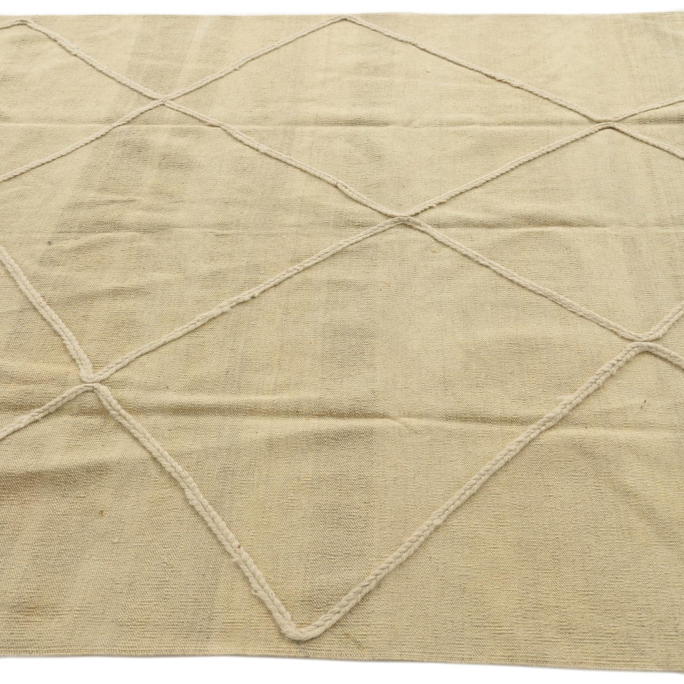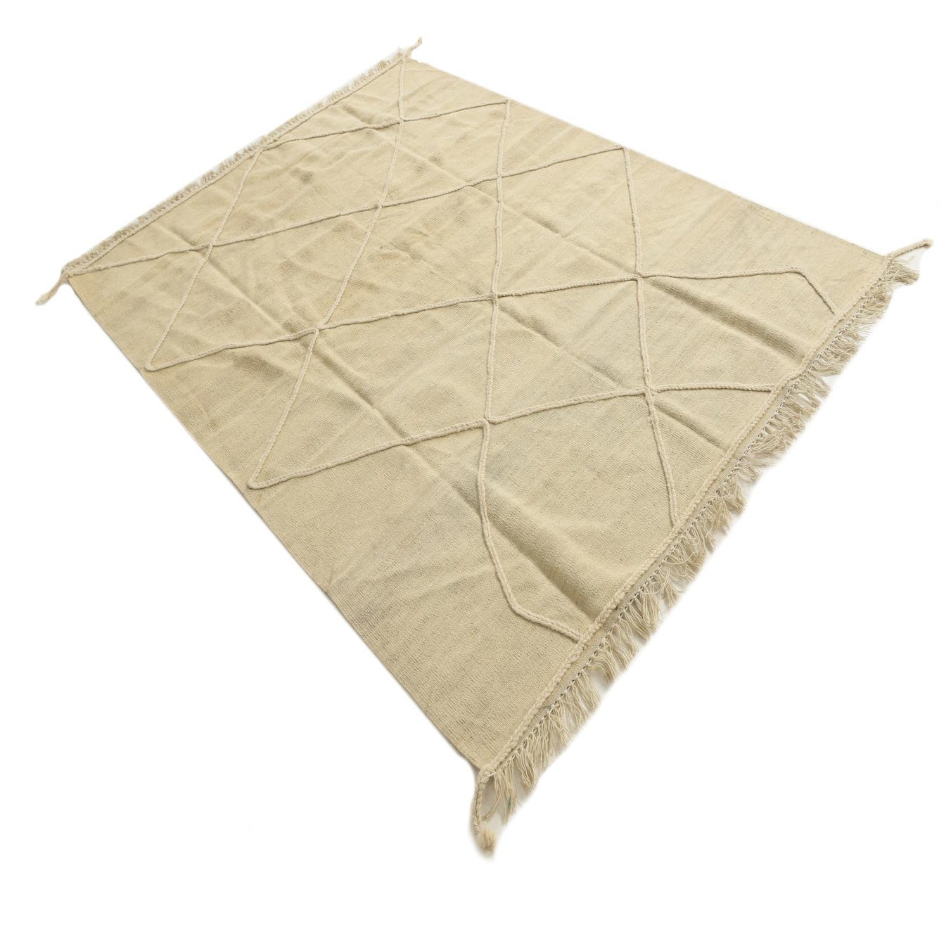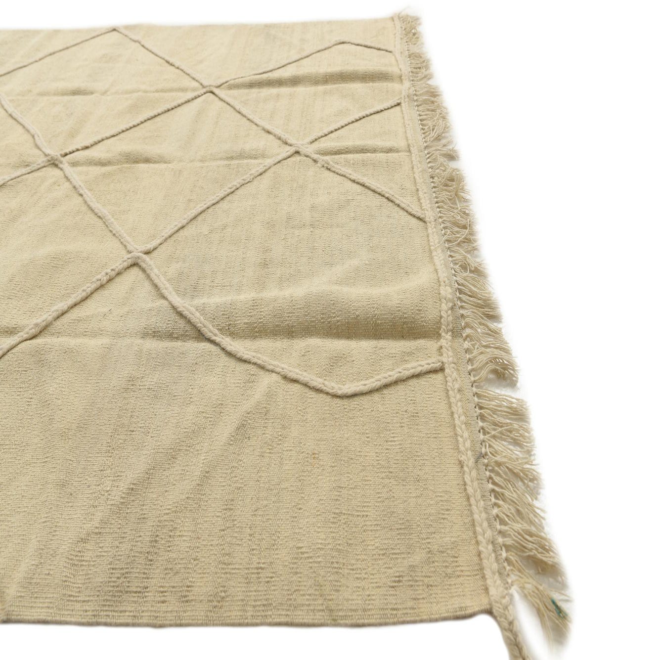 This hand-knotted Moroccan rug, measuring 5x8, is crafted from 100% wool, offering a soft and durable texture that is pleasing to the touch. The rug features a cream background with a minimalistic and modern gray diamond pattern that provides a sense of organic geometry. Each diamond is outlined with a raised pile, adding a subtle, tactile dimension to the rug's surface.
