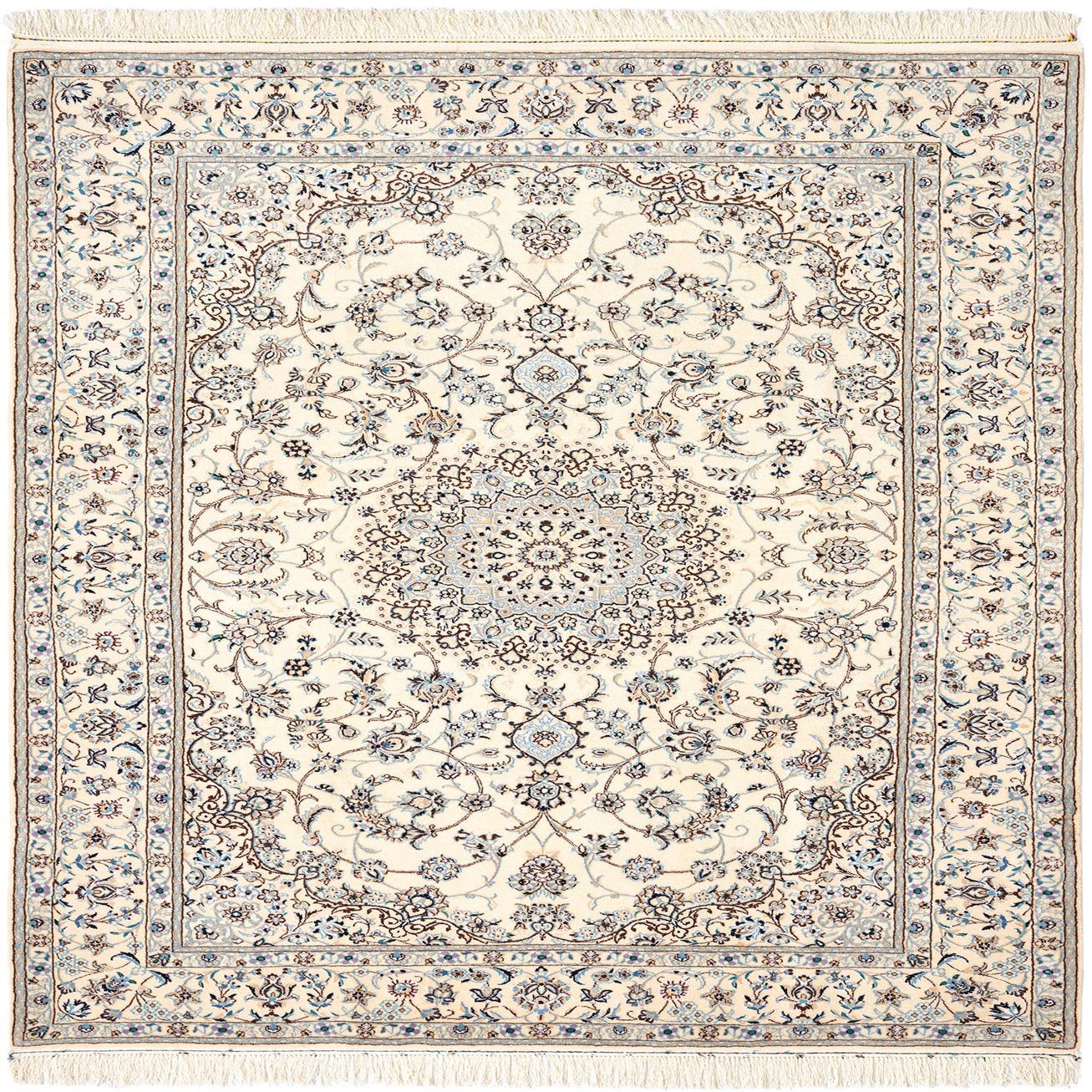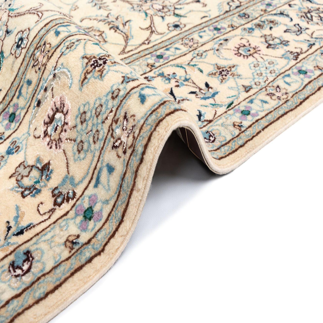 The Nain Collection presents a 5x8 hand-made wool and silk rug that exhibits timeless elegance. The piece features a cream background adorned with an intricately detailed pattern characterized by floral motifs and a medallion centerpiece, all rendered in soft yet defined hues. Symmetric borders with repeating patterns frame the central design, reinforcing the rug's classic aesthetic.