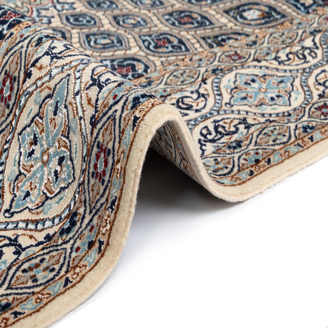 The rug's design features an intricate pattern with a symmetrical array of motifs and border details that showcase exceptional craftsmanship. The dominant cream background is complemented by an elegant palette that includes dark blue, beige, grey, brown, and red, providing both versatility and warmth to the overall design. The detailed patterns are a nod to classical Persian styles and give the rug a timeless appeal.