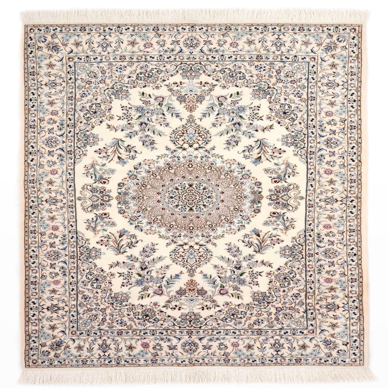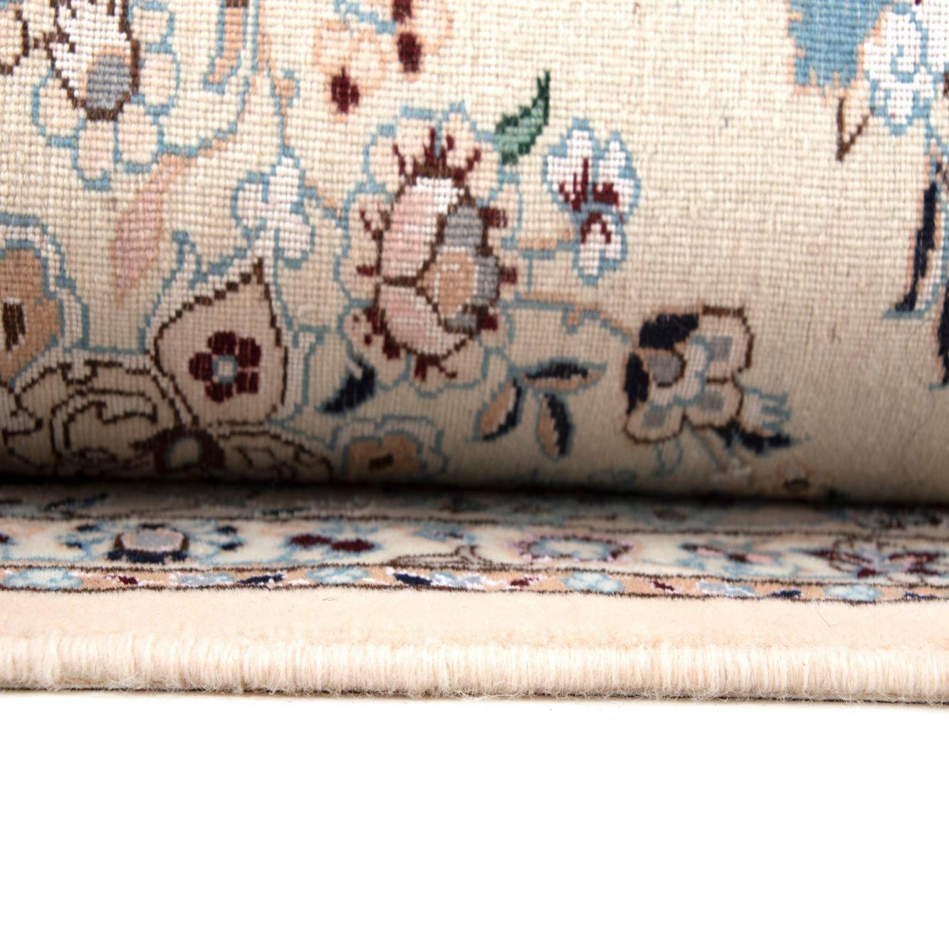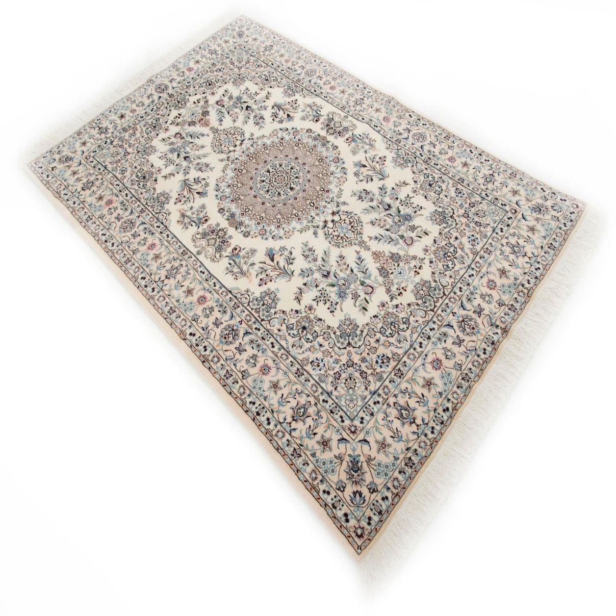 A 5x8 rectangular ivory Persian rug with a central medallion and intricate floral patterns in blue, grey, and pink.