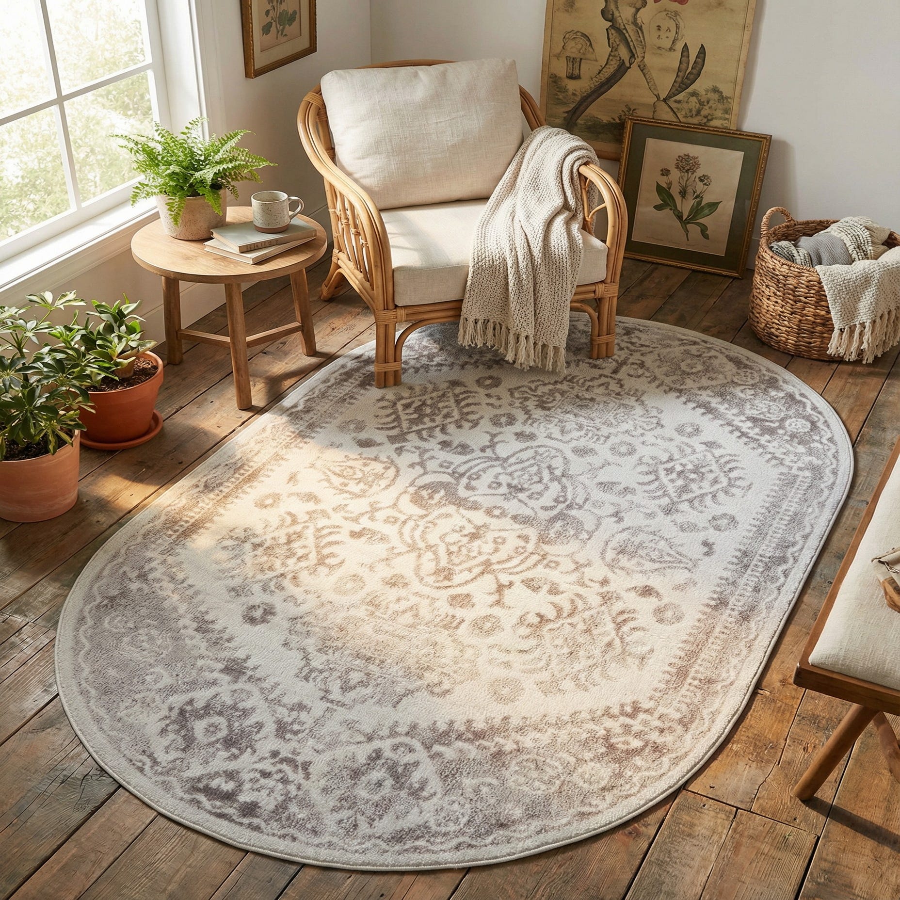 Machine made of 100% polypropylene, the rug has a low, dense pile with a velvety hand that feels smooth underfoot. Its neutral palette and classic pattern fit a range of interiors — place it in an entry or foyer to define the space, layer it beneath a small seating arrangement, or position it at the foot of the bed to add warmth and subtle pattern. It pairs well with warm woods and linen upholstery in transitional rooms, and it can temper cleaner, modern furnishings where you want pattern without strong color.