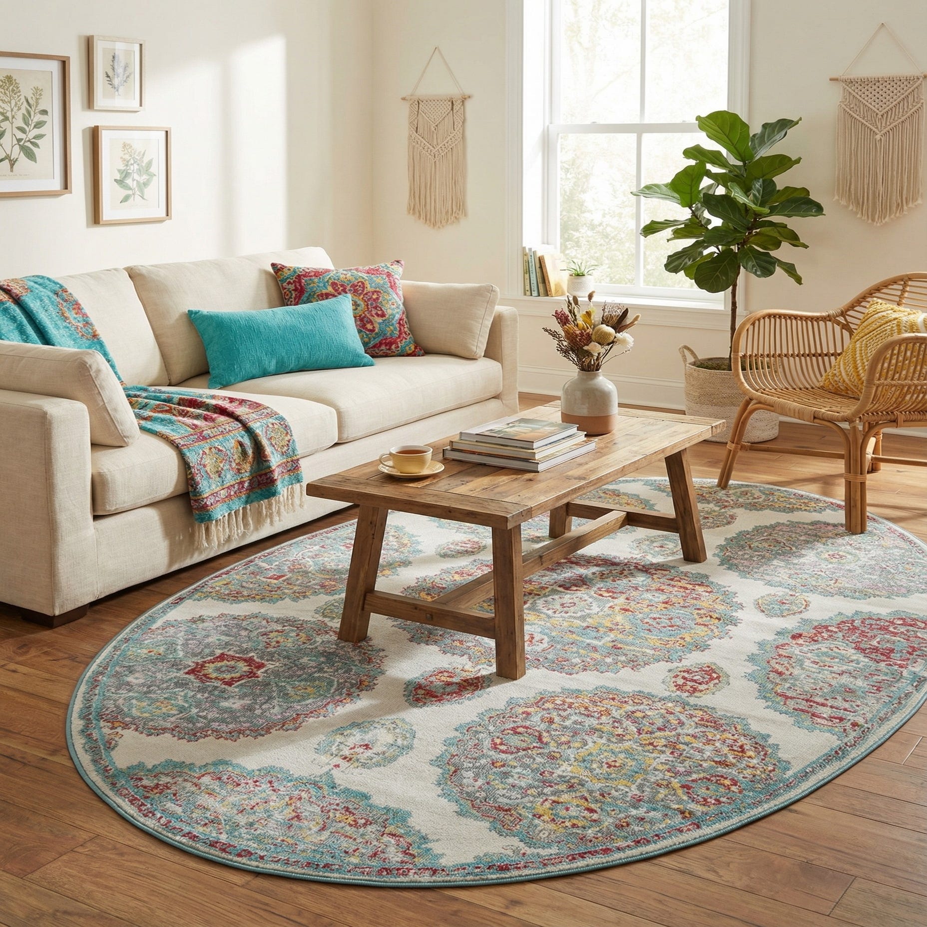 An oval ivory rug with a vibrant bohemian floral pattern in teal, red, yellow, and purple, featuring a thin pile.