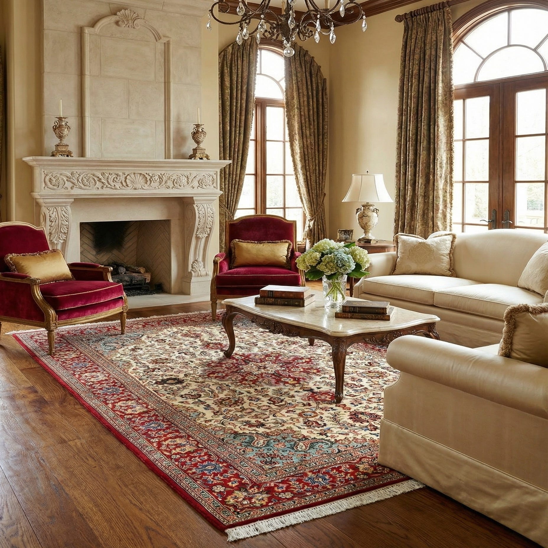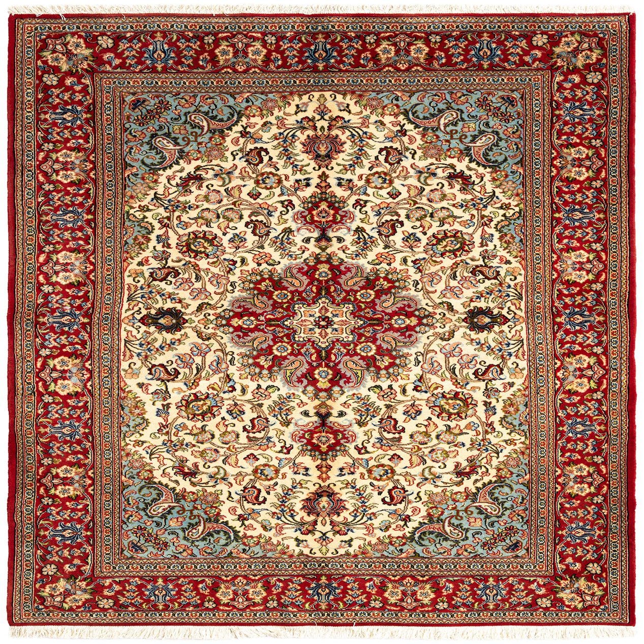 A 5x8 rectangular Persian rug with an ivory field, red border, and intricate floral and medallion patterns.