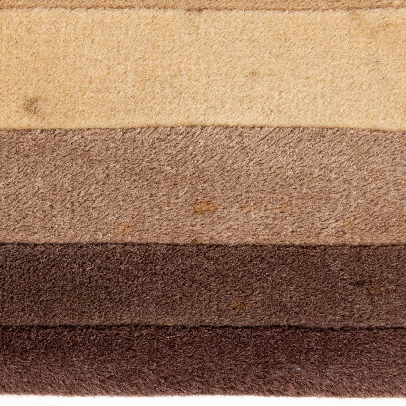 A rectangular 5x8 modern wool rug with an abstract pattern in shades of ivory, cream, brown, and blue.