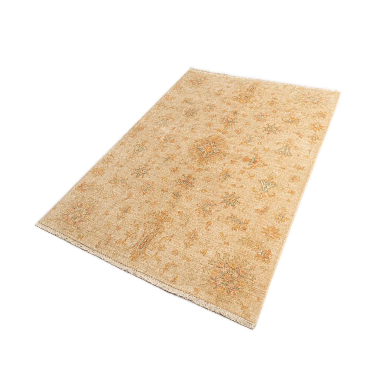 A 5x8 rectangular ivory Persian wool rug with a traditional floral pattern in muted gold and light blue, suitable for a living room.