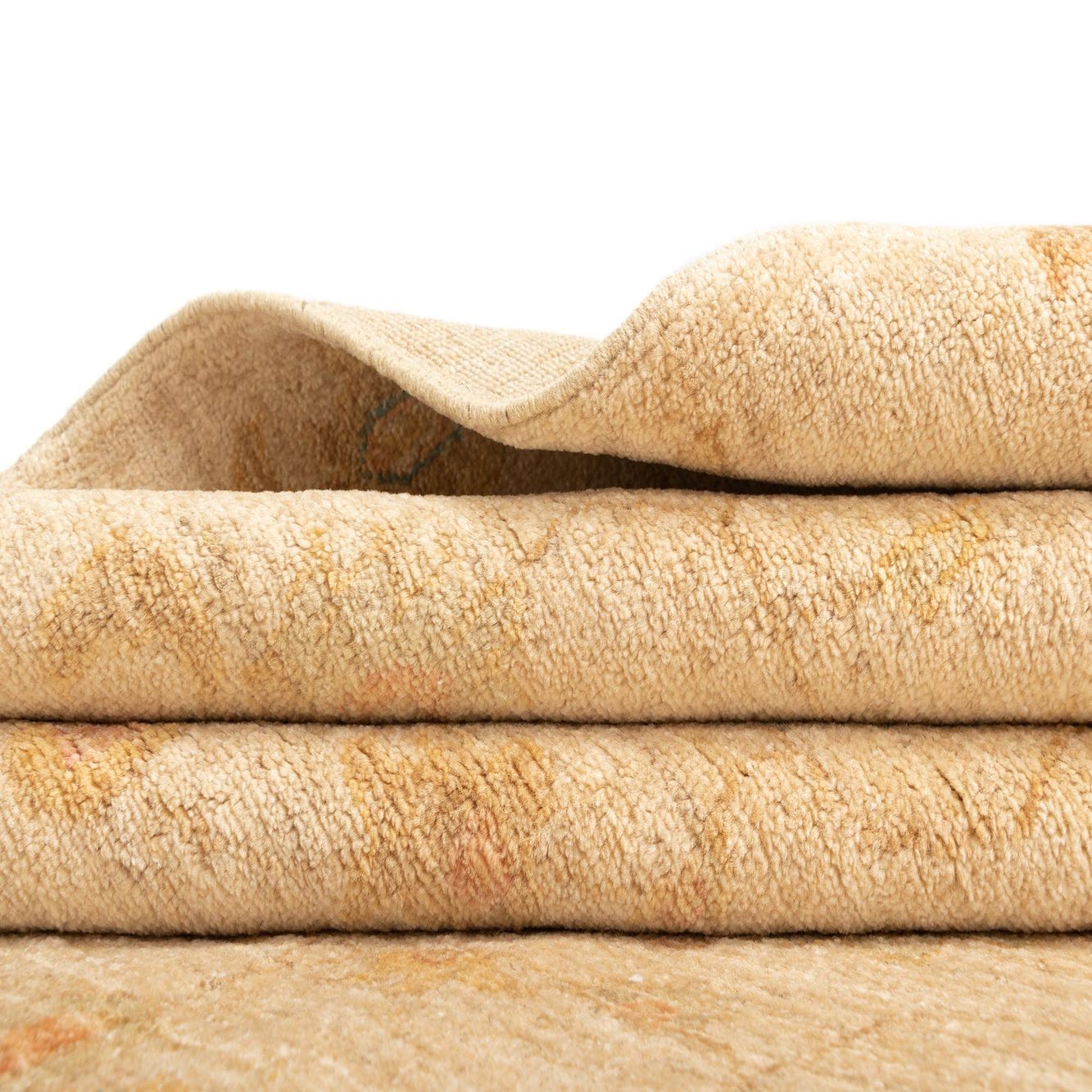A soft cream field is woven with an all-over arrangement of foliate motifs and medallion accents in light brown, muted orange and dusty blue. Hand made from 100% wool, the design has a gentle, vintage-inspired character—colors are softly blended and the pattern reads low-contrast and refined rather than bold. The wool surface is warm and tactile, with a subtle nap that adds depth and a comfortable underfoot feel.