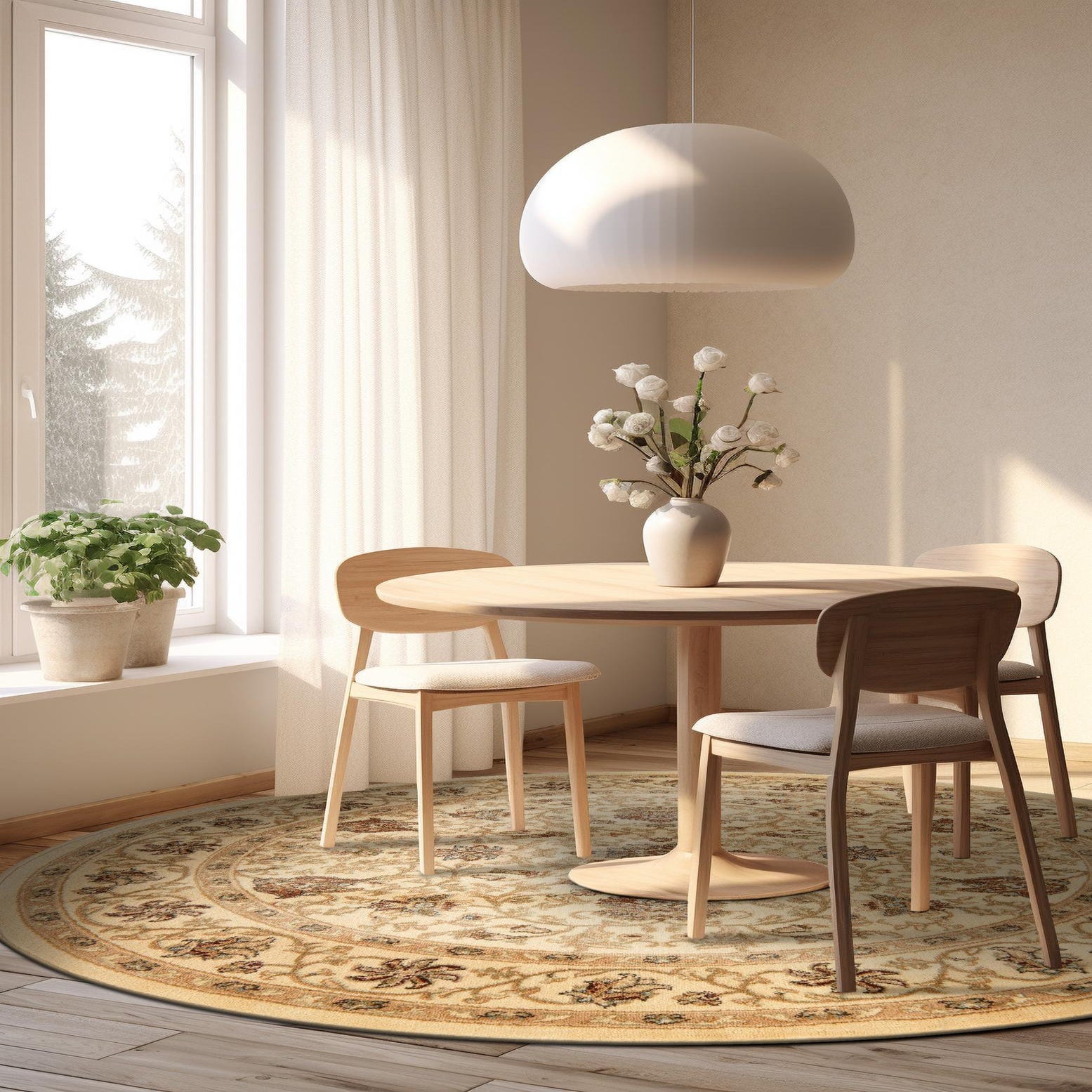 A soft cream field sets the stage for an elegant, traditional floral-and-vine pattern rendered in warm neutrals and gentle color accents. Scrolled vines and stylized blossoms form a circular medallion layout with a defined inner border and an outer floral guard—teal, light green, red, light blue, brown, and peach highlights are woven into the motifs, giving the design subtle depth and contrast against the cream background. Machine-made from 100% polypropylene, the rug has a low, even pile with a smooth hand and a slightly cushioned feel underfoot that holds the pattern clearly while remaining easy to position and layer.